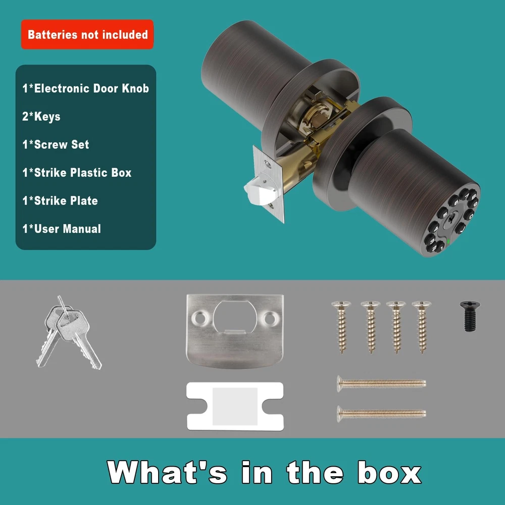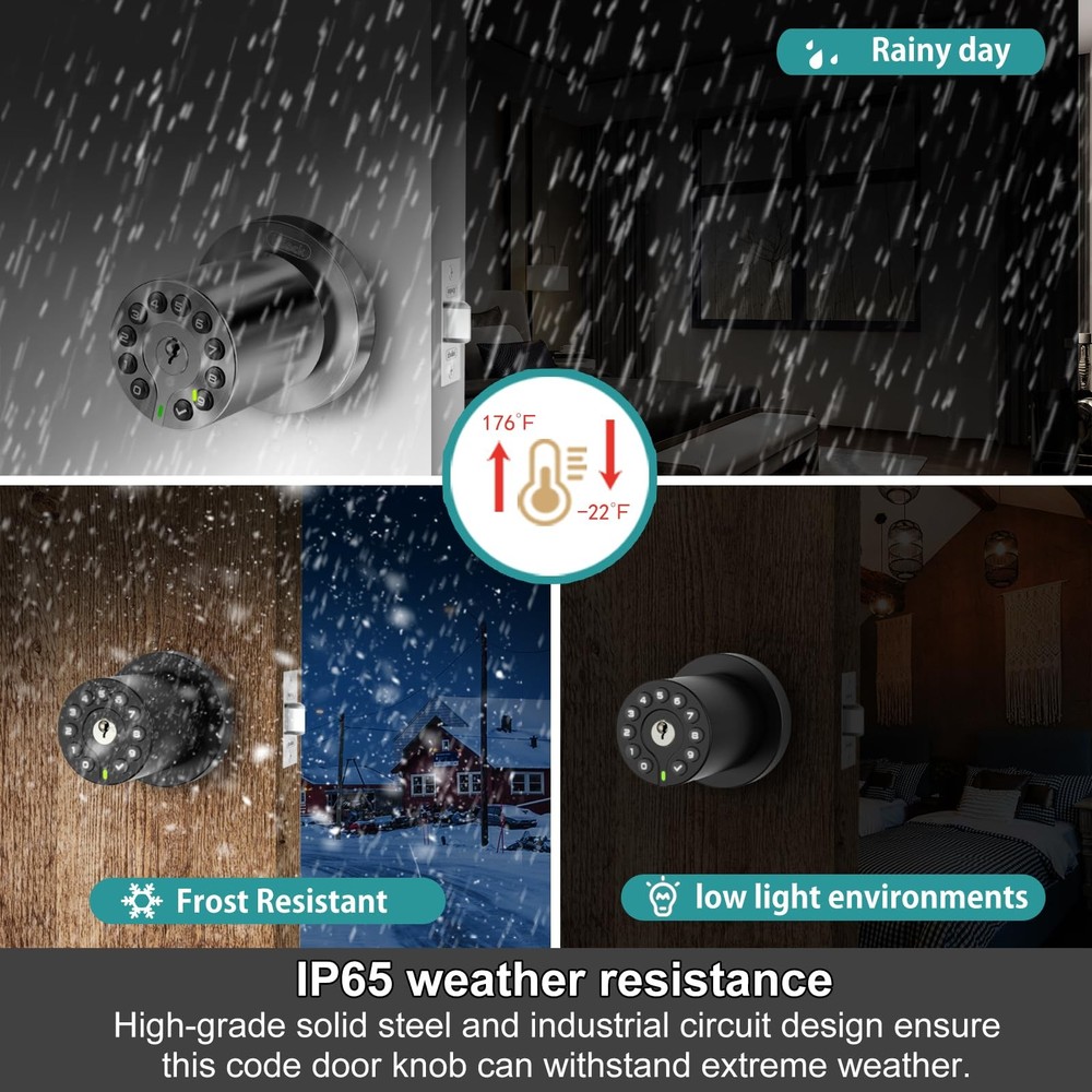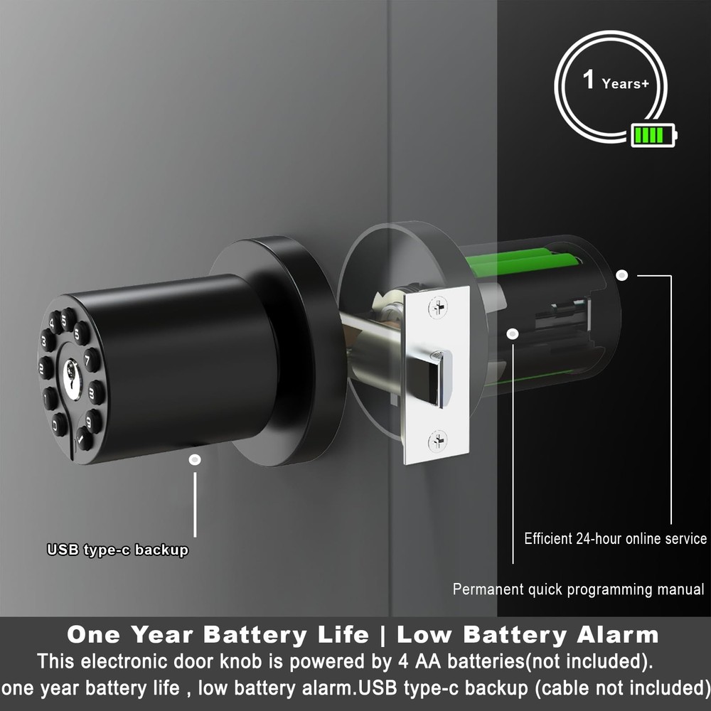 [CODE OR KEY]This electronic door knob offers ways to access,passcode or key,1 master code and 50 user codes. Access codes can be 1 - 15 digits in length. Ergonomic design can bring trendy style to exterior &interior doors. [SMART]This keyless entry door knobs lock with backlit keypad, so you can enter codes even in darkness. The visitor mode can be activated when many guests are visiting. Enable silent mode if you don’t want to disturb. low battery alarm. Use type-c USB backup in case that batteries run out. [STURDY]This keypad door knob adopts heavy-duty design, sturdy and durable. solid lock cylinder and premium metal construction. Auto-lock. Password disguise. Ideal for home, bedroom,office, hotel, garage, and apartment, etc. [SIMPLE]This password door handle set fits 1-3/8"(35mm) to 2-1/2" (65mm) thickness doors, with a 2-3/8"(60mm) or 2-3/4"(70mm) adjustable latch. Install it by yourself with just a screwdriver in minutes. Suitable for your bedroom , door entry or backdoor, etc. [DURABLE]IP65 weather resistance. Quality materials and industrial circuit design ensure this passcode lock reliable. They are awesome gifts for the people you love. Each door lock comes with long-term and efficient service.