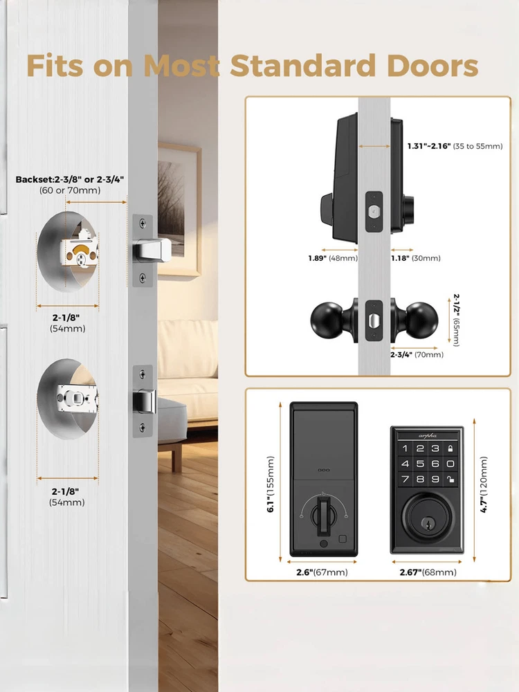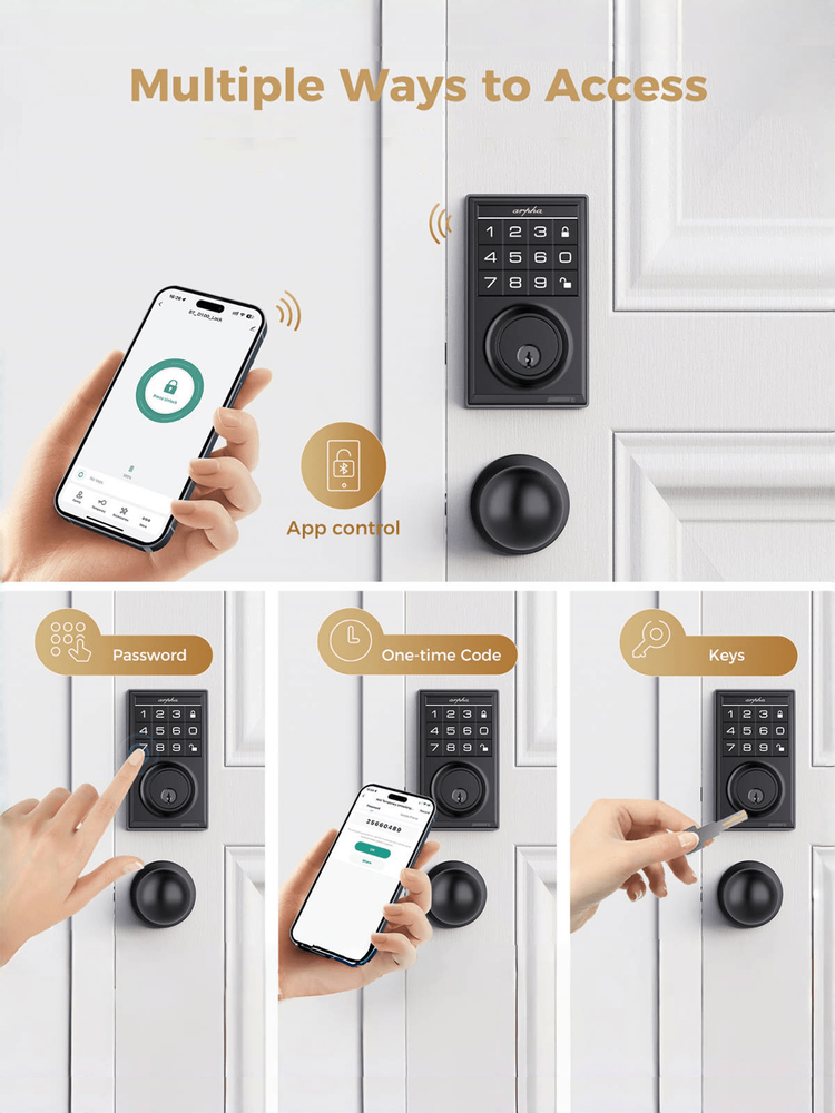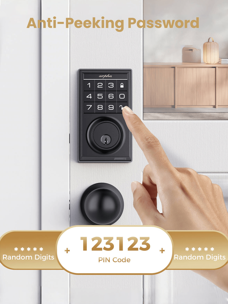 Keyless Entry Door Lock: Arpha smart door lock could be unlocked via App + Password + Mechanical key. Smart deadbolt supports 100 groups of access codes for the front door, including 97 users and 3 admin passcodes. Door lock with code are suitable for a variety of environments, including hotels, apartments, homes, offices, and stores. Auto-lock & One-touch Lock/Unlock: Experience the ultimate convenience with our digital door lock customizable auto lock feature - set to lock after 10 seconds by default, with an optional 10 seconds to 30 minutes delay. Plus, enjoy seamless control with one touch locking/unlocking, and whether you're coming home or leaving, our electronic door lock combines convenience and security that's always at your fingertips. Battery Powered & Type-C Emergency Port: Our deadbolt smart lock is powered by 4 AA batteries (not included), providing 3-4 months of continuous operation. It alerts with a low battery sound prompt when power is running low. Additionally, featuring a Type-C emergency power port, you can effortlessly recharge the smart deadbolt lock whenever needed, ensuring peace of mind even during power outages. Effortless Installation: Arpha smart door lock with handle can be easily installed in minutes with a screwdriver. Universally compatible, this door keypad locks seamlessly fits both left and right door orientations. The deadbolt lock accommodates door thicknesses ranging from 1-3/8" to 2-1/8" (35mm - 55mm). Color: Black Power Supply: Battery Powered(Others Battery) Batteries Included: No