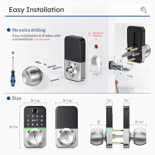 Return Policy Fast Delivery Trusted seller Keypad Smart Door Lock with Knob: Keyless Entry Door Lock for Front Door - Keypad Door Lock with Handle - Fingerprint Code Door Knob - Door Lock with Code - Auto Lock Product Description ?【Convenient Keyless Entry】: Enjoy seamless access with 5-IN-1 unlocking methods, including fingerprint, app, passcode, key fob, and mechanical key is included as a backup. 4-in-1 locking methods, including auto Lock, app Lock, long press the "√ "button to lock and key locking. Also support wifi remote control (additional gateway required) and Alexa voice commands(additional gateway required). ?【Easy Installation】: No extra drilling, with a simple screwdriver, you can replace your old smart deadbolt, door lever, or doorknob in just 10 minutes. Our versatile smart door knob design fits on both left and right-hand doors, ensuring a hassle-free installation process. ?【Easy To Use】: Our APP is easy to set up and manage, it offers advanced security features such as generating one-time or short-term passwords remotely, granting access permissions to others, auto-lock functionality. Rest assured, your property is fortified against unauthorized access, offering peace of mind at all times. ?【More Security】: The smart door knob is made of high hardness and corrosion resistant aluminium alloy material to ensure the security of your home and offers a upgraded backlit keypad, low battery alert, anti-peeping user code, and weather resistant (IP65) features. ?【Peace of Mind】Elevate your home security with the fingerprint door lock. Enjoy a of free app access, backed by a 30-day money-back , 1-year product warranty, and after-sales support from the date of purchase. Don't miss out on this irresistible deal that s your home security. Shipping Returns Payment Shipping Shipping is FREE to all addresses other than APO/PO boxes in the lower 48 states. All our stock ships from US-based warehouses. Shipped via USPS or UPS (depending on location and package weight) Unless stated otherwise, all orders will ship within 24-72 hours of your payment being processed. Check our feedback to see the great reviews of FAST shipping we offer. Returns Seller does not accept returns Payment We currently accept payment via eBay managed payments only. Once payment is cleared, we will dispatch your shipment within 1-3 business days. Please refer to the "Shipping" tab for more information regarding shipping speed to your destination.