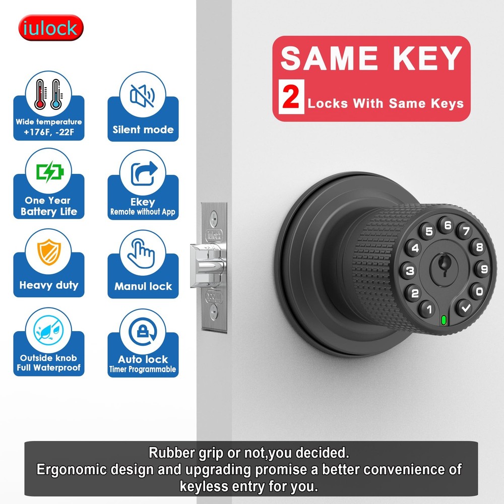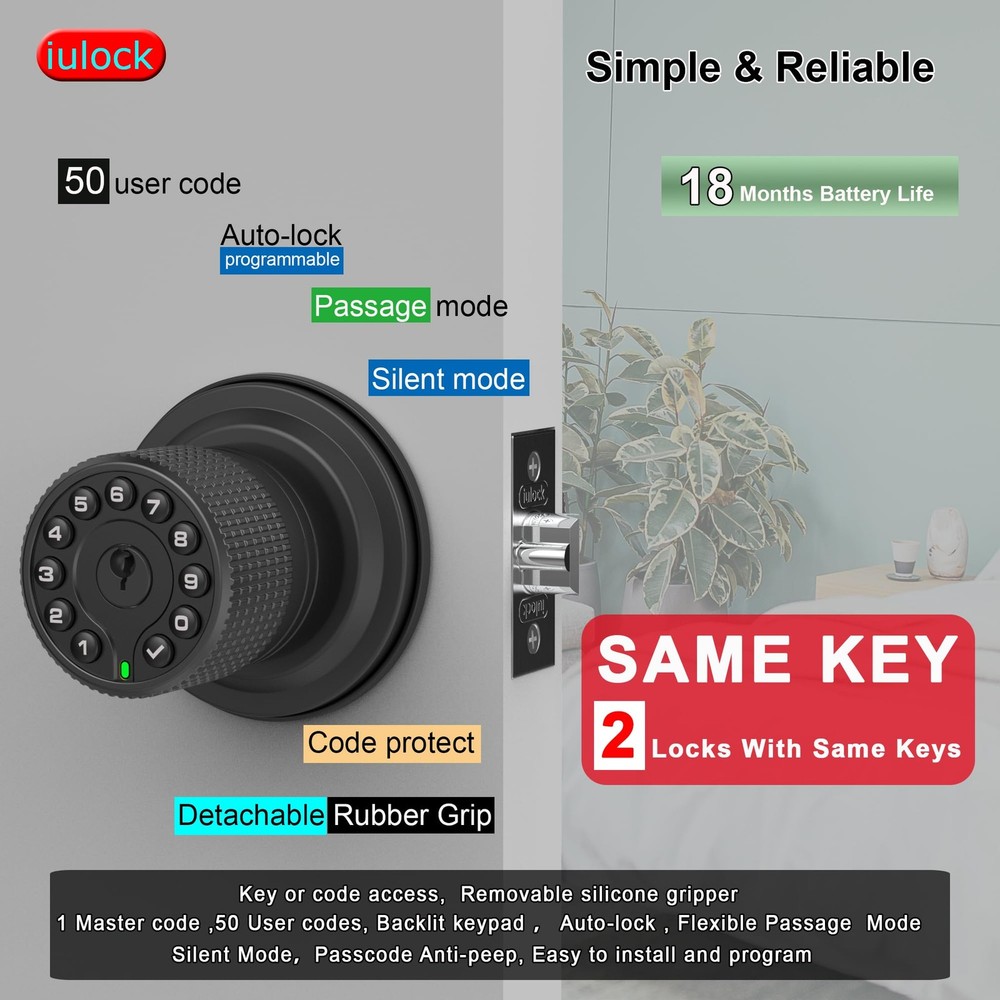 Material: Zinc alloy Package: 1* Electronic Door Knob lock 2* Keys (Compatible with KW1) 1* User Manual 1* Screw Set 1* Strike Plastic Box 1* Strike Plate 2* Rosette Rubber Seal (For protect the door) 2* Knob Rubber Grip ( For safety protection and increased grip) [Keyless Entry & Stylish]✅This keypad door knob lock assigns up to 50 customizable 1-15 digit codes for family or stuff to experience convenience. The knob has perfect size,come with detachable silicone grip,more snug on handle.Ergonomic design can bring trendy style to modern residential and commercial exterior & interior doors.,suitable for screen, wooden and metal doors,etc. [Premium Security & Durable]✅This electronic code door knob adopts heavy-duty design, sturdy and durable. Solid lock cylinder with 2 keys that are compatible with most mechanical keys. Premium metal construction, Plating Finish. It offers the best protection against burglary or break-in. Ideal for home, rental, office, hotel, garage, and apartment, etc.. [Feature-rich & Smart]✅The keypad of this door handle has clear numbers and soft backlight, so it can be operated day or night. You can activate passage mode when you don't want it locking. Enable silent mode if you don’t want to disturb. 4 AAA batteries can be used for 18 months,low battery alarm. Use type-c USB backup in case that batteries run out. [Fits most doors]✅This password doorknob fits 1-3/8" to 2-1/2" thickness doors, with a 2-3/8" or 2-3/4" adjustable latch. options rosette rubber seal suitable for more door, Install it by yourself with just a screwdriver in minutes. It is suitable for left or right-handed doors of your bedroom ,front door entry and backdoor, etc. [Reliable & Trusted Warranty]✅IP65 weather resistance. Quality materials and industrial circuit design ensure this door lock reliable. Can work in extreme environments (works great from -22F to 176F, rain and sun). They are awesome gifts for the people you love. Each door lock comes with one year warranty and 7X24 Efficient service.