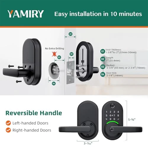 Batteries Included: No Manufacturer: Does Not Apply Model Name: YR01 gtin13: Does Not Apply Date First Available: May 24, 2023 MPN: Does Not Apply Brand: Does Not Apply Item model number: Does Not Apply Shape: Rectangular Item dimensions L x W x H: 5.5 x 2.95 x 0.79 inches Material: Stainless Steel, Zinc Color: Matte Black Item Width: 2.95 Item Length: 5.5 Batteries Required: Yes Lock Type: Deadbolt Item Height: 0.79 Recommended Uses For Product: Suitable for Indoors and Exterior doors UPC: 709226220161 Control Method: App, Remote, Touch, Voice Included Components: Mechanical key X2, Key Fob X2, Screw set X1 and Adjustable latch EAN: Does Not Apply Special Features: Regular Key, Fob Unlock, Passcode Unlock, App Control, Deadbolt l Item Package Quantity: 1 Part Number: Does Not Apply Batteries: Lithium Ion batteries required. Finish Type: Matt Number of Pieces: 1 Style: Modern Type: Does Not Apply Controller Type: Amazon Alexa, iOS, Android Product Dimensions: 5.5 x 2.95 x 0.79 inches Item Weight: 2.7 Pounds Finish: Matt Connectivity Protocol: Bluetooth, Wi-Fi Country of Origin: China Special Feature: Regular Key, Fob Unlock, Passcode Unlock, App Control, Deadbolt l