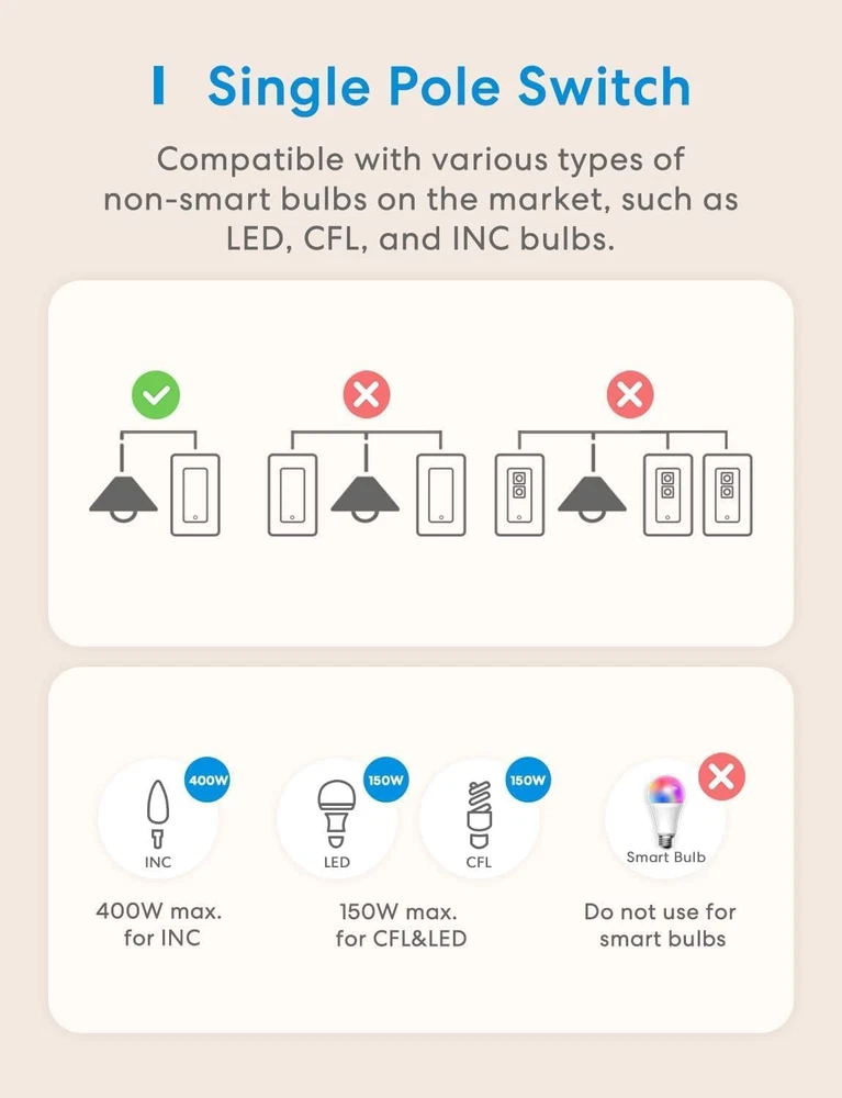 Neutral Wire Required: Please make sure your electric box has a neutral wire(in white color) before purchasing Smart Light Switch. If you are not sure, please take a photo of the inner part of your electric box and send it to us. We can check it for you timely.[NOT support 3 Way/ Dimmer.] Remote and Voice Control: Control your light from anywhere with internet anytime by WiFi light switch. ONLY supports Meross app. Compatible with Apple Homekit, Apple Watch, Siri, Alexa, Google Assistant and SmartThings. You can give simple voice commands to turn on/off the devices that are connected to meross WiFi switch. All data is securely transmitted and stored using AWS servers in US. Voice Control: Compatible with Apple HomeKit, Apple Watch, Siri, Carplay, Amazon Alexa, Google Assistant and SmartThings. You can give simple voice commands to turn on/off the devices that are connected to the smart light switch. Just say "Hey Siri, turn off the living room light." All data is securely transmitted and stored using AWS servers in the US. Easy to Install: Less than 15 min installation. Works in a single pole setup only(Not 3 Way). the smart switch fits for your existing 1/2/3/4 gang standard size Decora/GFCI faceplate. The smart switch works with 2.4GHz Wi-Fi only, does NOT support 5GHz Wi-Fi, and No hub required Schedule and Timer Setting: Meross light switch supports to auto turn on/off at specified times or according to Sunrise/Sunset. Never worry about lights being left on again. Save energy by turning off lights in areas like closets, bathrooms, garages, and basements when they're not in use or accidentally left on. Convert your regular bulbs into smart lights and manage home lighting effortlessly Product Description Control From Anywhere Know if your lights are on and adjust them, no matter if you're at home, at work, or vacationing Apple HomeKit Supported! Integrate your device easily into your Apple ecosystem for more convenient ways to control it Offline Control When the Internet is down, you can still control smart switch in Home Wi-Fi network via meross APP. 1 APP Control 2 Apple HomeKit 3 Offline Control Customize Your Schedule Transform regular bulbs into smart lights and control the lighting throughout your home with ease Fast Response Enjoy millisecond response and no drop-off with superfast local control when you're at home. Safety FCC/IC/ETL certified for safe use. 1 Timer & Schedule 2 Millisecond Local Control 3 Safety Customized Scenes Set up customized scenes to link your switch and other smart devices to match any occasion, such as saying good night to turn off all the devices. Sunrise/Sunset Schedule your smart switch to auto on/off at specified times. Create a lived-in look when you're away by randomly turning on lights. No Hub Required The Meross Smart switch for lights can be directly connected to your 2.4GHz WiFi network without a separate smart home hub. Single Pole Light Switch This smart switch is only used to replace a single pole switch rather than a 3 way switch. Manually Control-Turn on /off with a simple tap More Smart Devices from Meross Add to Cart Add to Cart Add to Cart Add to Cart Add to Cart Customer Reviews 4.4 out of 5 stars 789 4.3 out of 5 stars 3,490 4.3 out of 5 stars 3,490 4.1 out of 5 stars 1,610 4.0 out of 5 stars 667 4.3 out of 5 stars 185 — Price $49.99 $ 49 . 99 $65.99 $ 65 . 99 $20.99 $ 20 . 99 $49.99 $ 49 . 99 $29.99 $ 29 . 99 $35.99 $ 35 . 99 — Works with Apple HomeKit ✔ ✔ ✔ ✔ ✔ ✔ ✘ Works with Amazon Alexa ✔ ✔ ✔ ✔ ✔ ✔ ✔ Works with Google Assistant ✔ ✔ ✔ ✔ ✔ ✔ ✔ Offline Control ✔ ✔ ✔ ✔ ✔ ✔ ✔ No Hub Required ✔ ✔ ✔ ✔ ✔ ✔ ✔ Neutral Wire / Required Required / / Required Required Need Hub ✘ ✘ ✘ ✘ ✘ ✘ ✘