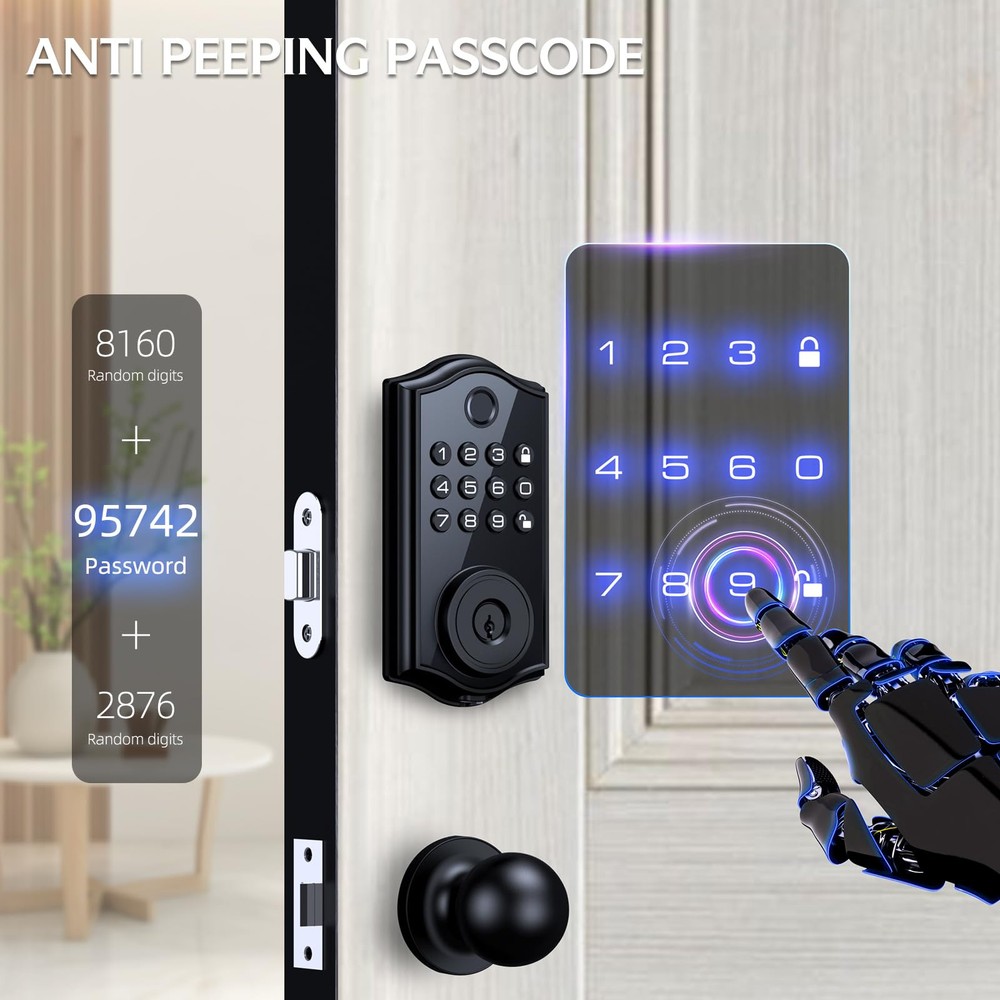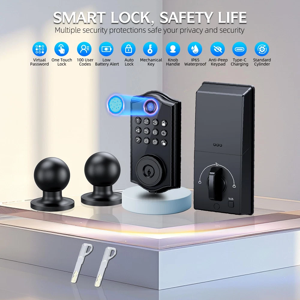 Advanced Fingerprint Recognition: Our state of the art fingerprint door lock can store up to 50 unique fingerprint codes and 50 digital codes, including three manager codes for heightened security. Unlock your door in just 1 second with seamless fingerprint identification. Plus, generate and share permanent, temporary, or one-time passwords remotely via the app for guests and babysitters Smart Security Features: Enhance your home security with an adjustable auto-lock feature that activates in 1 second to 30 minutes. Effortlessly lock the door using the exterior keypad with a simple “one-touch lock.”interior, easily lock and unlock with the knob in a split second—perfect for quick entries and exits Versatile Access Options: Experience the ultimate convenience with multiple access methods—fingerprint recognition, smartphone app, customizable codes, e-key sharing, or a traditional mechanical key. This smart lock is perfect for various settings, including homes, commercial,properties, apartments, offices, and hotels Hassle-Free Installation: Our smart lock installs quickly with just a screwdriver. Compatible with 1-3/8" to 2 (35mm to 50mm) thick doors, it's suitable for all standard American left and right-handed doors. The lock runs on 4 AA batteries for up to 12 months, features a low battery alert, and includes an external Type-C emergency power supply. Even when the batteries are depleted, your access codes remain stored securely, ensuring hassle-free entry. Durable Keypad Door Lock:Our smart lock for front doors comes complete with 2 knob handles and a user friendly keypad deadbolt featuring backlighting, adjustable volume, and a convenient vacation mode. Built to last, it boasts an IP65 weatherproof rating, effortlessly withstanding temperatures from -4°F to 122°F Touch & Go Fingerprint Lock:lock's fingerprint scanner boasts high security against spoofing, leveraging advanced biometric technology and a multi-layer security approach. It employs live data detection to effectively reject counterfeit prints made from materials like silicone or clay, ensuring robust protection against unauthorized access.Experience seamless usability with our lock's 360-degree fingerprint recognition capability, allowing for quick and effortless access from any angle. Security Anti-Peep Electronic Keypad:For added security and to prevent snooping, our system utilizes an anti-snooping password feature. This feature allows the user to add random numbers (up to 20 digits) before and after the password when entering the correct password.