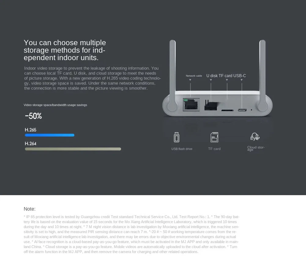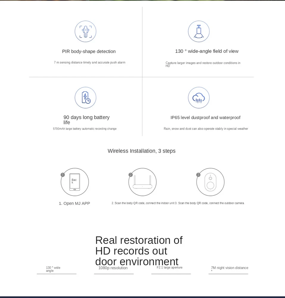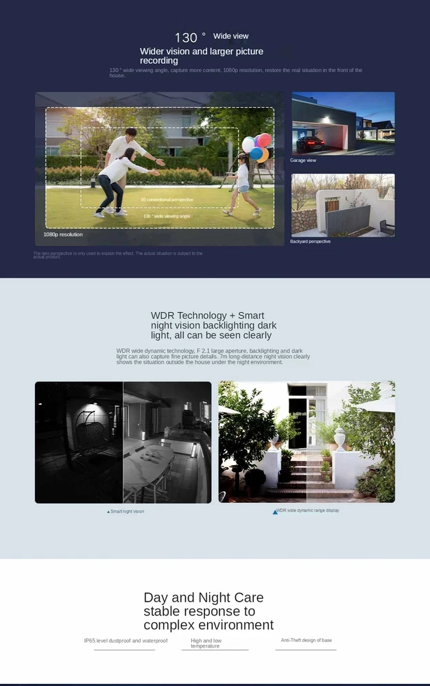 NOTE: 0.The correct camera angle,Camera angle,180°x130° 1·The original packaging:US plug= One Xiaomi xiaobai Camera US plug 2·video cameras, Instructions, is the Chinese version, Do not understand, please contact me,Or please see the details below, the steps 3·this camera is connected to the power use, can only be connected to use WIFI 4·Camera, in a relatively dark situation, will automatically switch to night mode 5. Camera only, no charger Outdoor Security Camera Features: 1.【IP65 Dustproof & Waterproof】 Supports cope with outdoor conditions 2.【Humanoid capture】 If someone breaks into the detection area, the camera will make a high-dB alarm sound and push the alarm notification to the Mi Home App immediately 3.【1080P FHD】 Built-in full HD lens module with resolution up to 1920 * 1080. It can record videos no matter day or night. 4.【Full-color Night Vision】 Supports capturing full color videos in low brightness environment. 5.【Real-time conversation】 Built-in speakers and microphone. Can talk to delivery man, guests, etc. Specifications: Brand: Xiaomi Brand Model: MWC10 Aperture: F2.1 Voltage: 220V (please confirm whether you can use the voltage or not in your country, thank you) Working Temperature: -20Deg.C - 50 Deg.C Video Coding: H.265 Wireless Connect: Wi-Fi IEEE 802.11 b/g/n 2.4GHz Wireless Connect: 1 * 10/100M Network Port Support OS: Android 6.0 or iOS 10 and above system