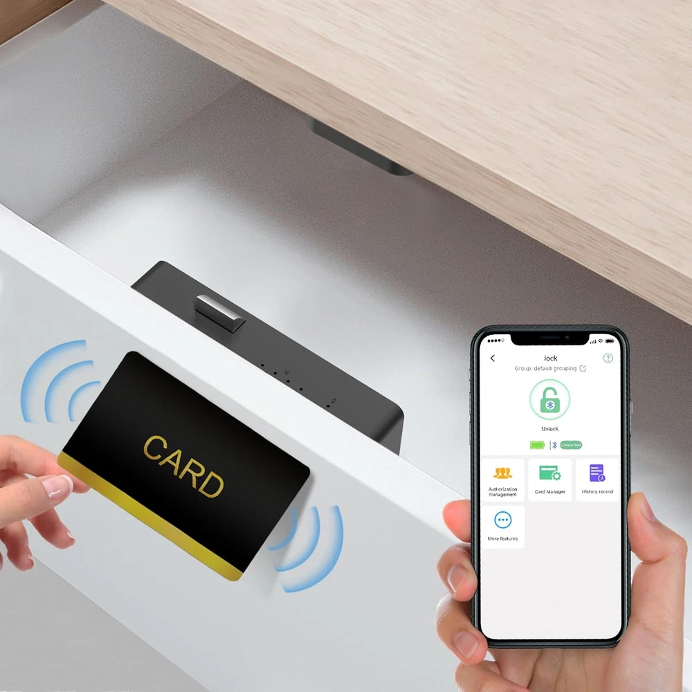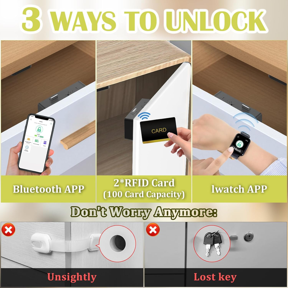 đăMulti-Access OptionsăSeamlessly unlock your cabinet with the app, RFID card, or via NFC and supports iwatch unlock for ultimate convenience, eliminating the need for keys and passwords. đăFlexible Installation MethodsăChoose between stick-on or screw installation with high-viscosity double-sided tape provided, ensuring a secure and stable fit for various furniture types.No more worry about the thickness or diameter! đăDiscreet InstallationăAdopting an invisible installation method, this lock preserves the original appearance of your furniture without drilling or disassembly, enhancing its aesthetics. đăRobust Security FeaturesăCrafted from high-quality materials, this lock boasts anti-prying and anti-vandalism features, ensuring maximum security to safeguard your belongings and privacy. đăReliable Customer SupportăEnjoy a hassle-free experience with a 6-month warranty, lifetime technical support, and responsive customer service for any inquiries or assistance.âĄPlease contact us for a free replacement if the lock you received does not work! Product Description 1 Adult& Baby Proofing 2 No Power?No Worries! 3 Keys Alike 4 Multifunctional APP Applicable to Double Door Cabinets Comes with double-door cabinet accessories to better meet your needs! No Additional Tools Needed! Complete accessories, simple installation. Installation positioning stickers included for better installation. Newest Upgrade-with Battery Indicator **** : 75-100% *** : 50-75% ** : 25-50% * : 0-25% APP shows the battery level. NFC Unlock and iWatch Unlock Your iWatch and mobile phone can unlock, if they have the NFC. Kitchen Pantry Drawer Liquor Cabinet Living Room Storage Cabinet Cupboard Bedroom Dresser Drawer Wardrobe Double Door Cabinet Double Door Accessories Concealment Furniture Hidden Cabinet Lock Hot-sale Cabinet Lock RFID Cards Unlock Bluetooth APP Unlock Fingerprint Unlock Passcode Unlock No Drilling No Drilling&wiring! 4 Colors Color Black, Silver RFID Cards Unlock Bluetooth APP Unlock Fingerprint Unlock Passcode Unlock No Drilling Yes 4 Colors Color Black, Silver RFID Cards Unlock Bluetooth APP Unlock Fingerprint Unlock Passcode Unlock No Drilling Yes 4 Colors Color Black, Silver RFID Cards Unlock Bluetooth APP Unlock Fingerprint Unlock Passcode Unlock No Drilling No 4 Colors Color White Smart Cabinet Lock-NEW Smart Cabinet Lock-Vert. Smart Cabinet Lock-Horiz. Hidden Cabinet Lock-New