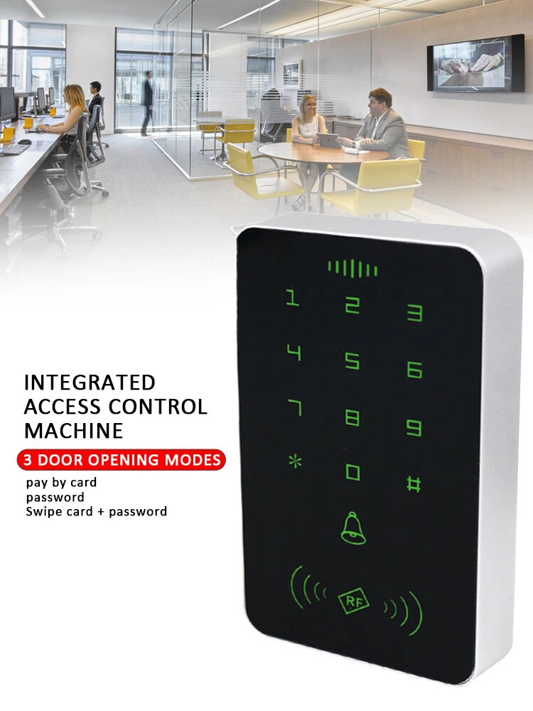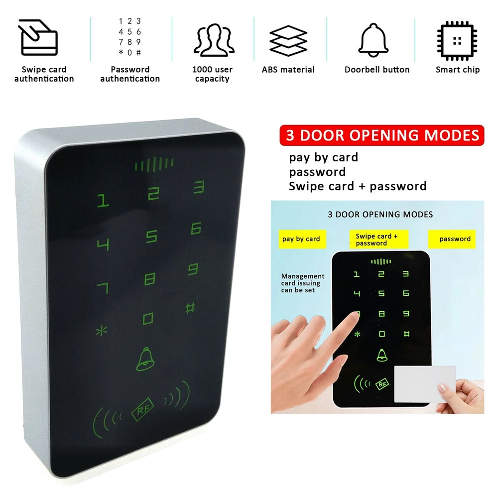 RFID card keypad reader is a widely used access control system entrances and exits at offices, factories, hotels, schools and other public places...etc. All input/output uses anti-jamming protection and over-voltage/circuit protection. NOTE: Doesn't need to connect on the computer, it can work alone. It supports EM only, not support other encrypted cards such as HID, Cobra, APCiK..etc. Power supply is not included Features: Contactless RFID transponder technology with power off data protection function Support offline work and full programming from the keypad Support card, password, card+password to open door Standalone reader, add or delete user cards via keypad Support the switch for opening the door Elegant appearance, clear numbers, convient to use Specifications: Voltage: DC 12V Current: <100mA User capacity: 1000 users Frequency: 125KHz Support: Card, PIN, card + PIN Valid password: General 1 set Card type: EM External reader: Not support Distance: 1 to 5cm Size: 117 x 75 x 20mm (4.6 x 2.95 x 0.79 inch) Weight: 106g (3.74oz) Packing List (bulk pack): 1 x RFID card reader keypad