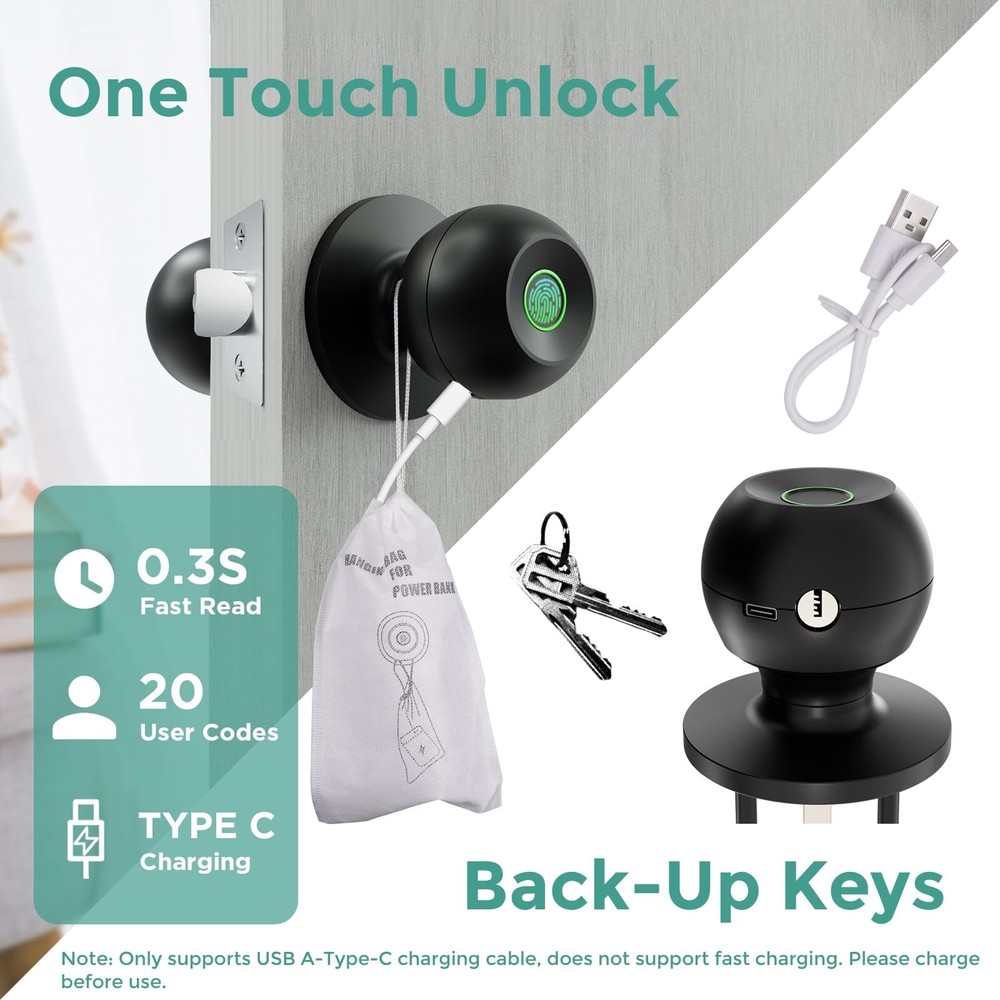 Description Features: 3 in 1 Unlock WaysThe smart door knob has 3 unlock ways, such as fingerprint unlock, App control, emergency back-up keys, is a perfect fingerprint door lock to get keyless entry door lock. Rechargeable & Emergency UnlockThe bluetooth lock no need to purchase batteries repeatedly, you can use Type-C charge the smart door lock to unlock When the batteries is out of power. One year product warranty from the date of purchase and lifetime customer support. Please feel free to contact us if you have any problem. (Note: Only supports USB A-Type-C charging cable, does not support fast charging. Please charge before use.) Smarter, Convenient & SecurerThe fingerprint door handle door lock support App control, which can easily get fingerprint manage. With bluetooth, you can unlock with your phone. You can check operate records, auto lock, passage mode, privacy mode, help you creat a smarter and much convenient life, keeps your home secure. Classic upgrade designThe Smart door handle continues the classical door knob design, but it adds fingerprint lock function and modern app control. It is a very ideal fingerprint door knob smart lock for bedroom door, office, apartments, hotels, garages. Easy to InstallThe fingerprint door knob can be easily installed with a screwdriver within minutes. The biometric door lock fits most US door, easily replace with existing door locks. We offer detail installations steps and videos for you. Product Details: Brand: DINSTECH Special Feature: Portable, Fingerprint, Rechargeable, Auto-Lock Lock Type: Biometric Item dimensions L x W x H: 7.28 x 2.75 x 2.75 inches Material: Aluminum Brand: DINSTECH Special Feature: Portable, Fingerprint, Rechargeable, Auto-Lock Lock Type: Biometric Item dimensions L x W x H: 7.28 x 2.75 x 2.75 inches Material: Aluminum Style: Modern Color: Black Number of Pieces: 1 Controller Type: Hand Control, Mechanical knob Shape: Round Control Method: Touch Connectivity Protocol: Bluetooth Manufacturer: ZhongShanFuYu Intelligent Lock Manufacture Co., Ltd Item Weight: 1.63 pounds Product Dimensions: 7.28 x 2.75 x 2.75 inches Country of Origin: China Item model number: ed37eb7b-6b55-47d3-b182-5e1797b34fab Batteries: 1 Lithium Ion batteries required. (included) Special Features: Portable, Fingerprint, Rechargeable, Auto-Lock Batteries Included?: Yes Batteries Required?: Yes Battery Cell Type: Lithium Ion Date First Available: September 30, 2023 Handling We will ship all orders within 3 business day of payment. Delivery We Do Not Ship Outside of the Continental US. Return Policy All items qualify for returns within 30 days of receipt. Buyer is responsible for return shipping on any item that is not damaged. Feedback We take our reputation seriously, we buy and sell online, so we understand the value of trust. If you are unsatisfied with your order, please contact us and we will work with you to resolve it to your satisfaction.