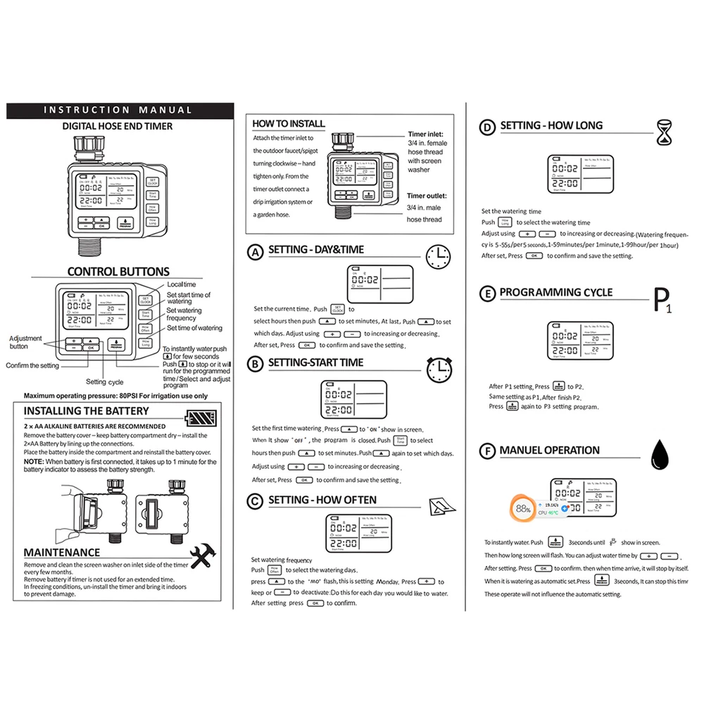 Description If you are a person who loves to keep flowers but is busy with work, then you may need a water timer to take care of your beloved plants. This water timer is an ideal choice for you. It intelligently controls the watering time and period, so your plants can drink water regularly. Moreover, it is made of waterproof and durable ABS, which can last for a long time. So hurry up and bring home such an efficient and smart water timer! Key Features Timed Irrigation: The water timer can set the watering time and can water the plants at the set time. You do not have to worry about being too busy to take care of your plants. Settable Time Length: The timer allows you to set the length of each watering from 5-55 seconds, 1-59 minutes and 1-99 hours. You can set the right length accordin Smart Sprinkler Timer Outdoor Irrigation Water Garden Rain Sensor Programmable Programmable Digital Water Timer Outdoor Automatic Garden Yard Irrigation Description If you are a person who loves to keep flowers but is busy with work, then you may need a water timer to take care of your beloved plants. This water timer is an ideal choice for you. It intelligently controls the watering time and period, so your plants can drink water regularly. Moreover, it is made of waterproof and durable ABS, which can last for a long time. So hurry up and bring home such an efficient and smart water timer! Key Features Timed Irrigation: The water timer can set the watering time and can water the plants at the set time. You do not have to worry about being too busy to take care of your plants. Settable Time Length: The timer allows you to set the length of each watering from 5-55 seconds, 1-59 minutes and 1-99 hours. You can set the right length according to your plant habit. Highly Waterproof: This water timer has a waterproof rating of IPX4, so you can install it outdoors with confidence. Moreover, it comes with a removable waterproof case that can further protect against water to extend its life. Easy to Operate: The intelligent control system and LCD is friendly to most age groups to operate, very simple and convenient. Easy to Install: This water timer is easy to install with its threaded interfaces. You just need to connect the inlet to the applicable faucet and connect the watering hose to the outlet, then it can be used. Great Durability: This water timer is made of high-quality ABS, which is very sturdy enough to be used for a long time. Time and Energy Saving: With this automatic irrigator, you won't have to water your plants regularly and laboriously or forget to water them. It can save you a lot of time and effort. Good Sealing: The threaded knobs have good sealing and can be tightly attached to the faucet without water leaking. Guaranteed Customer Service: Your satisfaction is our top priority, we will make things right for you. If you are unsatisfied with our products, you can contact us and we will ensure you have a pleasant shopping experience in our store. Details LCD Display: The high-definition display clearly shows details of the programms, operation and power levels for you to operate easily. Rubber Buttons : The rubber buttons are not only smart to control the timer but also comfortable to press. 3/4" Threaded Connector: The connectors of this water timer are all 3/4" threaded connectors, which can be directly connected to the corresponding model of faucet. Application This water timer is suitable for gardens, botanical gardens, plant walls, farms, fields, florists, flower houses, plant rooks, etc. Specification Material: ABS Color: Black Waterproof Level: IPX4 Applicable Model:3/4" Faucet Batteries: 2 x AA Batteries (Not Included) Maximum Temperature: 0-50℃ Working Pressure: 3-8Bar Irrigation Medium: Clear Water Frequency: 1-59 Minutes, 1-23 Hours and 1-7 Days Irrigation Time Length: 5-55 Seconds, 1-59 Minutes and 1-99 Hours Package Size: 11.5*15.5*6cm/4.5*6.1*2.4inch Gross Weight: 0.28kg/0.62bs Net Weight: 0.25kg/0.44lbs How to Use +/- BUTTONS: Use these buttons to adjust the time and system settings. SELECT TIME UNITS: Hour/minute/second time unit conversion. OK BUTTONS: Programme confirmation button. MANUAL WATERING: Press and hold for 3 seconds to start manual irrigation. CURRENT TIME: Current time setting (24-hour system). START TIME: Select when you want to water. HOW LONG: Determine how long watering is required. HOW OFTEN: Choose how often to water. NEXT TIME: Automatically prompted. START TIME: Select the time you want to water. Package Included 1 x Water Timer 1 x Connecting Piece Note This product does not include batteries, please purchase two AA batteries by yourself. Please allow the slight color difference caused by the shooting light and 1-3 cm error due to manual measurement, and make sure you do not mind before ordering Payment Delivery details Terms of sales About us Contact us Payment We accept ebay payment 。 Fees such as import duties, taxes are not included in the item price or shipping costs. These charges are the buyer's responsibility. Delivery details Shipping: 2-9 working days to: USA Terms of sales We maintain high standards of excellence and strive for hundred percent customer satisfaction. Feedback is very important to us. We hope that you contact us immediately before you give neutral or negative feedback, so that we can address your concerns. It is impossible to address issues if we do not know about them! About us Your satis faction is our ultimate goal. We work hard to earn your trust and future business. Our certified technicians have tested each item before shipping. The unit comes with 1 year limited warranty on all manufacturing defects. a) If you receive a defective item, you may return it or ask for a discount. Please contact us within 14 days after you receive the package. b) What you returned must be intact and in its original packaging as re? u. Customer is responsible for shipping costs of the returned item. c) We will cover the cost of shipping back 