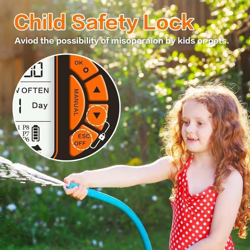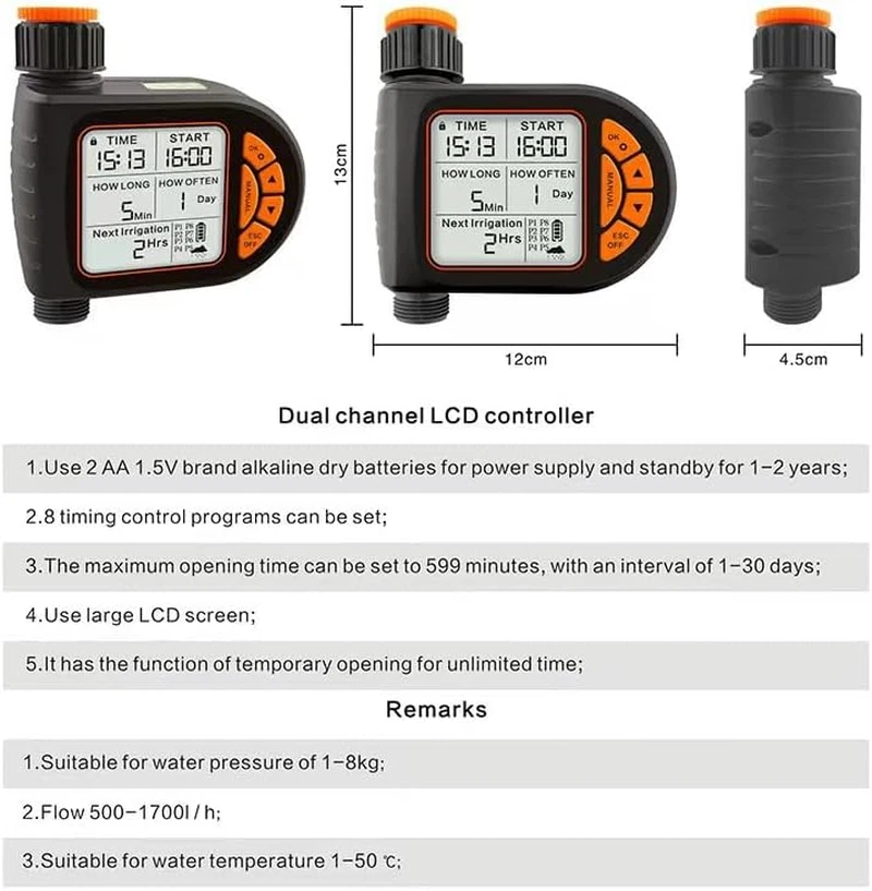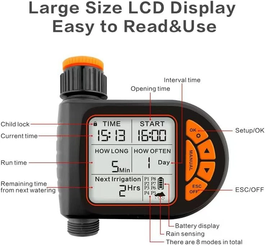 🌿 Smart Irrigation System with 8 Custom Programs – Effortlessly control your garden with dial-and-button settings for daily/weekly schedules (1 min to 7 days), duration (1 min-12h), and auto/off modes. Perfect for "automatic garden watering timer" users seeking precision. ⏱️ Hybrid Auto + Manual Flexibility – Works seamlessly in "hose timer automatic" mode while you’re away, or use instant manual watering (1min-12h) without disrupting programmed schedules. Compatible with 3/4" hoses (1-8kg water pressure). 🌦️ Weather-Adaptive Water Conservation – "Smart Rain Delay Timer" leverages real-time forecasts to skip unnecessary watering, saving 30%+ monthly water costs. Ideal for "water-saving sprinkler timer" enthusiasts. 🛡️ IPX5 Weatherproof & Child-Safe Design – Built with "outdoor waterproof hose timer" durability, heat-resistant materials, and anti-leak seals. Child Lock secures settings from pets—powered by 2xAA batteries (6+ months). 😊 XL LCD Screen + Low-Energy Protection – Ultra-clear display for easy reading, paired with battery safeguards to prevent water waste during outages. Optimized for "heavy-duty garden irrigation timer" reliability. WiFi Water Timer with Brass Inlet, 1 Zone Smart Hose Timer, Sprinkler Timer for Garden Faucet, APP Remote Control Via 2.4Ghz WiFi,