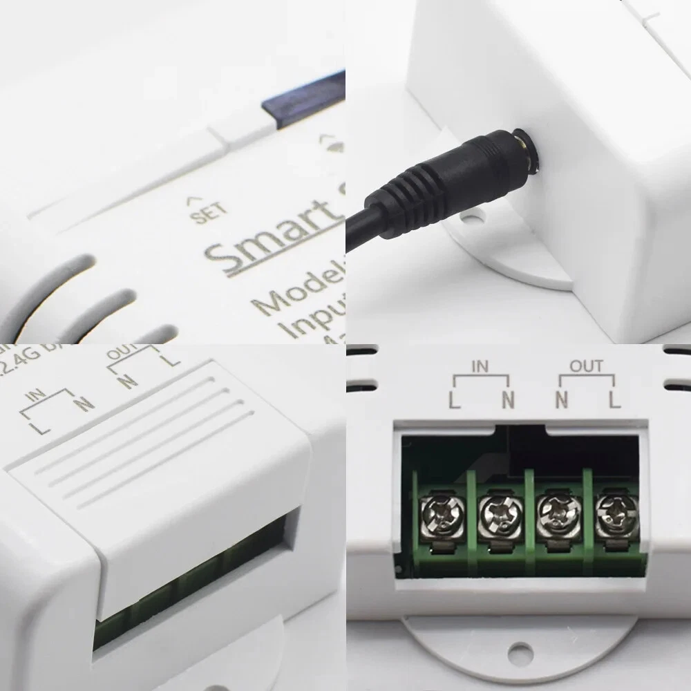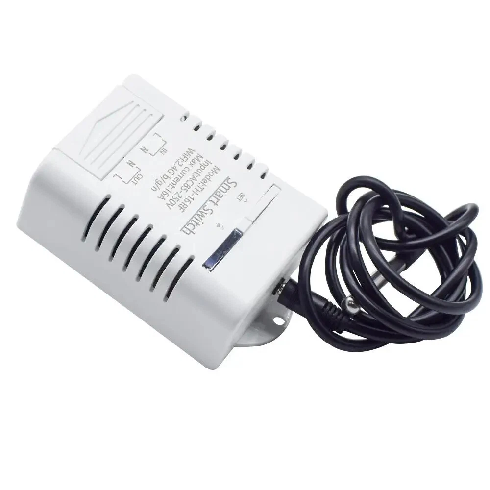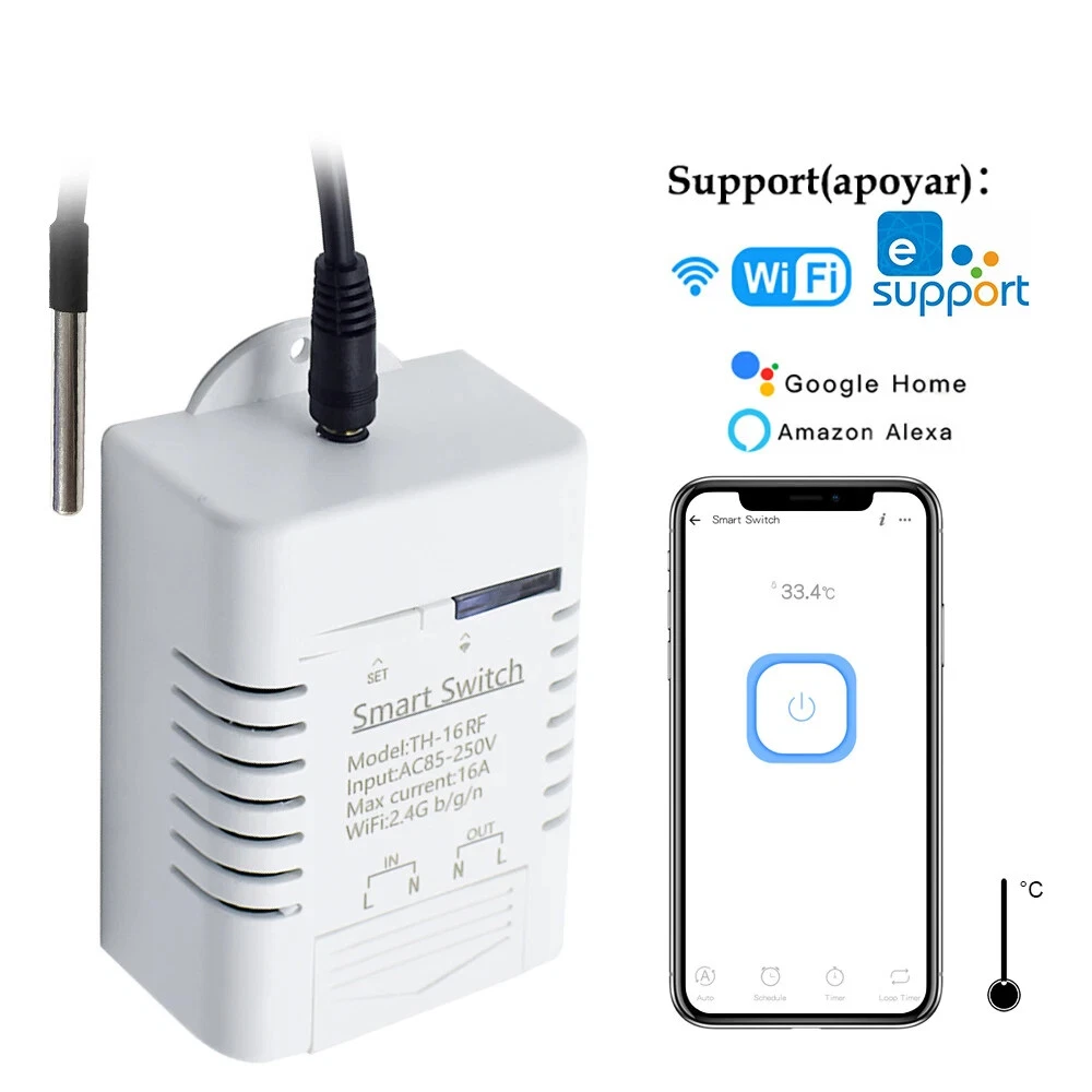 Smart TH16 Switch 16A Temperature And Humidity Monitoring WiFi Switch Wireless Control Compatible With Alexa Home Description: Working voltage: 85-250V Indicator: With a signal indicator, relay pull the ligh Supports to control different voltage ranges USB port power supply more convenient Board consumption: <1W Standby current: 80mA Standby power: <0.5W Input current: ≤16A; Wattage: ≤3500W Relay lifespan: ≥1000000 times Electrical insulation resistance: 100M Electric shock voltage: 1000V Relay maximum suction time: 15ms Relay maximum release time: 5ms Working mode: inching /self-locking, Interlock Transmission mode: -Fi communication Wireless Standard: 2.4GHz, 802.11 b/g/n Mobile App: on Android/IOS Applicable occasions: smart home. Wifi control Control distance: infinit Enclosure Material: Fire-retardant ABS Operating temperature: -40 degrees to +70 degrees Operating Humidity 40% ~ 80% RH Specifications: This wireless switch is a low-cost, affordable device with fool type wifi control module, no programming, only need to download an APP and link WIFI then can control the own cloud. As long as the module links WIFI, the connected appliance of different types and brands can be controlled via phone APP from anywhere anytime in the world. It integrates with a 433MHz RF receiver module, so the WIFI switch can be controlled by RF Remote indoors. Meanwhile, by setting timing schedules your appliances and sharing control your smart home together with your family, you can maintain an carefree life. Features: *Supports WiFi network. Supports numerous WiFi smart switches on smart phone. *Supports status tracking: device status timely provided to the . *Supports remotely turn on or off connected appliances, for example light, electric kettle, electric rice cooker, electric , etc. *Supports max 8 enabled scheduled/countdown/ timers for each device. *Voice Control: Compatible perfectly with "Amazon" Alexa, for Home/Nest, IFTTT. *RF Function: Supports controlled by 433MHz RF Remote Controller. *Share Control: Control your smart home together with your family. Package Included: 1* Thermostat 1*User Manual
