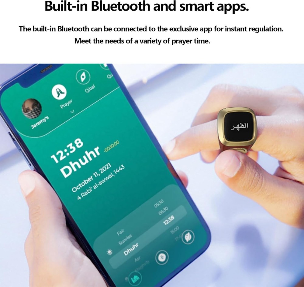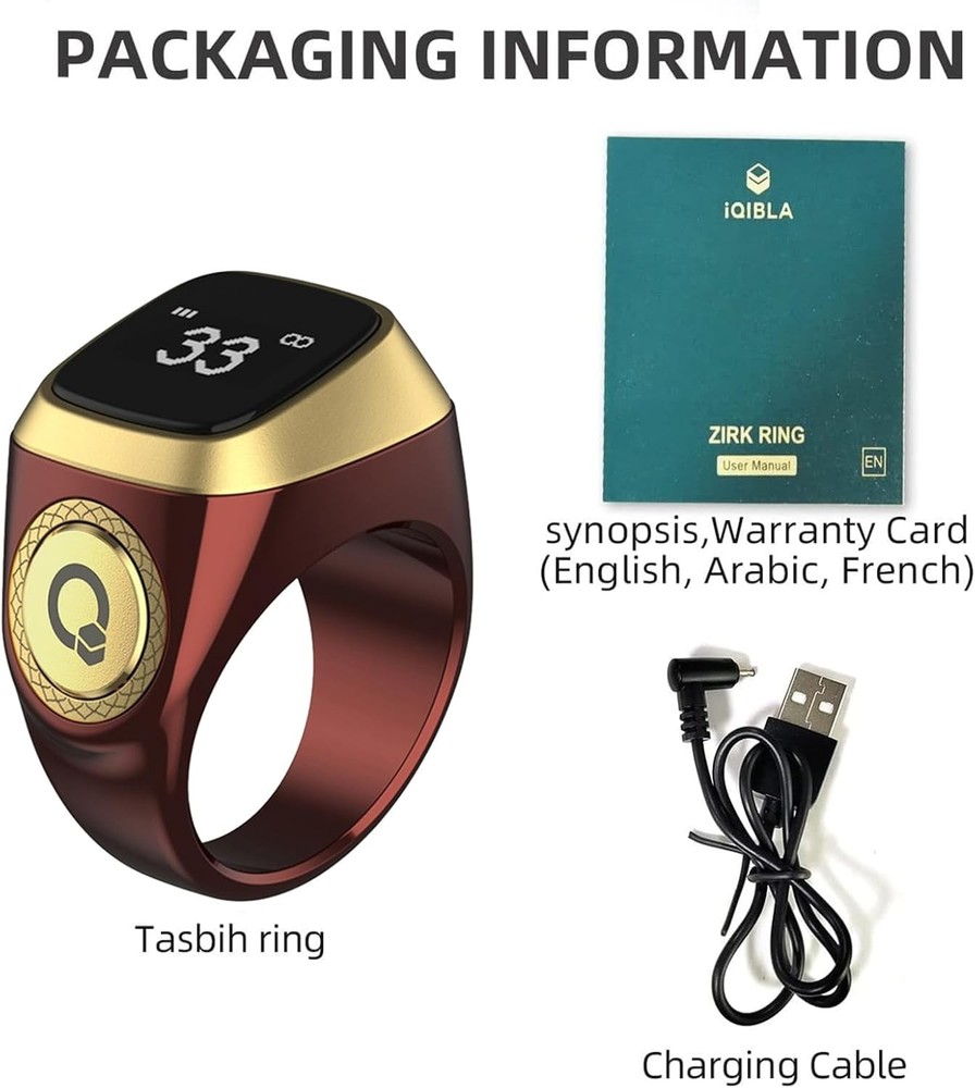 Smart Tasbih Zikr Ring, 20mm Muslim Digital Azan Alarm Clock, Red Product Details Product Dimensions: 2.83 x 1.5 x 1.57 inches Item Weight: 2.08 ounces Manufacturer: OUD Bukhoor Country of Origin: China Item model number: OUD Bukhoor-8 Batteries: 2 Lithium Ion batteries required. (included) Units: 1 Count 【Tasbeeh Counter】The ring functions as a digital Tasbih, allowing users to easily keep track of their dhikr (remembrance of Allah) repetitions by tapping the ring. 【Prayer Timing Reminder】The device includes a feature that reminds users of the designated prayer times, helping them maintain a consistent and disciplined prayer routine throughout the day. 【Bluetooth Connectivity】With built-in Bluetooth 5.1, Zikr1 lite can quickly connect to the app, get accurate direction and synchronise data with your smartphone. 【OLED Display】Zikr1 lite has a built-in 0.49 " OLED display showing the time , number of chants and prayer times. 【Wearable Technology】Designed as a wearable device, the ring seamlessly integrates into the user's daily life as a functional and stylish accessory. This wearable technology allows users to incorporate spiritual practices into their routines with ease. OUD Bukhoor Smart Tasbih Zikr Ring, 20mm Muslim Digital Azan Alarm Clock, Tasbih Counter Smart Ring