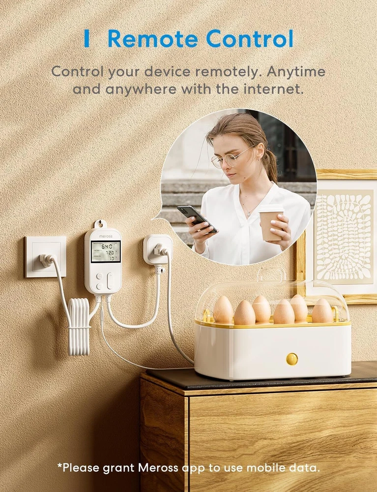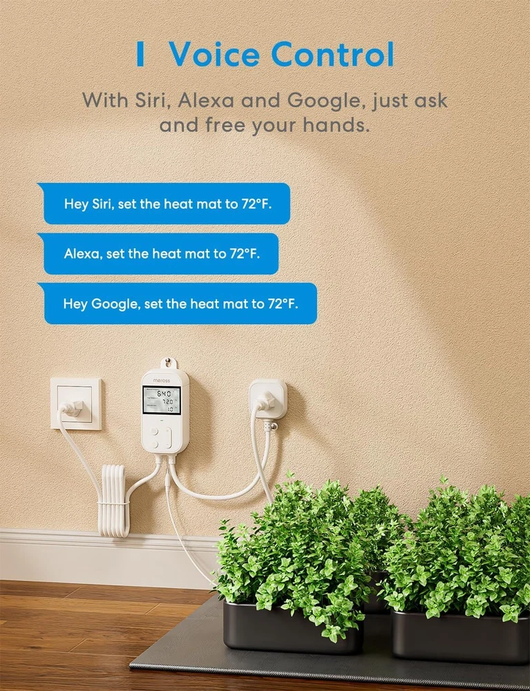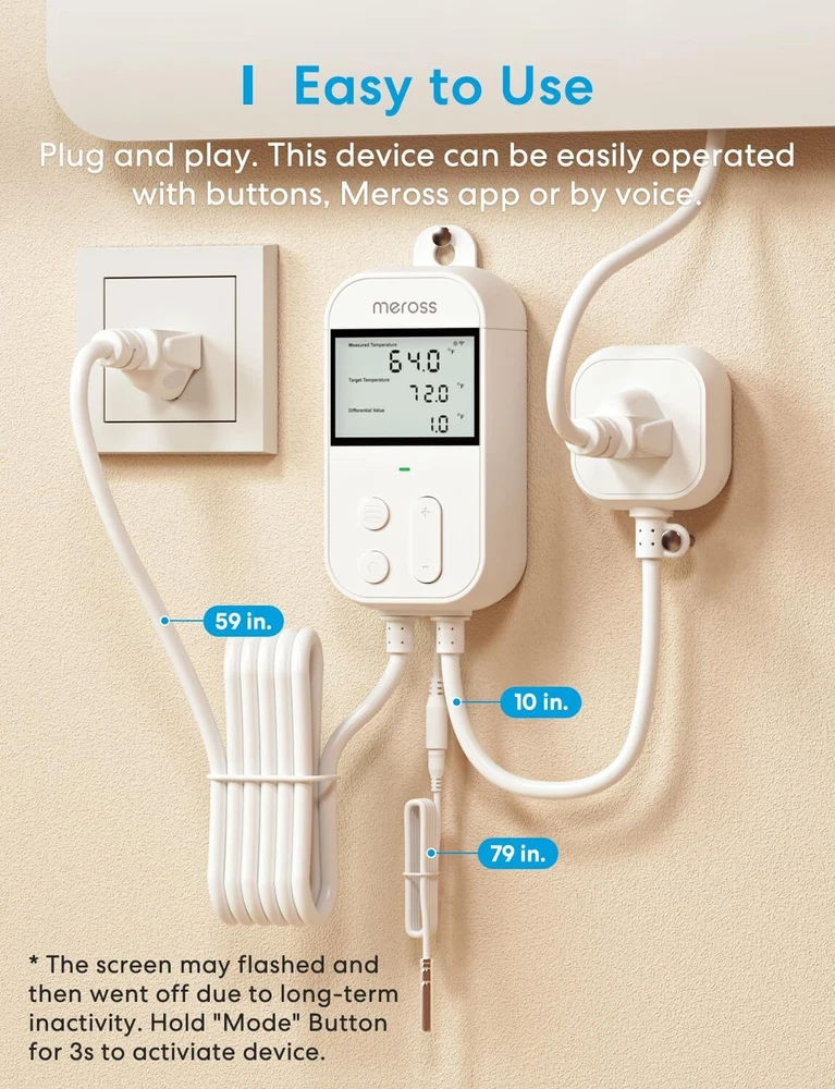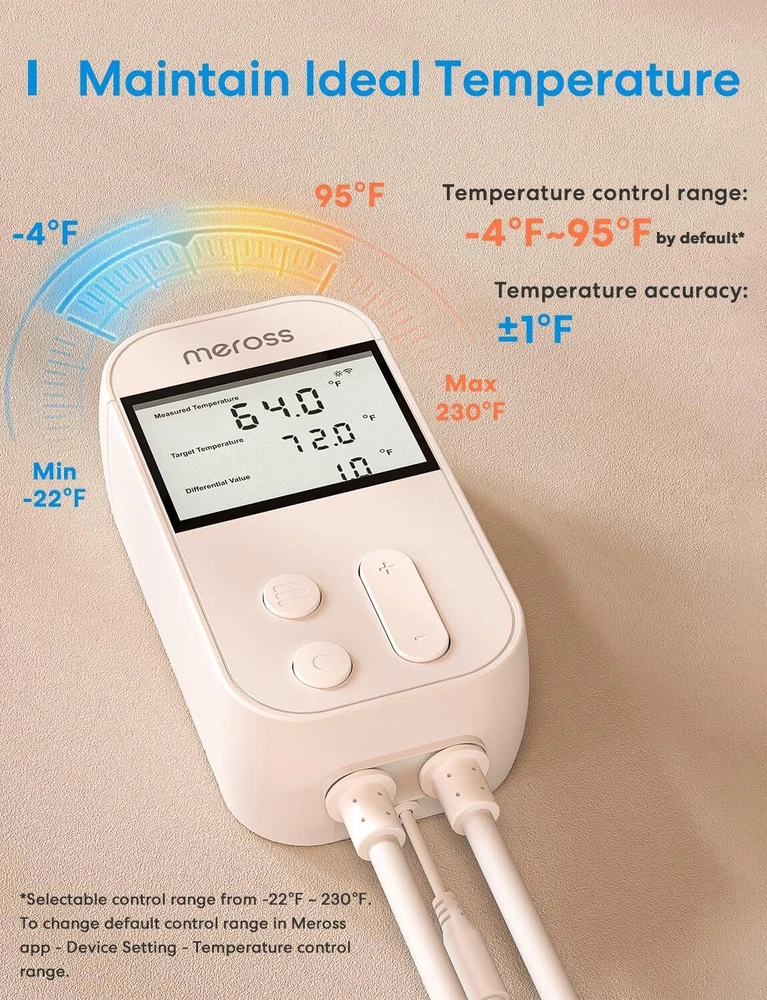 Product Description Smart Temperature Controller Thermostat Monitor Control Heating Cooling 120V 15A 1800W, Works with Apple Home, Alexa, Google Home for Home Brewing Fermentation Incubation Reptiles Green House. Easy to use: The Meross smart Wi-Fi temperature controller thermostat can be controlled using device buttons, the free Meross app or voice commands. The LCD display with a backlight can simultaneously show the target temperature and the measured temperature, making it easy to read even in the dark. It supports Celsius and Fahrenheit temperature units.Note: The screen may flashed and then went off due to long-term inactivity. Hold "Mode" Button for 3s to activiate device. Heating & Cooling - The Meross Wi-Fi temperature controller is compatible with various heating and cooling equipment such as infrared heaters, fan heaters, and refrigerators. This smart temperature controller outlet also supports Timer working mode, allowing you to set countdown timers and cycle timers to meet various requirements. Works with Apple Home, Alexa, Google Home, and SmartThings. The Meross Smart Wi-Fi temperature controller thermostat can be controlled remotely from anywhere anytime using the internet. Solid Hardware Quality - With a maximum output load of 15A, 1800W at 120V, and 3600W at 240V. this device offers a selectable wide temperature control range from -22℉ ~ 230℉(default range from -4℉ ~ 95℉) with an ±1℉ accuracy. To change control range in Meross app - Device Setting - Temperature control range. Scheduling - You can customize your home's heating and cooling with up to 12 periods per day. The Meross smart temperature controller thermostat can even follow the schedule when Wi-Fi is disconnected. It also supports energy monitoring and temperature history. You can view and extract historical data via the Meross app. About Us We are a reputable seller with many years of experience selling on eBay. Our goal is to provide high-quality products and excellent customer service. Shipping Items will be shipped within 1-3 business days when we received payment. (Orders are not processed on weekends & holidays) Tracking information will be sent once item is shipped. Delivery time depends on destination and other factors Item is shipped to ebay address. Leaving correct address can minimize delay. For international shipping and shipping to Guam, Hawaii and Alaska, Please contact us before placing the order. International buyers please note: Import duties, taxes and charges are not included in the item price or shipping charges. These charges are buyer’s responsibility. We will try our best to reduce the risk of the custom duties. Local pick-up is unavailable at the moment. Contact Us We reply any email messages within 1 business / working days(off-duty at weekend). If you do not get a response from us, then please check your junk or spam mailbox. Our Business hours: Mon-Fri 9:00-18:00, UTC/GMT +8 hours. Please contact us either by clicking "contact seller" in the "purchase history" section or simply click "ask a question" at the bottom of this page. If you are unsatisfied with our item or service, please contact us before leaving any feedback. We are committed to resolve all issues in a friendly and satisfactory manner.