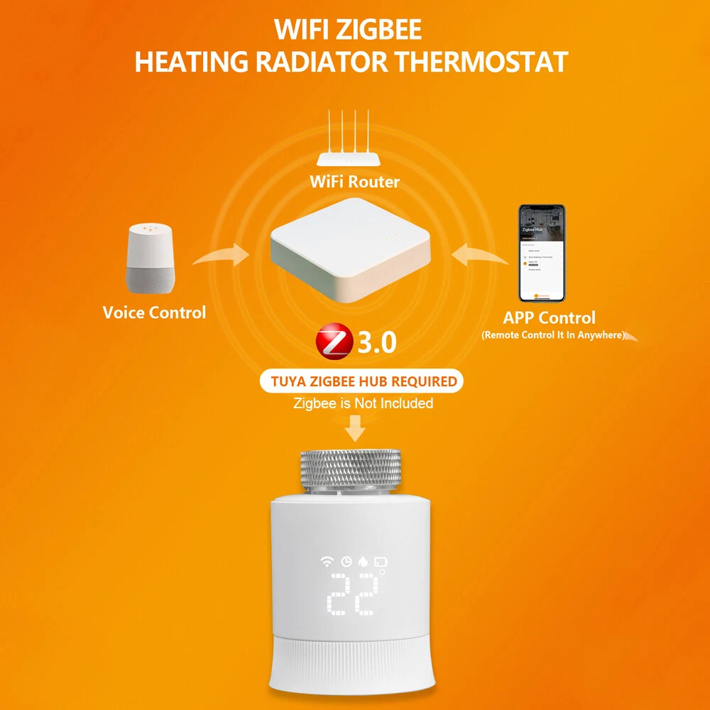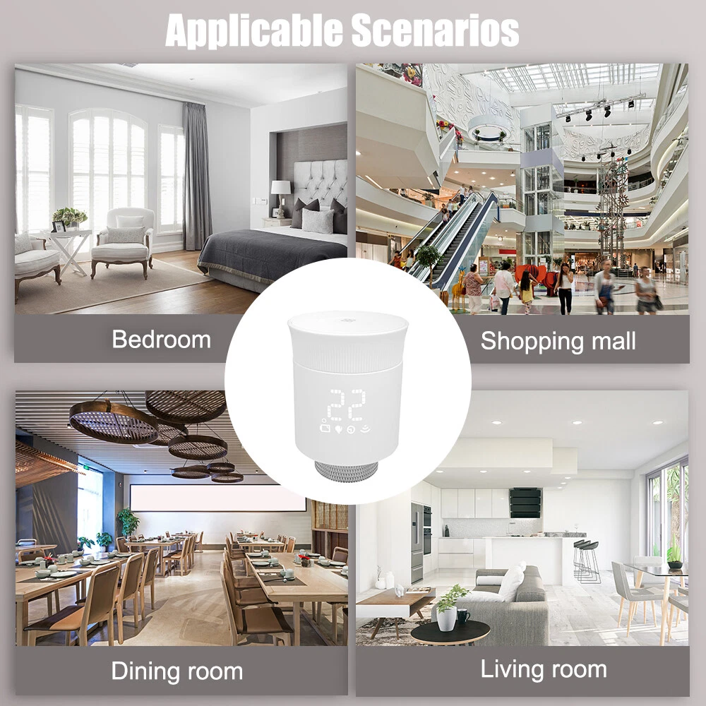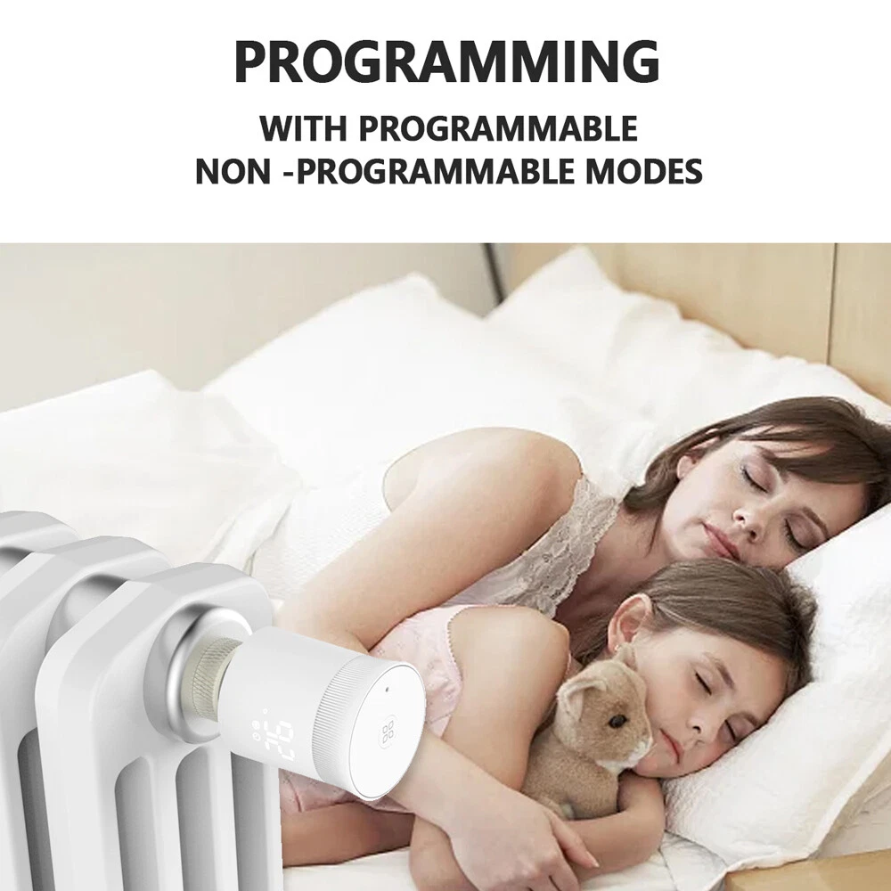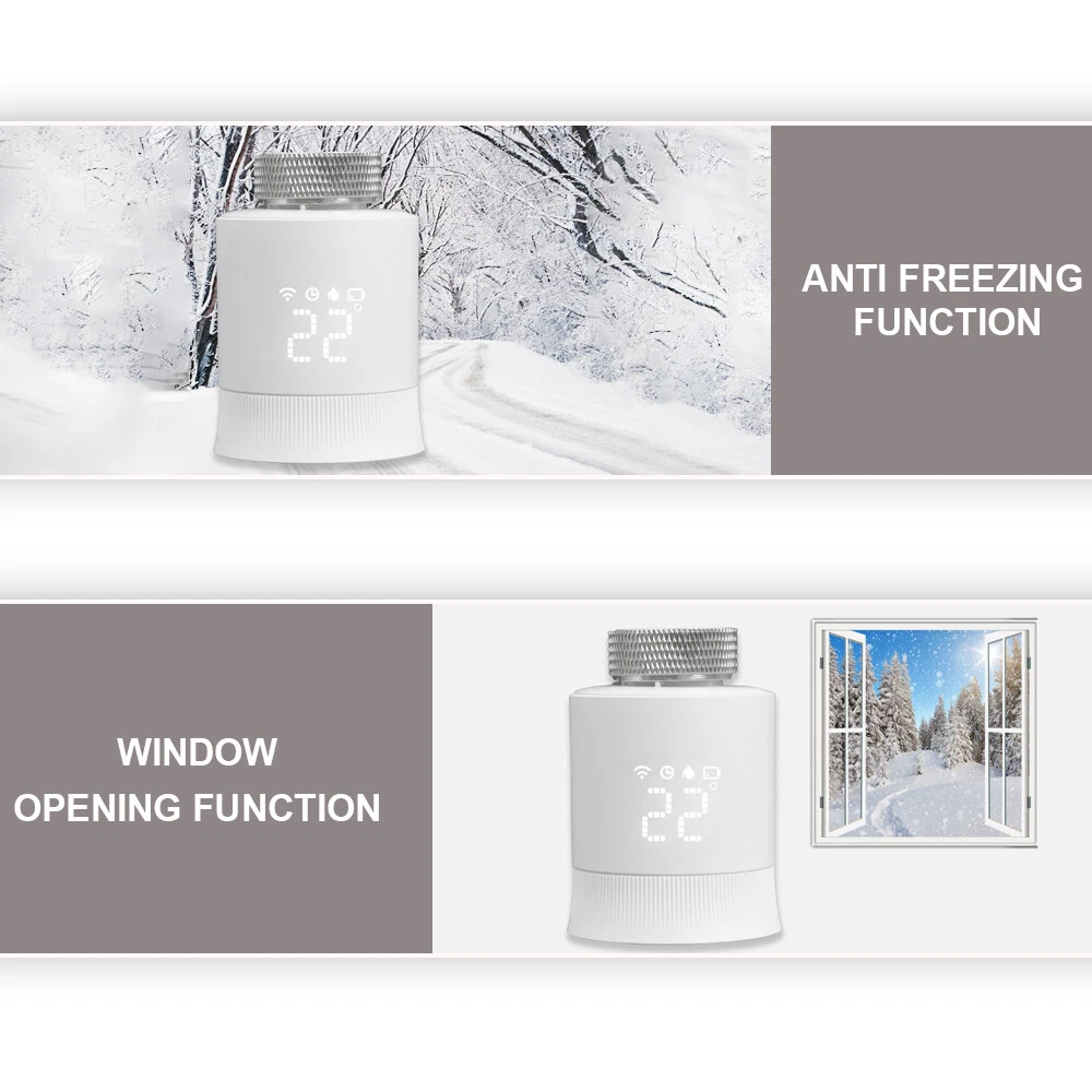 Features: Weekly Programmable Function: The smart thermostat valve comes with 6+1/5+2 weekly programmable function that allows you to set different temperature levels for different times of the day. This feature ensures that your home is always at the perfect temperature, without you having to constantly adjust the thermostat. Voice Control: The smart radiator thermostat valve is compatible with Amazon Alexa and Google Assistant, allowing you to control the temperature of your home with your voice. This feature is especially useful when you're busy or have your hands full. The Zigbee hub is required and not included. Temperature Range: The smart radiator valve has a wide temperature range, allowing you to set the temperature anywhere between 5°C and 35°C. This feature ensures that your home is always at the perfect temperature, no matter what the weather is like outside. Powerful Function: The thermostatic radiator valve comes with a range of powerful features, including windowing, anti-scale, temporary mode, anti-freezing, low voltage warning, and a child lock function. These features make it easy to control the temperature of your home and save energy at the same time. Applicable Scenarios: The radiator valve is suitable for use in multiple scenes, including homes, offices, and hotels. Its compact design and easy installation make it a versatile and convenient choice for any space. Specification: Product material: ABS Power supply mode: 2 x 1.5V AA (alkaline battery) (NOT included) Ambient temperature: 0-50°C Temperature setting: 5-35°C Temperature display accuracy: ±1°C Environmental storage temperature: -10 - 60°C Zigbee standard: IEEE802.15.4 Communication frequency: 2.405-2.48GHz Product size: L: 74mm / 2.91in, D: D: 55mm / 2.16in Product color: White Electrical safety implementation standard: GB14536.1-2008, GB14536.10-2008 Note: The 2*AA batteries are not included. Packing List: 1 x Radiator Valve