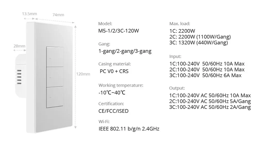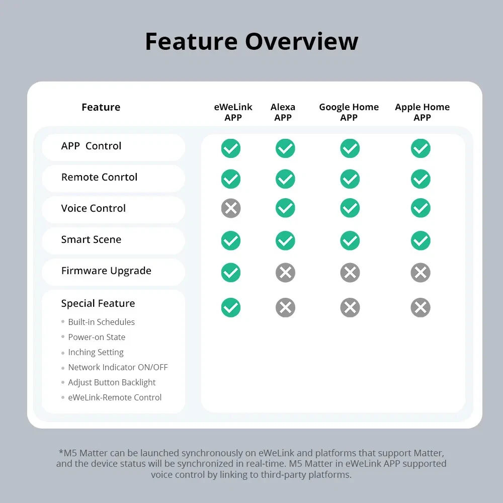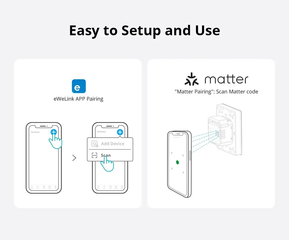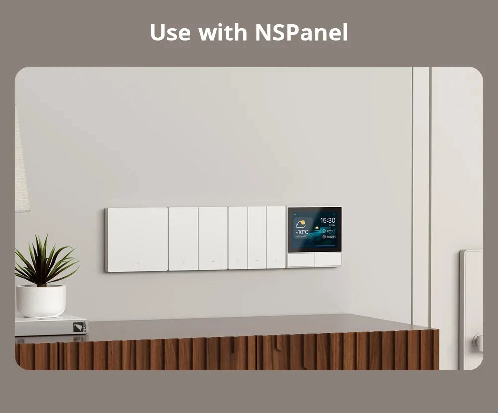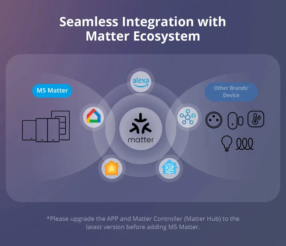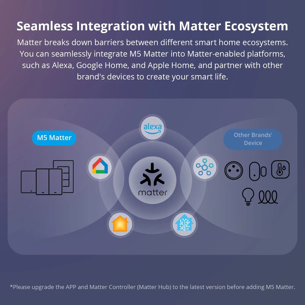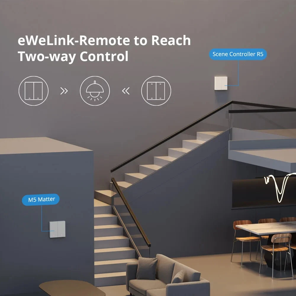 M5 Matter Smart Wall Switch 120 Type eWeLink-Remote Switchman Voice Control Works with Alexa Google Home SmartThing As a smart wall switch, M5 Matter adopts physical buttons for local control. Just press the button, and the lights will be turned on. Through the eWeLink APP, you can manage devices at any time and don't worry about forgetting to turn off the electrical appliances when you go out. M5 Matter supports voice control, such as Alexa, Google Home, Apple Siri, and Alice. When you are busy, you can turn on the light by your voice. Certified by Matter, M5 Matter seamlessly integrates into Matter-enabled ecosystems like Alexa, Google Home, and Apple Home, and partners with other brand's devices to create your smart life. As Matter-certified devices support local communication within the home network, M5 Matter boasts faster response times and higher stability. Even in the case of suboptimal server network conditions, M5 Matter can operate seamlessly within the local network. Supports work with the Apple ecosystem through Matter to control M5 Matter in the Apple Home App and create automation with devices from different manufacturers. M5 Matter works with NSPanel, operated on NSPanel smart scene wall switch to make you control the connected light or home appliances on a touch screen using a tap. It has the same color as NSPanel which provides a consistent decoration to match your home style. With Scene Controller R5, you can control the same light from two positions via eWeLink-Remote control. Realize two-way or multi-way control, troublesome wiring becomes a thing of the past. Crafted from high-grade PC V0 material, M5 Matter ensures high-temperature resistance and excellent flame-retardance. Separate the high and low voltage which you can disassemble the switch safely. And CE certified, safe performance is guaranteed. Seamless Integration with Matter Ecosystem Matter breaks down barriers between different smart home ecosystems. You can seamlessly integrate M5 Matter into Matter-enabled platforms, such as Alexa, Google Home, and Apple Home, and partner with other brand’s devices to create your smart life. *Please upgrade the APP and Matter Controller (Matter Hub) to the latest version before adding M5 Matter. Matter Ensures a Stable Local Experience As Matter-certified devices support local communication within the home network, M5 Matter boasts faster response times and higher stability. Even in the case of suboptimal server network conditions, M5 Matter can operate seamlessly within the local network. Joining the Apple Home Through Matter Supports work with Apple ecosystem through Matter to control M5 Matter in the Apple Home App, and create automation with devices from different manufacturers. *Please upgrade the iOS system and HomePod to V17.4 and above. One Phone, One Home Through the eWeLink APP, you can manage devices at any time, don’t worry about forgetting to turn off the electrical appliances when you go out. Press and Go As a smart wall switch, M5 Matter adopts physical buttons for local control. Just press the button, the lights will be turned on. Double As Smart & Safe Adjust LED Light to Locate in the Dark Want to quickly find the switch button by the LED indicator? Or prefer to sleep well without the disturbance of lights? The LED indicator on the button can be adjusted to various brightness to meet your need. Get Things Done Using Just an Order Supports voice control by working with Alexa, Google Home, Apple Siri and Alice. When you are busy, you can turn on the light by your voice. * M5 Matter supported Alice after being added to the eWeLink APP and linking accounts to third-party platforms. Smart Scene Makes Your Life Convenient Add a smart scene to build a linkage with DW2-WiFi door sensor which makes the light is turned on automatically when you open the door. Time up, Brighten up You can set a schedule for M5 Matter to control the lights. When the time is up, the bedroom light can be turned on automatically. Use with NSPanel Operated on NSPanel smart scene wall switch to make you control the connected light or home appliances on a touch screen using a tap. It has the same color as NSPanel which provides a consistent decoration to match your home style. eWeLink-Remote to Reach Two-way Control With SONOFF SwitchMan Scene Controller R5, you can control the same light from two positions. Realize two-way or multi-ways control, troublesome wiring becomes a thing of the past.