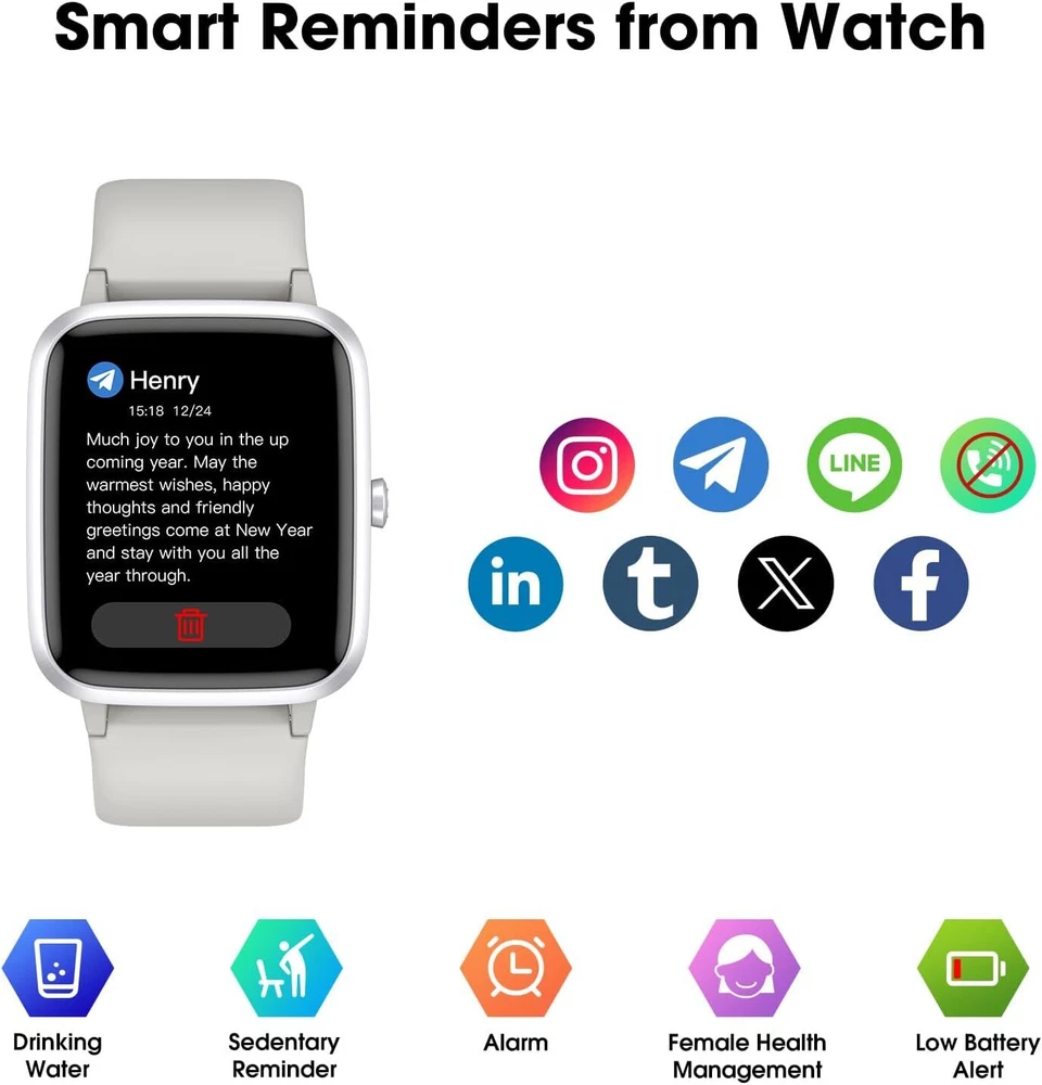 Health Monitoring: Imzuc smart watch can automatically monitor your real-time heart rate. The smartwatches also track your sleep status and analyzes the sleep quality to lead a better sleeping habit. During exercise, the smartwatch automatically records daily steps, distance, calories burned, active minutes. Mutiple Sport Modes with 5ATM Waterproof: Our fitness watch is equipped with multiple sports modes such as yoga, walking, ect, The smartwatch also tracks the outdoor workout route if connected with smartphone's GPS. Imzuc watch is designed with 5ATM waterproof rating ( 50 meters waterproof ), so you can enjoy swimming or sweating out without any worries. Get Reminders on Watch: After connected, the smart watches can receive notifications for SMS and App. You won't miss important messages from your lover/friends. Also, Imzuc watch has a sedentary alert function and you can have a move during work. Long Battery Life and Compatibility: Imzuc sports watch lasts for up to 7-10 days of continuous use or 30 days on standby after being 2-hour fully charged. Imzuc fitness tracker is compatible with most iOS 10.0 or Android OS 5.0 or higher smart phones (Not for tablets or computers). Gentle Reminders for You: Please do not wear the smart watch too tightly to prevent excessive friction that may cause skin abrasion. Give your watch a break after prolonged use. The watch cannot make calls or reply text. Product Description