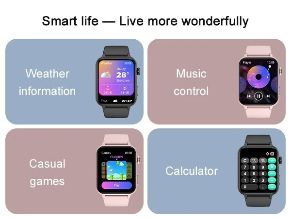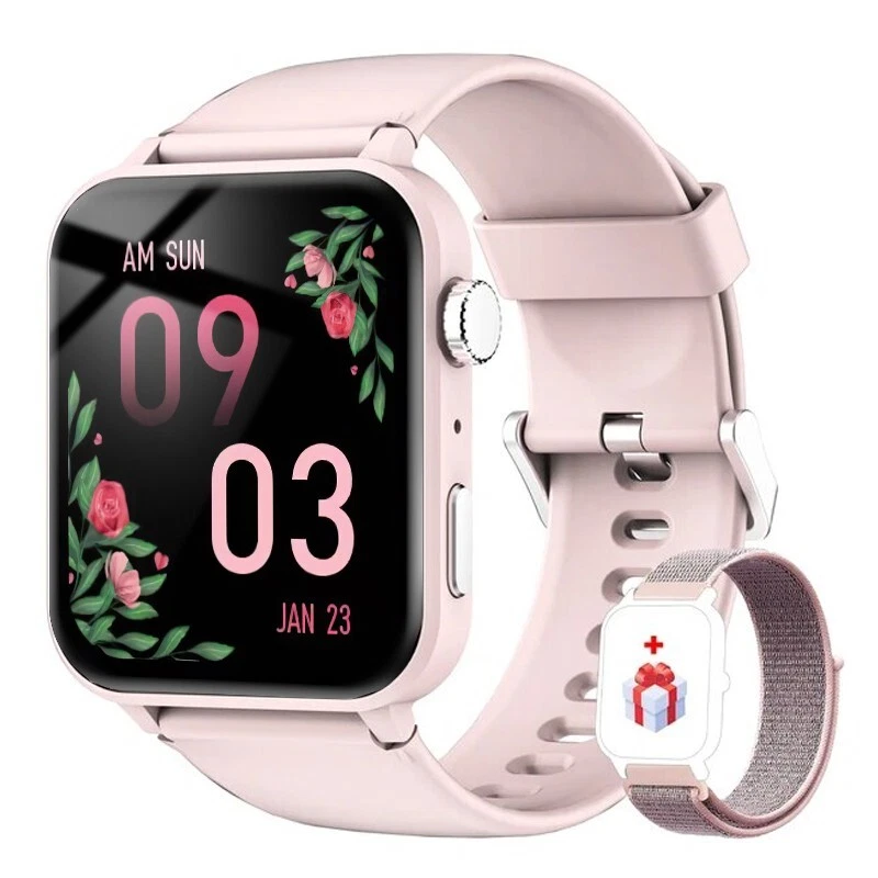 What do you get when you buy this smart watch? 1 * smart watch 1 * silicone band 1 * nylon braided strap 1 * usb charging cable 1 * user manual === Description:=== Resolution: 240 * 284p full hd Screen size: 1.85 inches Battery capacity: 350 mah Net weight of the product: 40g Waterproof grade: ip68 Charge interface: usb2.0 Standby time: 30 days Usage time: 7 days Charging time: 2 hours Mode of operation: full touch screen + buttons Bluetooth effective distance 5.3:20m Support system: android 6.0 and above, ios 9.0 and above Languages supported: Spanish, English, German, French, Italian, Japanese, Russian, Portuguese Watch format: 12/24h, you can change according to your own habits. ===Product description=== Its large 1.85 inch color screen is made of high quality tempered glass, giving you an excellent visual experience. You can control the clock by sliding your finger up, down, left and right, or by holding down the screen. The app comes with over a hundred wallpapers. Of course, you can also download your favorite photo and set it up as a watch screensaver, just lift the wrist to activate the screen easily! The smart watch features ip68 waterproof technology. Whether you sweat or rain, deep water resistant technology effectively protects your watch for a safe use experience; The perfect companion for everyday life. It supports the supervision of hundreds of sports modes, such as running, riding, jumping rope or ball games. You can use the watch to record the status of your exercise at any time. You can record exercise time, distance, calories burned, heart rate, etc., and you will become your close partner when you exercise. Smart watches can monitor your health at any time. You have 24-hour heart rate monitoring and can also measure blood oxygen saturation (spo2) and blood pressure. Both blood oxygen meters and blood pressure meters are on your hands. Apps connected to your mobile phone, with synchronous sleep logs, weather information and information notifications. It also has a sedentary reminder that when you are busy with work and forget about time, it will gently vibrate to remind you to relax your body and mind. 350 mah aluminium polymer battery, superdurable and reliable standby mode. It only takes 3 hours to fully charge and can run continuously for 5-7 days or standby for up to 30 days. At the same time, the clock supports a wide range of android and ios systems. The watch has a green light sensor. When there is a call or a message, it vibrates and it rings. The clock can also call and receive the phone. Supports 100 synchronized contact Numbers. You can also control and play music directly. You can suspend and play the last song or follow the song (you must first open the music player via your mobile phone). In the camera interface, you can take photos remotely. More practical functions like: alarm clock, voice assistant, calculator, mini game, etc., wait until you find out. === Instructions for use=== 1. After receiving the product, check the corresponding charging cable of the product 2. Hold down the side button of the watch for 3 seconds to turn on 3. Scan the qr code or download the app through the app store 4. Connect your bluetooth mobile phone through the app 5. Open the application, switch to the device interface and match the device 6. Start enjoying your time and be happy with your smart watch Legal notice • battery life depends on the use of the product.