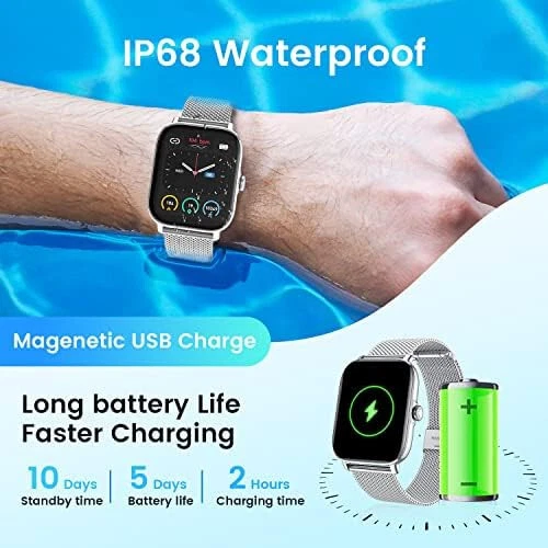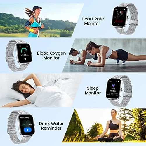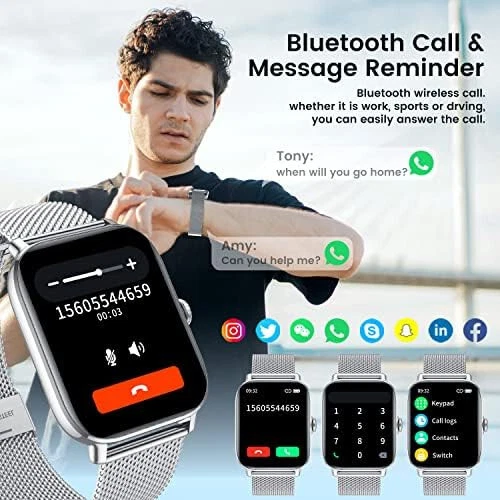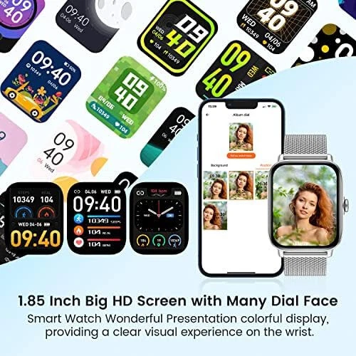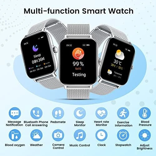 Smart Watch for Android Phones iOS Waterproof Smart Watches for Women Men Description:- 【Bluetooth Call Receiving/Dialing】Smart watches for women and men with bluetooth call, you can receive or dial calls anytime and anywhere directly on your watch after establishing Bluetooth connection. You can also add favorite contacts and check call records. Smart watch has a handsome design, with its square display and full touch 1.85 inch colorful screen, which has 240*286 pixels resolution make the screen clear and bright. You can even set your own photo as the face skins freely. 【Accurate Activity Tracker Watch & multi Sport Modes】Fitness watch accurate track steps,calories,heart rate,sleep stages,Blood Pressure,oxygen;smart watch supports multi sports modes:walking,running,bicycle,swimming ,badminton,basketball,football,rope skipping to give you more detailed insights into your whole day activities;It can connect to smartphone GPS for modes like Run for more precise real-time pace & distance. IP68 waterproof,you can wear it when swimming and record various data. 【Protect & monitor your health】Bluetooth Smart watch for men women can monitor your heart rate all day automatically, and measure Blood Pressure & Blood Oxygen which three body's most critical indicator of health.You can read them real-time directly on the smart watch, which can help you better understand your health and make reasonable adjustment on your life-style.Fitness watch also monitor sleep and provides comprehensive analysis of your sleep. (Deep sleep, light sleep and awake time). 【Smart Reminder for Call and Information】By connecting men women smart watches with smartphone,your information can be displayed on the smartwatches synchronously, such as incoming call, SMS, Facebook,WhatsApp,Twitter, LinkedIn, Instagram,Line,SKype,Gmail,etc,you will never miss important news.More practical features like sedentary reminder, pedometer,remote camera control, music controller, check the weather, find smart watches,brightness adjustment,vibration alarm clock,etc. 【Super Long Battery Life & Broad Compatibility】ios android smart watch for women men is equipped with a 270 mAh large capacity battery and can be used 7-10 days If fully charge! (Note: depends on individual usage). Wear os smartwatch can support most android and ios phones. Compatible with iPhone 14/14 pro 13/13 pro 12/12 pro max iPhone 11/11 pro/X/8/8 plus/7/7 plus/6/6 plus/6s/6s, Samsung Galaxy, HUAWEI, Xiaomi, ZTE etc. smart phones(Support IOS 9.0 and later, Android 5.0 and above).