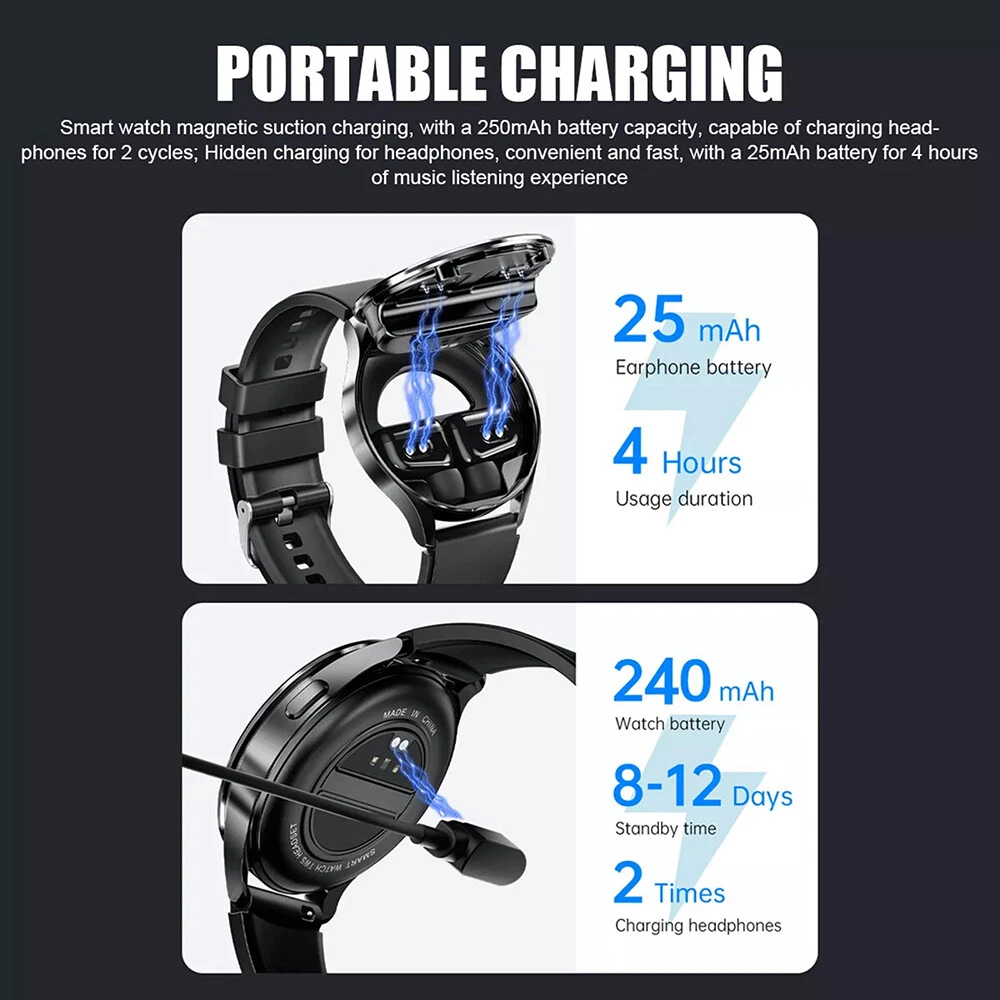 Store Categories Store Categories Other Smart Watch TWS Earbuds Headset 2 in 1 Premium Wireless Calling, Fitness Tracker Details Features: 1. Two in one new design: Smartwatch paired with TWS Bluetooth earphones, perfect combination of smartwatch and Bluetooth earphones. All metal steel dial, full of high-tech feel. 2. Large screen smartwatch: Equipped with a 1.39-inch large screen, super Retina high-definition display, 360 * 360 high-definition resolution, the smartwatch has higher color saturation and finer and clearer picture quality. You can use 10+watch dials and define your own theme. 3. Multi functional watch: Bluetooth calling, full touch, heart rate, shake and take photos, call reminder/reject, information storage, multi sport modes, weather, built-in NFC function make this watch a smart lock key for your home or office, so you no longer have to worry about forgetting your key when going out. 4. Main functions: Real-time vibration reminder, information reminder, alarm clock, finding wristbands, health monitoring, exercise recording (pedometer, calories, mileage), time, week, date. 5. Make/receive phone calls and support notifications: After connecting to Bluetooth, you can directly dial the phone number on the screen to answer the call. When your smartphone receives calls and messages (such as SMS, Skype, Facebook, Twitter, WhatsApp, Line, Viber), it pushes them to the TWS earbud watch. Make our lives more convenient and intelligent. 6. The application supports 26 languages: English, Simplified Chinese, Traditional Chinese, German, French, Arabic, Czech, Greek, Spanish, Japanese, Persian, Italian, Korean, Dutch, Polish, Portuguese, Russian, Finnish, Swedish, Thai, Hungarian, Slovak, Croatian, Albanian, Turkish, Ukrainian, Hindi 7. Watch language support: English, German, French, Arabic, Czech, Greek, Spanish, Persian, Italian, Dutch, Polish, Russian, Finnish, Swedish, Thai, Hungarian, Slovak, Croatian, Albanian, Turkish, Ukrainian, Hindi 22 languages. The function of the headphone button: 1. Press the button 4 times before pairing ----- switch between Chinese and English prompts 2. Press and hold for 2 seconds to turn on the device, press and hold for 1.5 seconds to reject calls, and press and hold for 3 seconds to turn off the device 3. Double click button ----- Answer/End call 4. 4 Click button ----- Wake up SIRI compatible 5. Double click button ----- Play/Pause 6. Three clicks on the left ear button: Previous track; Three clicks on the right ear button: Next track) 7. Restore headphones to factory settings: Press and hold the headphones for 8 seconds while they are turned off. (If the two ears cannot be paired, they can be restored to factory and re paired) Reminder: Heart rate, blood oxygen, and blood pressure are only reference values and cannot be used for medical purposes!!! Specifications: Product Name: Smart Watch Main control chip: 8762D Screen size: 1.39 inches Resolution: 360 * 360 Bluetooth version: 5.0 Waterproof grade: IP67 Standby time: 8-12 days Music duration: 4 hours Battery life: 3-5 days (depending on personal usage) Charging time: 1 hour (earphones) Charging time: 1.5 hours (watch) Charging method: Magnetic charging Earphone battery capacity: 25mAh Watch/Charging Cabin Battery Capacity: 240mAh Charging case function: can charge headphones 2-3 times Control method: Full screen touch+button press Application: FitCloudPro Compatible system: Android 4.4 and above; Compatible with iOS 8.0 and above versions Watch memory: 192KB RAM+1024KB ROM+128MB UI Flash Case Material: Glass Lens+Zinc Aluminum Alloy Strap material: silicone/steel strap (optional) Package includes: 1 * 2-in-1 smartwatch 1 * User Manual 1 * Screen protector film 1 * USB magnetic charging cable Note: Due to manual measurement, please allow for an error of 1-3cm. Before bidding, please make sure you don't mind! Due to differences in monitors, images may not reflect the actual color of the product. thank you! Shipping Policy Payment Method Returns Policy Shipping Policy Payment Method This is the description of Payment Method. Do not dismiss your dream. To be without dream is to be without hope. To be without hope is to be without purpose. Do not run through your life so fast that you forget not only where you have been, but also where you are going. Life is not race, but a journey to be savored each step of the way. Returns Policy This is the description of Returns Policy. Do not dismiss your dream. To be without dream is to be without hope. To be without hope is to be without purpose. Do not run through your life so fast that you forget not only where you have been, but also where you are going. Life is not race, but a journey to be savored each step of the way. Copyright©2017 DataCaciques Smart Watch TWS Earbuds Headset 2 in 1 Premium Wireless Calling, Fitness Tracker Item Description Features: 1. Two in one new design: Smartwatch paired with TWS Bluetooth earphones, perfect combination of smartwatch and Bluetooth earphones. All metal steel dial, full of high-tech feel. 2. Large screen smartwatch: Equipped with a 1.39-inch large screen, super Retina high-definition display, 360 * 360 high-definition resolution, the smartwatch has higher color saturation and finer and clearer picture quality. You can use 10+watch dials and define your own theme. 3. Multi functional watch: Bluetooth calling, full touch, heart rate, shake and take photos, call reminder/reject, information storage, multi sport modes, weather, built-in NFC function make this watch a smart lock key for your home or office, so you no longer have to worry about forgetting your key when going out. 4. Main functions: Real-time vibration reminder, information reminder, alarm clock, finding wristbands, health monitoring, exercise recording (pedometer, calories, mileage), time, week, date. 5. Make/receive phone calls and support notifications: After connecting to Bluetooth, you can directly dial the phone number on the screen to answer the