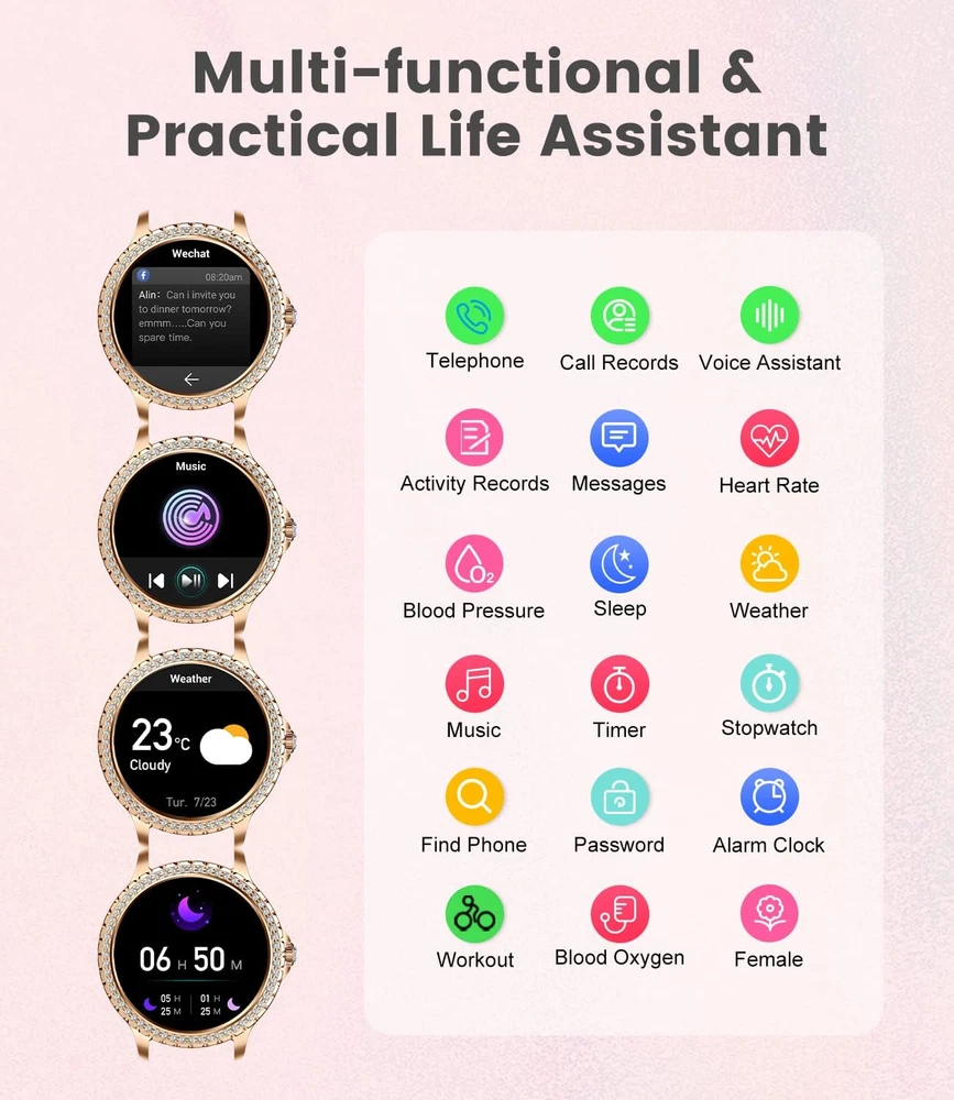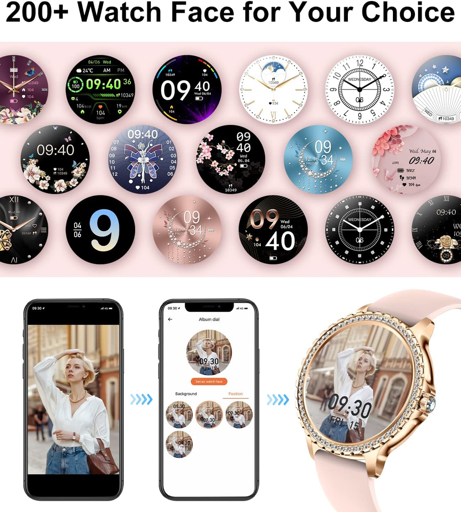 【Elegant Smart Watch for Women】Experience crystal-clear visuals on the 1.32" HD touch screen with 360*360 HD resolution. The bezel and straps are adorned with shiny diamonds, adding an elegant and luxurious touch that is sure to turn heads. Customize watch faces and straps to complement any outfit and showcase your individuality effortlessly. Elevate your style with this chic accessory - the perfect ladies' smart watch. 【Stay Connected & Informed, Hands-Free】Our women's smart watch offers Bluetooth calling with a built-in microphone and high-fidelity speaker. Connect effortlessly to your phone and handle calls directly from your wrist - receive, reject, or answer with ease. Stay updated with SMS and messages from popular social media platforms like WhatsApp, Facebook, Instagram and more. And during your workouts, you no longer need to take out your phone to check messages.Never miss a vital message again! 【100+ Sport Modes & IP67 Waterproof】This fitness tracker watch supports for 20 sports modes, including walking, running, cycling, yoga, tennis and so on.Easily track steps, distance, calories, and heart rate on the women's smartwatch or the "FitCloudPro" app. Scientific and safe training awaits you. IP67 waterproof rating ensures daily needs, but avoid prolonged soaking. 【Your All-Day Health Companion】High-performance optical sensors continuously track your heart rate, blood oxygen levels, and sleep quality, providing detailed data-based presentations for insightful analysis. Access your health information conveniently via the "Fitcloudpro" app, gaining a better understanding of your overall wellness. (NOTE: The measurement data is for reference only and not intended for medical monitoring.) 【Empowering Women's Health】Our ladies' smart watch features a built-in physiological cycle reminder, keeping you informed about menstrual and ovulation periods. Stay prepared as it predicts and reminds you of your next period, allowing better planning. Even during pregnancy, stay connected to your body with pregnancy tracking. 【Versatile & Compatible】Discover the countless practical features of our women's smart watch compatible with Android and iOS phones! Enjoy AI voice and Bluetooth calling along with a women's health pedometer, calorie tracker, sedentary reminder, water reminder, alarm clock, weather display, multi-language support, message push, and comprehensive health tracking. With wide compatibility, this smartwatch pairs seamlessly with most iOS 8.4 and Android 4.4 or above smartphones. 【After-Sales Service】We stand behind the quality of our products and offer a 12-month worry-free product warranty, which includes replacement, return, or accessory replacement services. You can purchase our smartwatch with confidence, knowing that we have you covered. If you have any questions or concerns about your smartwatch, please do not hesitate to contact us. Our team is always ready to provide you with the support you need. Product Description 2024 Shinny Smart Watches for Women The unique dial design is adorned with exquisite diamonds, adding a touch of luxury to your wrist. Fashion and extravagance blend seamlessly, making a perfect fusion. With every raise of your hand, you will be captivated by the sparkling diamonds on the dial. Whether it's a gala, a social gathering, or your everyday attire, this ladies smart watch will become your fashion focal point, emanating a distinct charm. Compatibility: Smart watch Android 4.4+/iOS 8.4+/Bluetooth 5.0 System Smartphone. It's a wonderful gift for mothers day gifts,teacher appreciation gifts,mothers day gifts from daughter,birthday gift,graduation gifts... Smart Watch with Bluetooth Calls&Message Push Bluetooth Call The smart watch for women comes with built-in calling functionality, eliminating the need to frequently retrieve your phone from your pocket or bag to answer calls. Whether you're exercising, driving, working, or in other scenarios, a simple tap on the smartwatch screen or button allows you to answer important calls and maintain conversations. Additionally, the smartwatch offers you the option to reject incoming calls, enabling you to easily block disturbances during times when concentration and tranquility are needed, enhancing convenience and comfort in your daily life. Smart Notification The smartwatch will vibrate to remind you when your phone receives the messages or App notifications (Facebook, WhatsApp, Twitter, Instagram, etc) you won't miss any important information Fitness Tracker Watch 20+ Sports Modes and All-Day Activity Tracking There are more than 20 sports modes tracking available in the fitness tracker, covering almost all daily sports activities, the all-day activity tracking feature monitors your steps, distance, and calories burned all the day, so you can see how much progress you've made towards your fitness goals. IP67 Waterproof IP67 waterproof rating can offer protection against life's splashes and spills.Note:Do not use in water above 38 ° C, such as showers, saunas, etc. and do not use the Seawater Health Tracker Women's Menstrual Cycle Reminder C aring for women’s health, ladies digital watch have three reminder modes: menstrual management, pregnancy preparation and health of both sexes. The mobile phone records the historical menstrual period and the watch displays the current physiological state (menstrual period, predicted menstrual period, ovulation period), and takes good care of your health. 24/7 Heart Rate Monitoring Stay on top of your health with our smart watches for women both Android and iOS phones. Enjoy continuous heart rate tracking to gain valuable insights into your well-being. Blood Oxygen Level Tracking Our fitness smart watches for women, designed for women, offer the capability to monitor your blood oxygen levels. Easily visualize and analyze your blood oxygen data, including average, maximum, and minimum readings, right in the app for a comprehensive understanding 