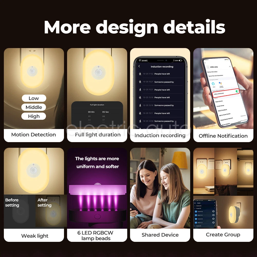 Product View Detail Features: Dual Mode Connection & Speed Improvement The sensor night light supports Wifi+Bluetooth dual-mode connection, providing a more stable network connection and increasing the speed by 2 times compared to a single Wifi connection, ensuring a fast response and seamless control experience Intelligent Sensing and Convenient Lighting Equipped with WIFI night light function and motion sensing function, it can automatically light up when people pass by, providing convenient night lighting and avoiding safety hazards when walking at night, while supporting linkage with other smart devices to enhance the smart home experience Customized Lighting Experience Users can freely set white light or warm light in the APP, and make infinite brightness adjustment to meet the lighting needs of different scenes and personal preferences The color light mode also allows you to set different colors of light to create an atmosphere for a party or date. Intelligent control and energy saving Support Amazon Alexa and Google Home Assistant voice control for brightness, color and on/off voice control With timer function and countdown function, you can preset the switching time according to your living habits, saving energy and providing convenience at the same time. Healthy Lighting and Intelligent Management Using 6 imported LED light beads, the light is soft and not harsh, protecting eye health With group function, it is convenient to control multiple night lights in a unified way. Micro-bright mode and constant light time adjustment function, which can maintain the comfort of the night environment without affecting the rest of the family History and sharing function, convenient for users to check the sensing record and share the control with family members. Offline reminder function ensures that the device is always online to safeguard the family's safety. Product Specification: Sensing angle: 120 Sensing distance: 5 meters left Voltage: 110-240V 50H Specification: Europe Working temperature: -10℃-50 Wifi Type: 2.4GH Application:Smart Lif Size: 76*36*30m Product List: 1×Induction night 1×Description Shipping Policy Payment Method Returns Policy Shipping Policy We only accept your Ebay Address ,Please Make sure it's 100% right. The items you ordered will be shipped out in 1 business day by Hong Kong Air Mail when your payment is clear. The arrival time is 5-20 business days to United States usually. We maintain high standards of excellence and strive for 100% customer satisfaction! Feedback is very important to us. We request that you contact us immediately BEFORE you give us neutralor negative feedback, so that we can satisfactorily address your concerns. Payment Method Returns Policy Copyright © 2017 DataCaciques Smart Night Light WIFI Bluetooth Remote Control Motion Sensor Home LED RGB Lamp Home Payment Shipping About us Contact us Store Categories Store Categories Consumer Electronics PC&Tablet Accessories Mobile Phone Accessories Sound&Vision Headphones Watches Camera Led Lights Others Auto Car Accessories Lights Others Motorcycle Motor Accessories Lights Others Headlamp&Torch Others Other Product View Detail Features: Dual Mode Connection & Speed Improvement The sensor night light supports Wifi+Bluetooth dual-mode connection, providing a more stable network connection and increasing the speed by 2 times compared to a single Wifi connection, ensuring a fast response and seamless control experience Intelligent Sensing and Convenient Lighting Equipped with WIFI night light function and motion sensing function, it can automatically light up when people pass by, providing convenient night lighting and avoiding safety hazards when walking at night, while supporting linkage with other smart devices to enhance the smart home experience Customized Lighting Experience Users can freely set white light or warm light in the APP, and make infinite brightness adjustment to meet the lighting needs of different scenes and personal preferences The color light mode also allows you to set different colors of light to create an atmosphere for a party or date. Intelligent control and energy saving Support Amazon Alexa and Google Home Assistant voice control for brightness, color and on/off voice control With timer function and countdown function, you can preset the switching time according to your living habits, saving energy and providing convenience at the same time. Healthy Lighting and Intelligent Management Using 6 imported LED light beads, the light is soft and not harsh, protecting eye health With group function, it is convenient to control multiple night lights in a unified way. Micro-bright mode and constant light time adjustment function, which can maintain the comfort of the night environment without affecting the rest of the family History and sharing function, convenient for users to check the sensing record and share the control with family members. Offline reminder function ensures that the device is always online to safeguard the family's safety. Product Specification: Sensing angle: 120 Sensing distance: 5 meters left Voltage: 110-240V 50H Specification: Europe Working temperature: -10℃-50 Wifi Type: 2.4GH Application:Smart Lif Size: 76*36*30m Product List: 1×Induction night 1×Description Shipping Policy Payment Method Returns Policy Shipping Policy We only accept your Ebay Address ,Please Make sure it's 100% right. The items you ordered will be shipped out in 1 business day by Hong Kong Air Mail when your payment is clear. The arrival time is 5-20 business days to United States usually. We maintain high standards of excellence and strive for 100% customer satisfaction! Feedback is very important to us. We request that you contact us immediately BEFORE you give us neutralor negative feedback, so that we can satisfactorily address your concerns. Payment Method Returns Policy Home Payment Shipping About us Contact us