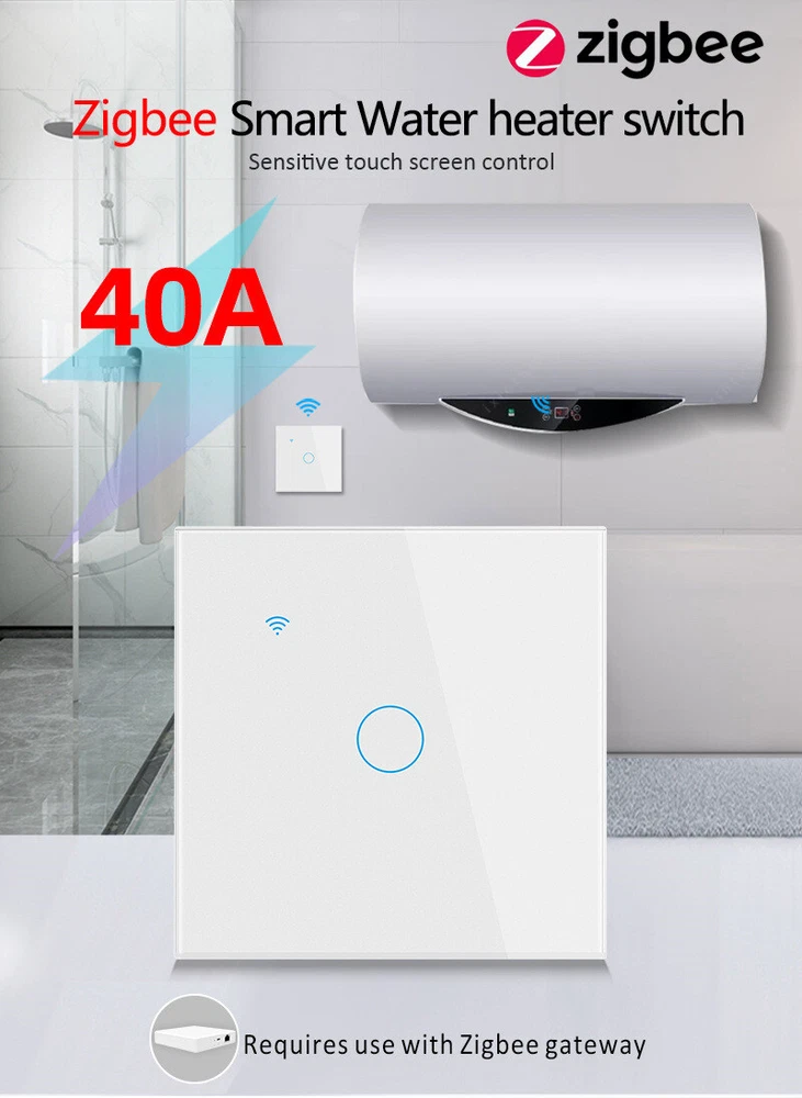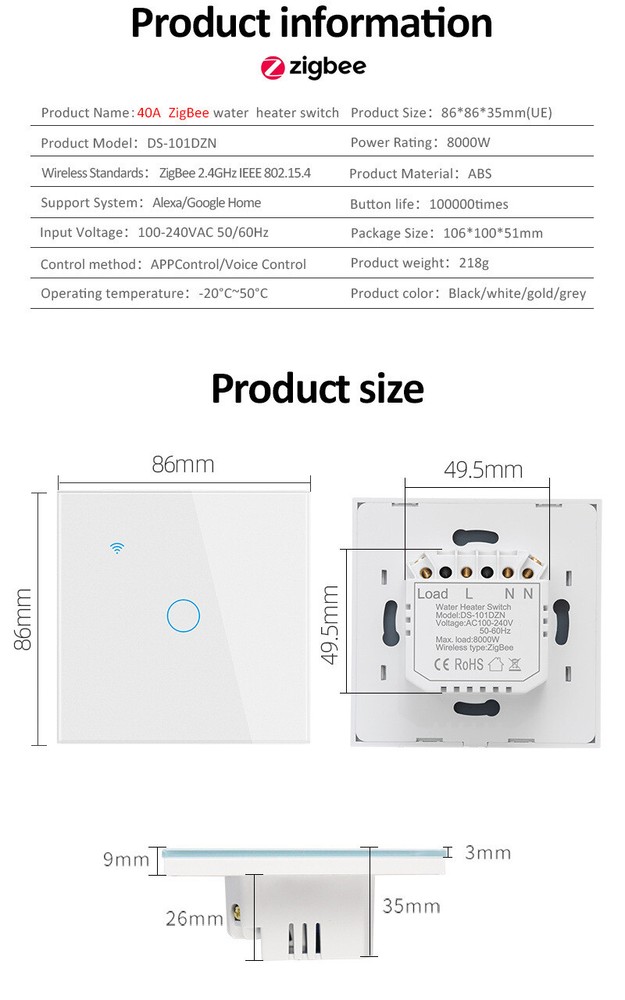 SAFE & SECURE SHOPPING 100% SATISFACTION GUARANTEED FAST SHIPPING WiFi Smart Boiler Switch Water Heater Smart Life Tuya APP Remote Control Alexa Product Description If you have any questions, please contact customer service first, do not open disputes easily, thank you! Features: 1.Voice control:once you have this switch,you can connect it with Amazon Alexa(Amazon echo/dot/tap) or Google Assistant for voice control. 2 ZigBee Remote Control:You can use "Tuya Smart" APP in your smart phone to control the boiler switch wirelessly with Wi-Fi or 4G network.no hub required. 3.Timing Function:Take full control of your home or office lights thanks to schedule timer that will allow you to plan the exact time to turn water heater on/off automatically 4.Share Device:This samrt boiler switch can have several control sites shared by different family members.one mobile phone can control many switches also. 5. ATTENTION:Tuya Zigbee hub/Gateway is required for this switch, and hub/gateway is not included in the package. Specifications: Product Name : 40A ZigBee water heater switch Product Model: DS- 101DZN Standard type: EU/UK Wireless Standards: ZigBee 2.4GHz IEEE 802.15.4 Support System: Alexa/Google Home Input Voltage: 100-240VAC 50/60Hz Control method: APPControl/Voice Control Operating temperature: -20°C~50°C Product Size: 86* 86* 35mm(UE) Power Rating: 8000W Product Material: ABS Button life: 100000times Package Size: 106* 100* 51mm Product weight: 218g Product color: Black/white Package Includes: 1 × Boiler Switch 1 × User Manual 2 × Screw Note: Tuya Zigbee hub/Gateway is required for this switch, and hub/gateway is not included in the package. About Us About Us We accept all payments authorized by eBay. Copyright © 2022 Tongtool