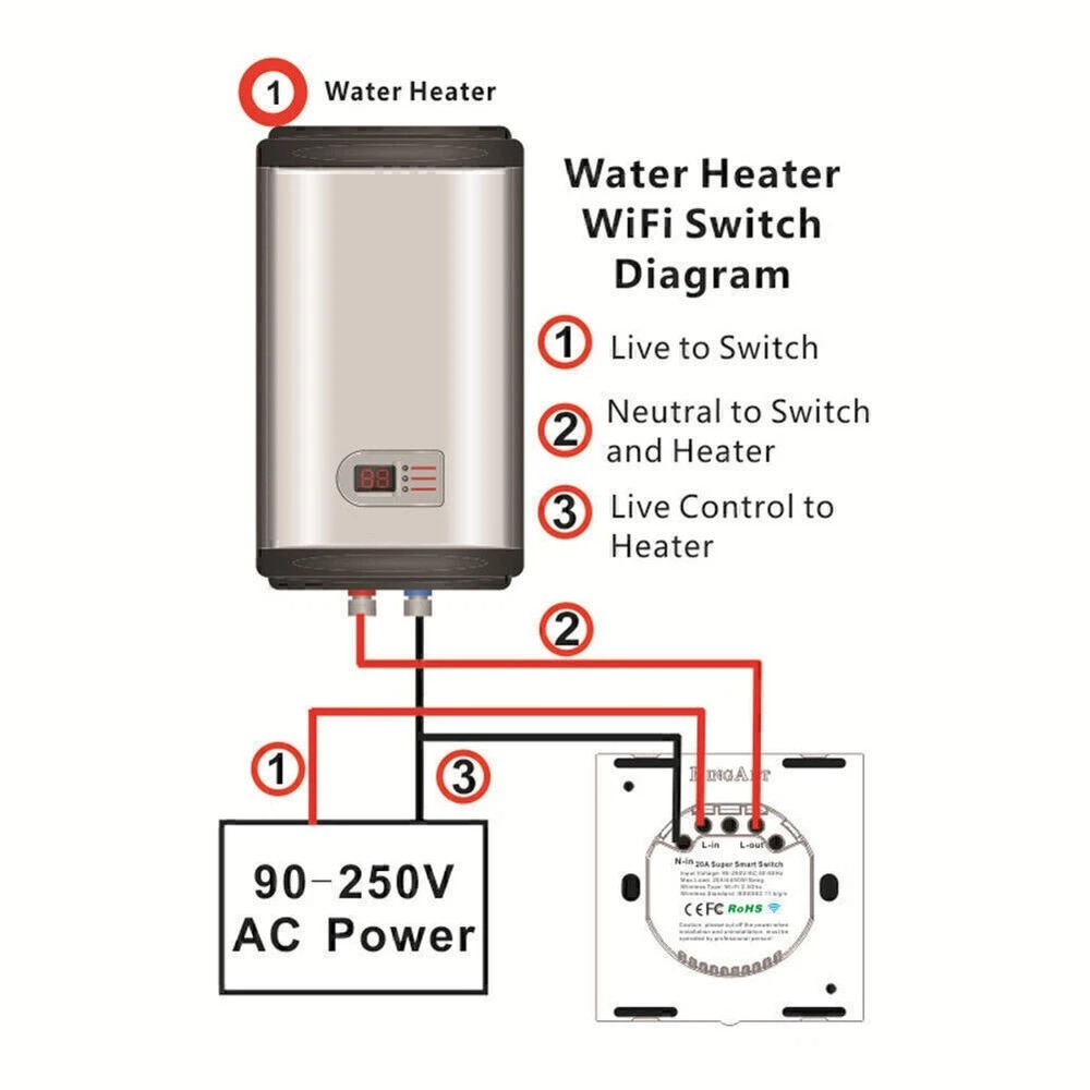 Product Description If you have any questions, please contact customer service first, do not open disputes easily, thank you! Features: APP Control: You can use "SMART LIFE" APP in your smart phone to control the boiler switch wireless with Wi-Fi or 4G network, no hub required, you could turn on your water heater in advance, then enjoy a hot shower when arrived. Timer and Schedule Function: Take full control of water, you could plan the exact time to turn water heater appliances on/off automatically. All Families Members Could Control: This smart boiler switch can have several control sites shared by different family members. One mobile phone can control many switches also. Remote Control: Instantly turn on/off your appliance with your smart phone. The free app allows you to add as many smart switches as you'd like to keep track of multiple appliances. Wide Compatibility: The switch can be compatible with both for iOS ans for Android Mobile System, works with for Amazon Alexa/ for Echo, for Google Home. Specifications: Type: 20A super wifi switch ( Water Heater switch , Boiler Switch , Air conditional switch) Quantity: 1pc Material: ABS, Tempered Glass Color: Black Plug: US Power Supply: 90V-250VAC Max Current: 20A/gang Wireless: 802.11 b/g/n 2.4G Security: WPA-PSK/WPA2-PSK Package include: 1* 20A super Switch About Us We accept all payments authorized by eBay. powered by
