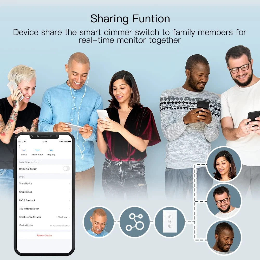 【0%-100% Triple Dimmer】Features three touch button for full-range dimming of two separate lights. This Wi-Fi double dimmer switch for led lights is compact and space-saving, perfect for both residential and commercial locations such as offices, showrooms,family rooms, home theaters, and more! Occupy only 1-gang for more controlin limited space setups,it cannot use in a 3 gang electrical box. 【Voice & App Control】Each touch button can be individually named and controlled by voice via Alexa and Google Home Assistant,just speak a simple voice like “Alexa, dimmer switch 1 to 60%". Compatible with Tuya Smart/Smart Life APP with no hub required. 【Luxury Glass Panel 】The panel is made of high quality tempered glass, making it extremely durable, moisture and water resistant. 【Timing Function】Create schedules to automatically turn the light on or off with preset brightness via Tuya/Smart Life APP app anytime, anywhere; dimming the lights with Alexa to save your eyes from harsh brightness or access the scene mode and timing mode via the app. 【Note】Neutral, Live, Load Wires are Required; Not 3 way smart switch; Cannot work with smart bulb and fans. Max. Load: 300W(INC)/110V;75W(LED/CFL)/110VProtocol: Wi-Fi 2.4GHz Product Description Product Specifications: Working Voltage: 90-250V AC 50/60Hz Max. Load: 600W(INC)/220V;300W(INC)/110V; 150W(LED/CFL)/220V;75W(LED/CFL)/110V Protocol: Wi-Fi 2.4GHz Working Frequency: 2.4G Wireless Distance(outdoor): 20-30M MOES Wi-Fi Smart Dimmer Light Switch Easily set the ambiance of any room and control your lights from anywhere with Moes Dimmer Switch.,it can easy replace the traditional switches directly,then you can start controlling your lights from your mobile phone by 'Smart Life' APP(ios or android).The smart dimmer light switch also a normal switch,simply touch the switch to dim or brighten your lights. Package listing Smart Dimmer Switch*1 User Manual*1 Screw*2 Hands-Free Voice Control After paired with Amazon Alexa or Google Assistant,you can turn your lights on/off or dim/brighten your lights just by your voice. Ultimate Beauty Ingenuity design Beauty appearance,Highly texture. Toughened Glass Surface Prevents the scratch from knives or something hard. Dampproof available for humid operation. Fire Retardant Strengthen protection for the short circuit of power lines. Group Control You can remotely Control Your House lights on smart phone. Touch Dimming Add schedule for flexible timer control of Your Lights with countdown featured.Timer your schedule for all three lights or set individual one for each lights without interference. Sharing device to family membeer. Neutral line required. No hub required. WIFI 2.4G (Not 5G)