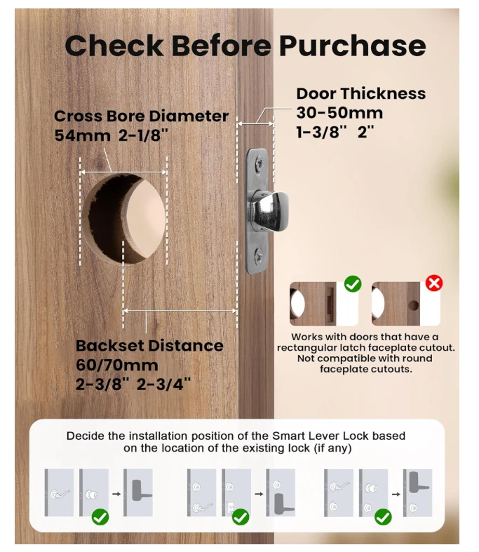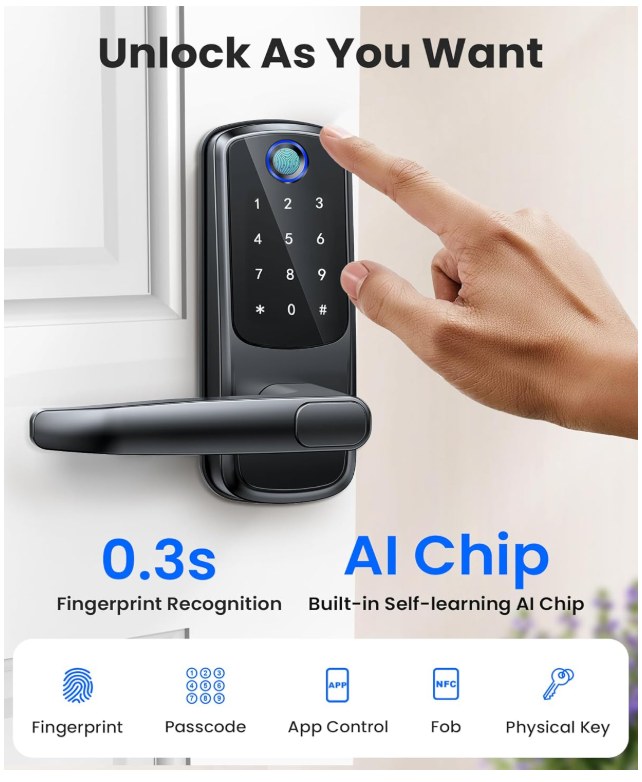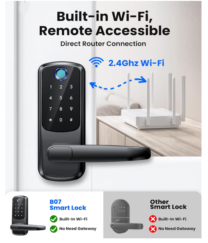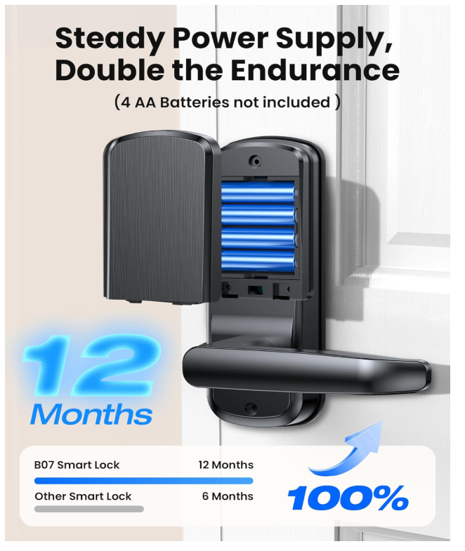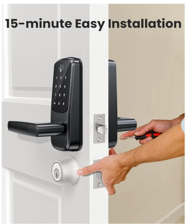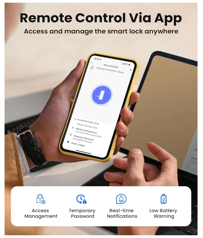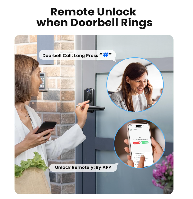 【Wi-Fi Connectivity & App Control】Enjoy seamless connectivity with real-time notifications, lock status updates, remote unlocking, member management, and temporary password configurations through the Smart Life app. This feature is perfect for individuals who value convenience and the ability to access their home remotely, whether they are at home, in the office, or on the move. 【5 Unlocking Methods】Experience versatility with a range of unlocking options including fingerprint recognition, password entry, app-based operation, fob access, and traditional key usage. This smart lock caters to various lifestyles, ensuring quick and easy access to your home. 【Doorbell Call and APP Remote Unlock】When the user triggers a doorbell call event, your mobile application will receive an instant notification. At this point, you can use the application to remotely unlock the door lock. Please note that this feature is limited to responding to doorbell calls and does not support active remote unlocking. 【12 Month Battery Life】Powered by 4 AA batteries (not included), this keyless entry door lock delivers up to 12 months of battery life. Monitor the remaining power effortlessly through the app, making it an excellent choice for those in need of a dependable and low-maintenance smart lock. 【Simple Installation & Setup】Complete the installation in under 15 minutes with comprehensive step-by-step instructions and app support. Its compatibility with most standard doors makes this smart lock an ideal choice for DIY aficionados or those new to smart home technology. 【Advanced Security Features】Featuring auto-lock functionality, an emergency charging port, and an IP54 waterproof rating, the SohoTeco smart lock offers robust security for your home. It is well-suited for all weather conditions, providing you with peace of mind.