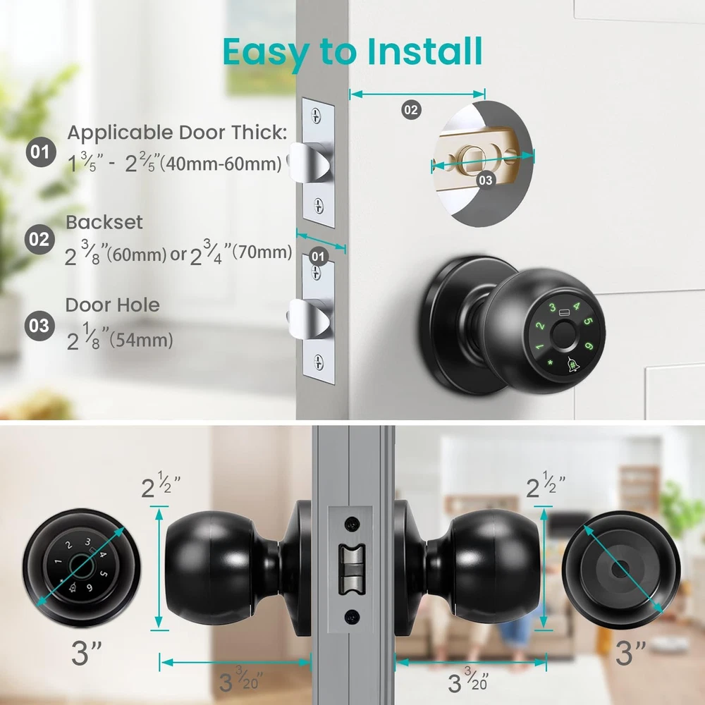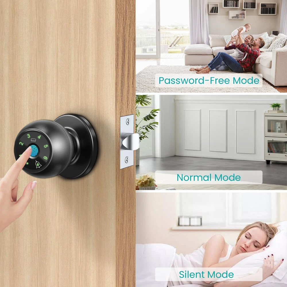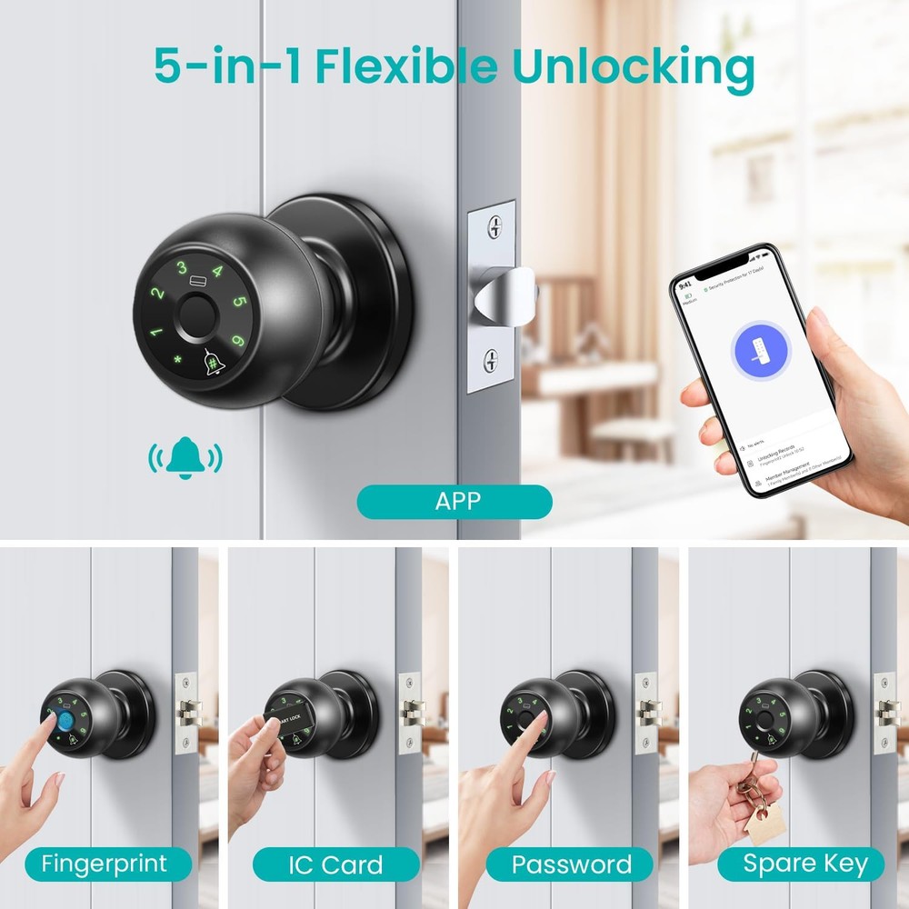 Smart WiFi Fingerprint Door Knob, Biometric Lock, 5 Unlock Ways: Black Product Details Brand: Kuelor Special Feature: Fingerprint, Anti-Peeping Password, Auto-Lock, One-Touch Lock, Back-Lit Keypad Lock Type: Biometric, Keypad Item dimensions L x W x H: 3.54 x 2.95 x 2.95 inches Material: Aluminum Recommended Uses For Product: Office, Bedroom, Apartment, Home Style: Wifi-APP Color: Black Number of Pieces: 1 Included Components: IC Card, Key Controller Type: Touch Control Method: App, Touch Connectivity Protocol: Wi-Fi Model Name: Smart Fingerprint Door Knob Manufacturer: Kuelor Part Number: Q7001 Item Weight: 1.52 pounds Product Dimensions: 3.54 x 2.95 x 2.95 inches Country of Origin: China Item model number: DK-Q7 Special Features: Fingerprint, Anti-Peeping Password, Auto-Lock, One-Touch Lock, Back-Lit Keypad Batteries Included?: No Batteries Required?: Yes Brand: Kuelor Special Feature: Fingerprint, Anti-Peeping Password, Auto-Lock, One-Touch Lock, Back-Lit Keypad Lock Type: Biometric, Keypad Item dimensions L x W x H: 3.54 x 2.95 x 2.95 inches Material: Aluminum [5-in-1 Smart Keyless Entry] This fingerprint door lock offers 5 unlock ways: fingerprint, password, IC card, APP, and mechanical key. Press the doorbell to unlock remotely via your phone (requires 2.4GHz Wi-Fi or mobile network). Smart door knob supports voice prompts in six languages, catering to diverse user needs [Emergency Power & Battery Efficiency] Powered by AAA batteries (not included), lasting 6–10 months. Features a low-battery warning and Type-C emergency port, ensuring you’re never locked out due to a dead battery. Reliable backup key ensures 24/7 accessibility [Fast & Secure Biometric Recognition] Advanced fingerprint sensor unlocks in just 0.5 seconds with a 99% recognition rate, supporting up to 100 fingerprints. Auto-lock secures your door 2 seconds after unlocking, preventing accidental entry and enhancing home security [3 Smart Modes] In normal mode, the door will automatically lock after unlocking. Password-free mode is a boon for busy moments, eliminating the need for frequent fingerprint and password entries. Silent mode ensures silent operation and is ideal for returning late at night without disturbing others [Easy Installation & Versatile Compatibility] Designed for standard US doors, this keyless entry door knob is simple to install with a screwdriver. Perfect for apartments, offices, homes, and rentals looking for enhanced security and smart technology