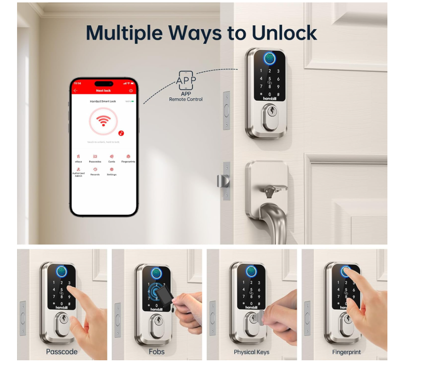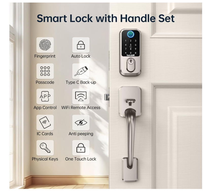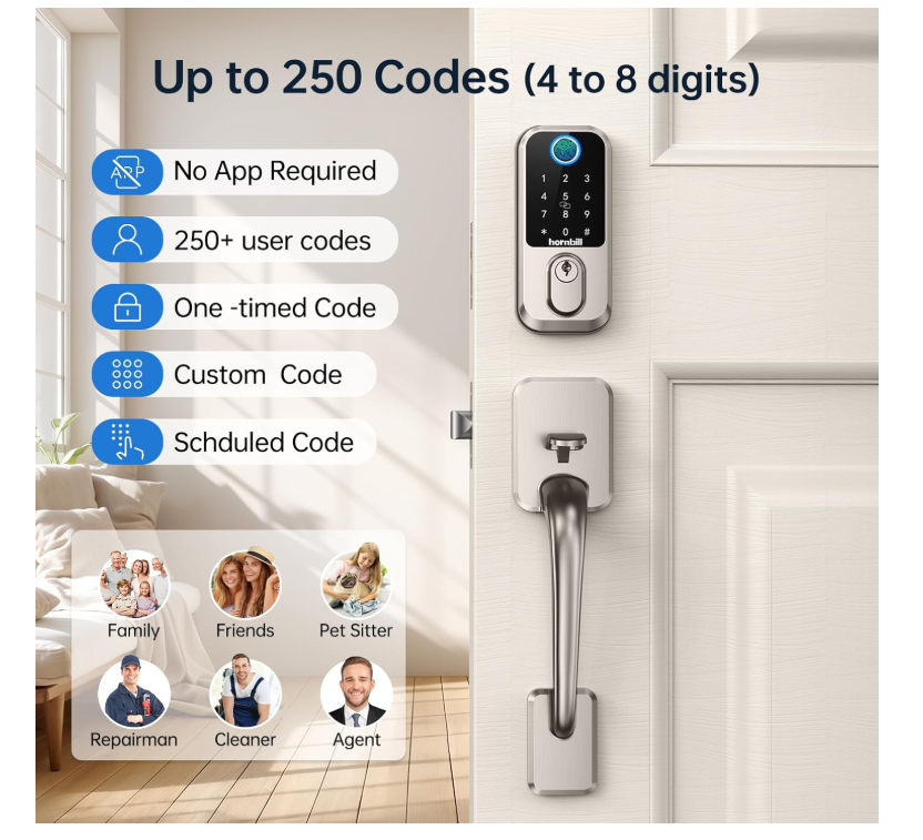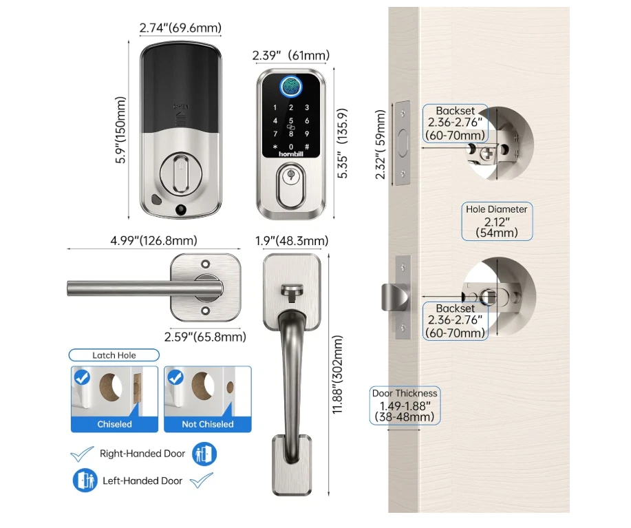 【Multiple Ways To Unlock】Hornbill smart door locks combines 10 unlock ways in one. Fingerprint/Smartphone APP control/Anti-peep Passcode/Fobs/Bluetooth/WiFi Remote Access/Alexa compatible, Voice Control/low battery alarm/sensitive touchscreen/Physical Key (included hornbill G2 Gateway,only works with 2.4GHZ ). 【No Charge Versatile APP】Just controll the lock by app without subscription. Along with 250+ multiple user codes that can be remotely generated and shared one-time, permanently, Timed, One-timed, Custom and Recurring Passcode. Share Ekey or code to friends, family members, visitors, flexible and safety. Up to 100 fingerprints and 1000 key fobs (package includes 2 IC cards) can be stored on this deadbolt smart lock. Perfect choice for Rental Apartment hosts to manage access for their guests easily. 【Advanced Security】 The smart lock for front door offers security features, including an anti-peeping password, the keypad deadbolt will alarm and lock for 5 consecutive incorrect passcode attempts, our smart locks feature various modes, including privacy mode, passage mode, silent mode, low battery alert, invalid password alert, and tamper alarm, enhancing both convenience and security. upgrade your home security with the Hornbill. 【Home Security & Build to Last】The keypad door lock with handle is made of aluminum alloy, strong and durable enough, IP63 waterproof, available temperature ranges from -25℃ to 70℃.waterproof. The door lock with code with 4AA Alkaline (not included) batteries life up to 6 months. A Backup USB-C Port for emergencies. Give your peace of mind. 【Easy Installation and Versatile Use】Our smart entry door lock set fits most US standard left and right-handed wooden doors with door thicknesses of 1.49" to 1.88" and a 60 mm/70 mm deadbolt depth requirement. With easy-to-follow user manual or video instructions and a screwdriver, installation is a breeze, saving you both time and money on locksmiths. Perfect for Rental hosts, property managers, new homeowners, and smart home enthusiasts. No extra drilling is necessary. 【Privacy/Auto Mode】When privacy mode is turned on, no user other than the administrator has permission to unlock from outdoor. Auto Locks will be activated after unlock (Set auto-lock time: 1-900s), no more worry forgetting to lock the door. 【Quality Assurance & Reliable After-Sales】30-day return, 1-year replacement, and lifetime technical support give you peace of mind. Our customer support team is always here to help you with any issues. If you have any questions about hornbill smart lock, pls don't hesitate to contact us.