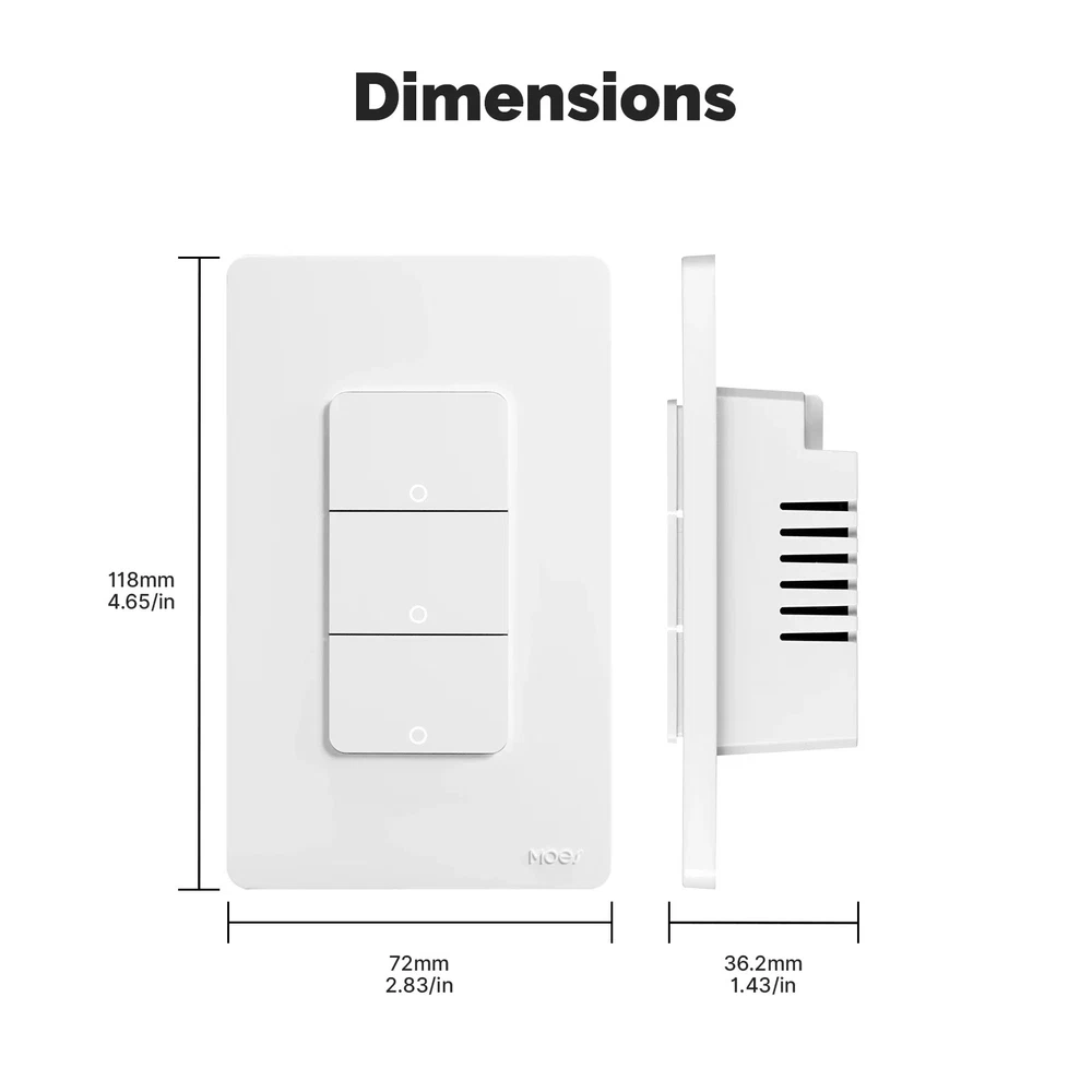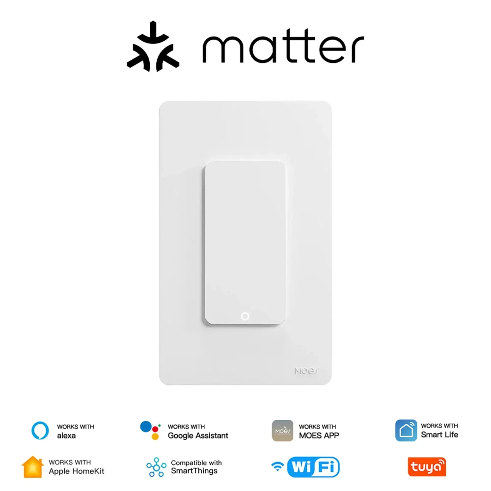 Tuya Matter WiFi Smart Light Button Switch App Control Neutral Wire Required Grounding Design Alexa Google Home Apple Home BY-MOES Packing List Smart Switch *1 Screws *2 Manual *1 Matter: Cross-Platform Connectivity Protocol Supports Multiple Platforms The Matter protocol integrates different smart home platforms into smart products that support the Matter protocol. This means that MOES's Matter smart switch can be controlled on multiple platforms and can be linked with devices on different platforms. Smart Linkage Between Multiple Platforms Timer & Countdown According to your schedule, set a personalized lighting time, no longer need to manually control the light, so that smart service life. Indicator Light Mode You can easily set the indicator light to indicate the switch position, display the on/off status or close it by MOES APP to meet your personalized needs. Relay Status Settings No more worries about the status after an unexpected power outage. Set the power-on status to on, off or power-off memory through the APP to ensure that every use meets your expectations. Better Grounding, Contributes to Electrical Safety The design of the iron plate is added in the middle of the switch frame to ensure the strength, and to ensure that the user's own metal panel and screws are better grounded to improve safety. Note: The switch is equipped with a normal panel. If you need a metal panel, please purchase it separately. Electricity Safety & Added Convenience The ground and neutral wires use the outgoing wire mode, which is convenient for wiring and improves the safety of switch wiring. High-quality Button Structure without Sticking The button structure of the old switch has been optimized and upgraded, which perfectly solves the problem that the button is easy to get stuck between the button and the button and affects the use experience. Adaptable for Star Ring Multiple-module Panel (US Version) The new switch supports the multiple module panels of the Star Ring series, which is more visually beautiful and harmonious. Dimensions Technical Specifications: Model: WS-B-US Voltage: 90-240V AC, 50/60Hz Max. Current: 10A/Gang; Total 10A Wireless Protocol: Matter WiFi Frequency Band:2.412-2.484GHz Maximum Radio Transmit Power: <+16dBm