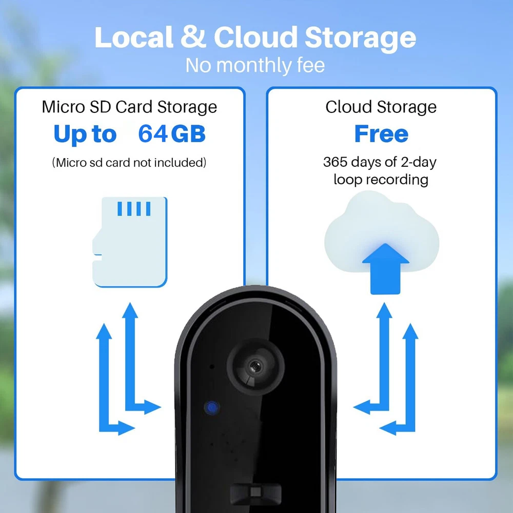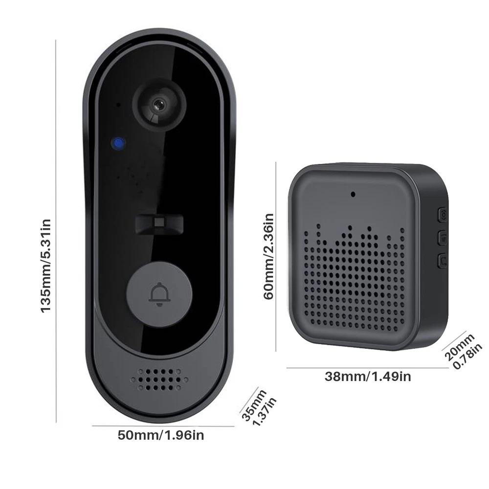 Description: 1. Material: High-quality ABS material, light and durable, long service life 2. Lens: This video doorbell has an ultra-high-definition camera lens and a 125° wide-angle lens to protect your home security around the clock. 3. Video call: Built-in two-way microphone, when someone rings the doorbell, a push notification will be sent to the mobile phone, and the owner can enter the mobile phone call interface. You can check and talk to the visitor anytime and anywhere. 4. Volume adjustment: This doorbell has a strong and stable signal, easy pairing, and a transmission distance of up to 50 meters. The volume and ringtone can be adjusted according to your preferences. 5. Infrared night vision: Built-in high-quality IR LED lamp beads and light sensor, the picture is clear at night. When the ambient light drops to 2 Lux, it can also automatically switch from day mode to night mode. 6. Battery use: The doorbell has a built-in 1000 mAh rechargeable lithium battery. It can be used continuously for 2 to 4 months after being fully charged. There is no need for frequent charging. The bell is powered by USB and has a long battery life. 7. Storage method: This doorbell supports TF card + cloud storage. When a visitor presses the doorbell, it can capture the visitor's picture and save the record to the APP, so that the mobile APP can view past pictures at any time, which is safer and more secure. 8. Network connection: Supports 2.4GHz network connection and "Tuya" APP connection. The mobile phone can quickly wake up the device within 1 second remotely, making the work more stable. 9. Portable installation: 2 installation methods, can be pasted with adhesive or drilled, convenient and worry-free Specification: Name: Smart Wireless Video Doorbell Security Camera Infrared Intercom Doorbell Waterproof Doorbell Colour: Black Working temperature: -10°-60° Viewing angle: 125° Main control processor: Broadcom/BK7252 Power input: DC5V/2A Power supply mode: 100-240v, 50-60Hz Battery used: Built-in rechargeable lithium battery Battery capacity: 1000 mAh Working time: 2-4 months Night vision type: infrared night vision Storage function: TF card (maximum support 64GB -not included) + cloud storage (free forever) WiFi connection: only supports WIFI IEEE802 11b/g/n (2.4GHz), RF 433mhz Voice system: two-way intercom/mobile phone remote prompt viewing System support: Android 4.3 or iOS 9.0 or above Use APP: Tuya APP Music type: 20 pieces Recording distance: about 5m Waterproof grade: IP65 Radiator size: 13.5*3.5*2cm Receiver size: 6*3.8*2cm Gross weight of a set: 210g Package list: 1 * Receiver 1 * Transmitter 1 * Data cable 1 * Installation accessories 1 * Instruction manual