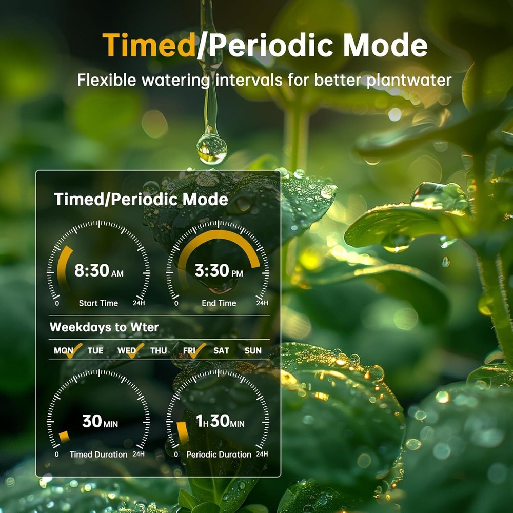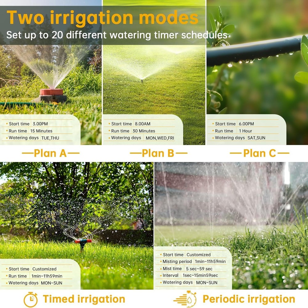 Upgraded Brass Swivel Inlet - TRJZWA smart wifi water timer is newly upgraded to pure brass swivel inlet and metal threads, compared with the traditional plastic threads, brass threads are harder and more durable, and engage with the faucet to a higher degree, making it more anti-leakage, and not easy to deform and wear out in long-term use, which is a good helper for your long-term garden gardening Two Irrigation Modes - The wifi sprinkler timer has a timed irrigation mode and a periodic irrigation mode, you can set up to 20 different irrigation schedules and customize the right watering for different areas such as lawn and flower beds. Wifi water timer allows the hose timer to water at a specific time, and you can customize the start time, duration for different watering needs. Once the watering schedule is set, the irrigation timer will take over control of your lawn and garden APP Remote Control - Using the Smart Life APP to associate the wifi water timer with a wifi gateway (2.4 GHz WiFi only), after which you can create irrigation schedules remotely from anywhere at any time.The WiFi Sprinkler Timer supports longer-range connectivity, provides a more stable signal, and with just one WiFi hub, you can expand up to 32 WiFi timers to create a smart irrigation system for your garden. You can add family members to the app to share home irrigation management Smart Voice Control - TRJZWA smart wifi water timer is compatible with Alexa and Google Assistant, when you are too busy with other tasks to operate your phone, you can enjoy the convenience of controlling your watering system with your voice by turning the watering timer on or off with a simple voice command! Rain Delay & Manual Watering - The WiFi Hose Timer will automatically skip watering on rainy or snowy days based on the latest local weather forecast. You can also manually turn on a 24, 48 or 72 hour rain delay,it can save up to 50% on your water bill. In manual mode, you can water as often as you need to, and you can customize watering times from 1 minute to 23 hours and 59 minutes for flexibility and convenience without interrupting your preset watering schedule Remarks - 1.To control the timer through the app when you are out, please turn off WiFi and Bluetooth, and use 4G or 5G signal for operation.2.Do not take the hub and timer away from you, and make sure that the hub is always plugged into the power supply.3.Please use brand new batteries, don't mix the old and the new batteries.4.Please watch the operation video on the product page or scan the QR code in the instruction manual to watch the timer's specific operation video Product Description 产品描述 Next page