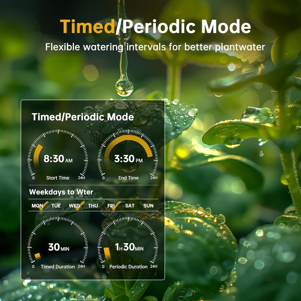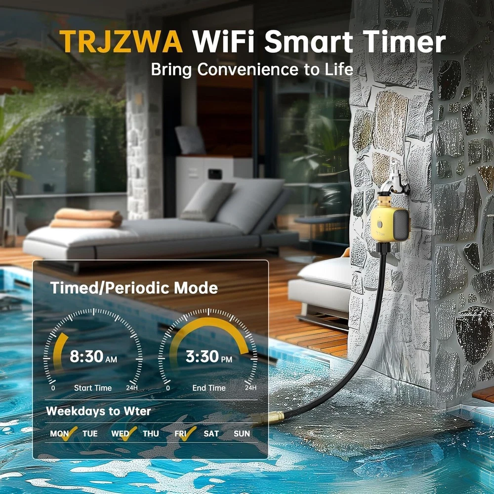 Upgraded Brass Swivel Inlet - TRJZWA smart wifi water timer is newly upgraded to pure brass swivel inlet and metal threads, compared with the traditional plastic threads, brass threads are harder and more durable, and engage with the faucet to a higher degree, making it more anti-leakage, and not easy to deform and wear out in long-term use, which is a good helper for your long-term garden gardening Two Irrigation Modes - The wifi sprinkler timer has a timed irrigation mode and a periodic irrigation mode, you can set up to 20 different irrigation schedules and customize the right watering for different areas such as lawn and flower beds. Wifi water timer allows the hose timer to water at a specific time, and you can customize the start time, duration for different watering needs. Once the watering schedule is set, the irrigation timer will take over control of your lawn and garden APP Remote Control - Using the Smart Life APP to associate the wifi water timer with a wifi gateway (2.4 GHz WiFi only), after which you can create irrigation schedules remotely from anywhere at any time.The WiFi Sprinkler Timer supports longer-range connectivity, provides a more stable signal, and with just one WiFi hub, you can expand up to 32 WiFi timers to create a smart irrigation system for your garden. You can add family members to the app to share home irrigation management Smart Voice Control - TRJZWA smart wifi water timer is compatible with Alexa and Google Assistant, when you are too busy with other tasks to operate your phone, you can enjoy the convenience of controlling your watering system with your voice by turning the watering timer on or off with a simple voice command! Rain Delay & Manual Watering - The WiFi Hose Timer will automatically skip watering on rainy or snowy days based on the latest local weather forecast. You can also manually turn on a 24, 48 or 72 hour rain delay,it can save up to 50% on your water bill. In manual mode, you can water as often as you need to, and you can customize watering times from 1 minute to 23 hours and 59 minutes for flexibility and convenience without interrupting your preset watering schedule Remarks - 1.To control the timer through the app when you are out, please turn off WiFi and Bluetooth, and use 4G or 5G signal for operation.2.Do not take the hub and timer away from you, and make sure that the hub is always plugged into the power supply.3.Please use brand new batteries, don't mix the old and the new batteries.4.Please watch the operation video on the product page or scan the QR code in the instruction manual to watch the timer's specific operation video Product Description 产品描述