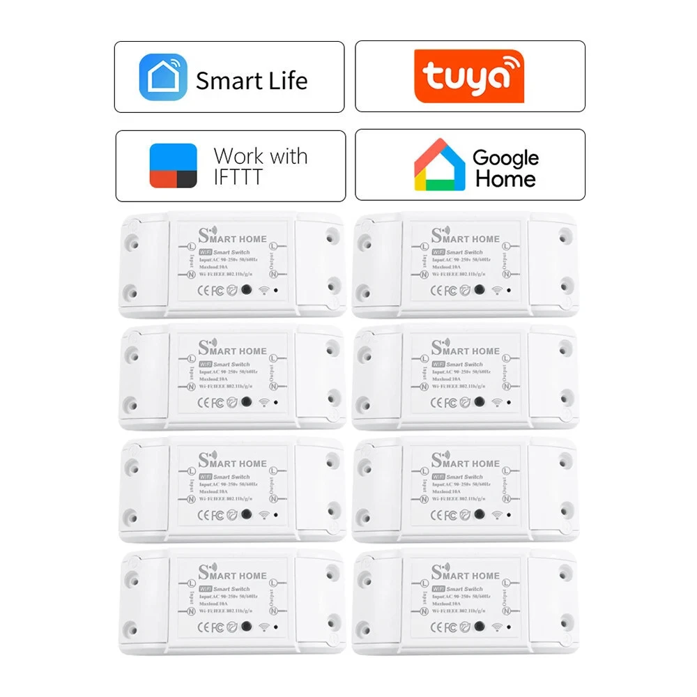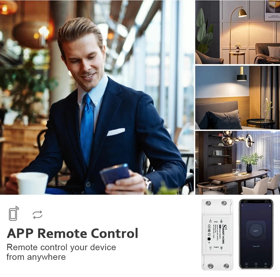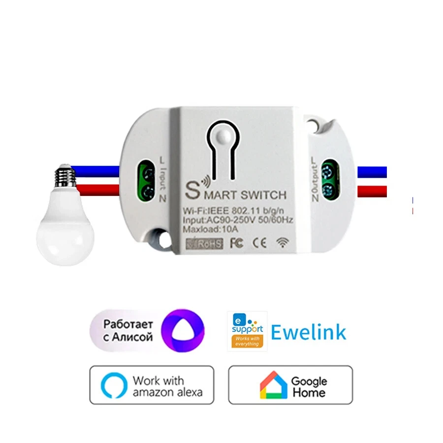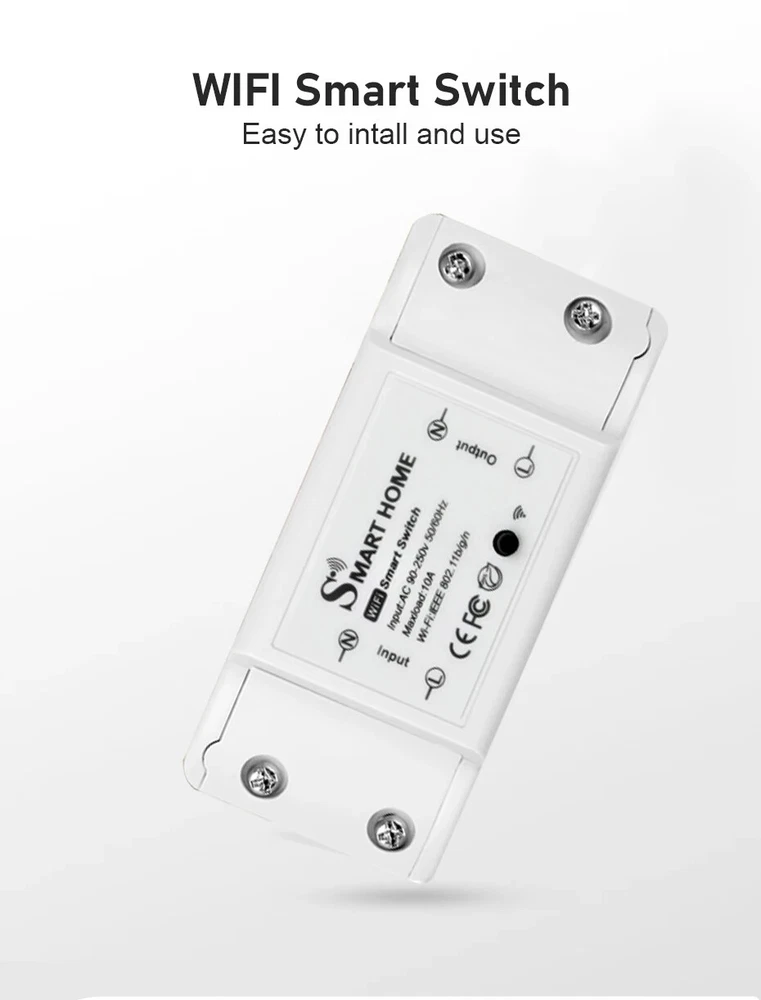Tuya DIY smart switch introduction DIY WiFi Smart Light Switch Universal Breaker Timer Wireless Remote Control Works with Alexa Google Home Smart Home Automation Here we have TWO versions of Smart Switch Breaker, TUYA Version and eWelink Version. And the details for each version list here: TUYA Version: Main Features: I.Voice control:once you have this switch,you can connect it with Amazon Alexa(Amazon echo/dot/tap) or Google Assistant for voice control. II.Wi-Fi Remote Control:You can use "Smart Life" APP in your smart phone to control the switch wirelessly with Wi-Fi or 4G network.no hub required. III.Timing Function:Take full control of your home or office lights thanks to schedule timer that will allow you to plan the exact time to turn lights and appliances on/off automatically IV.Share Device:This samrt switch can have several control sites shared by different family members.one mobile phone can control many switches also. V.Add More Features with IFTTT:'If this,then that' is a free web-based service the let you do amazing things with your light switch, turn lamps,fans or other electronics on before you back home or off, Supporting IFTTT as well. Product information Current: 10A Material: Plastic Switch Type: Remote control Power Supply: Neutral+Live wire Rated Voltage: AC 90V-250V / 50-60Hz Rated Power: 1800W Wireless standard: IEEE802.11b/G/N Safety: WEP/WPA-PSK/WPA2-PSK Radio protocol: Wi-Fi 2.4GHz b/g/n Static power loss: Less than or equal to 0.3 WEncryption: WEP/AES/TKIP Max Load: 10A Voice control Voice control to Switch on or off the lights Share Control Timer and Schedule set up timing schedules to save the trouble of overcooking the dish single / repeat /countdown / loop timer APP remote control Connection Diagram eWeLink DIY smart switch introduction Model Number: eWelink smart switches State of Assembly: Ready-to-Go name: mini WiFi ewelink remote smart switch voltage: AC 90-250V 50/60Hz rated current: 10A resistive load: 2200W(AC220V) inductive load: 500W(AC220V) capacitive load: 200W(AC220V) incandescent lamp: 2200W energy-saving lamp: 300W LED lamp: 300W WiFi standard: IEEE 802.11 b/g/n 2.4GHz APP: ewelink APP material: ABS V0 How to connect Tuya/Smart Life APP