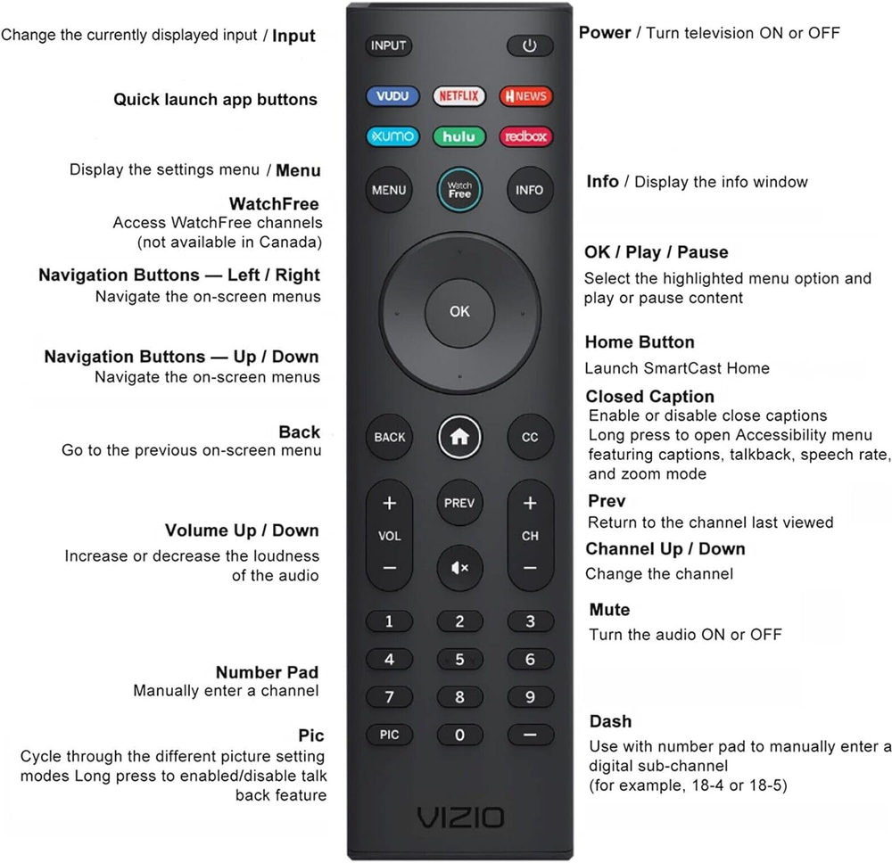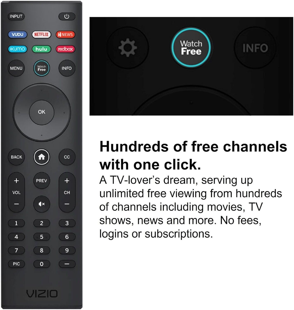 Quick launch app buttons - Stream from some of your favorite apps like Netflix, Hulu, VUDU and more. WatchFree button - Enjoy hundreds of free streaming channels with just one click for movies, TV shows, and sports. No fees, subscriptions, or logins. VIZIO SmartCast Home - With a dedicated SmartCast home button on the remote, get immediate access to all your favorite apps and free channels. Ergonomic Design - With a rounded back design and conveniently located buttons for the most common commands, the VIZIO Universal SmartCast TV Remote fits naturally in your hand and helps to navigate quickly. Brand new VIZIO XRT140RL Universal Remote Control for Vizio TVs Vizio Smart TVs, Perfect original New Condition. Quick launch App channels: VUDU NETFLIX HNEWS XUMO hulu redbox WatchFree button - Enjoy hundreds of free streaming channels with just one click for movies, TV shows, and sports. No fees, subscriptions, or logins. VIZIO SmartCast Home - With a dedicated SmartCast home button on the remote, get immediate access to all your favorite apps and free channels. Ergonomic Design - With a rounded back design and conveniently located buttons for the most common commands, the VIZIO Universal SmartCast TV Remote fits naturally in your hand and helps to navigate quickly. Preprogrammed--No need any setup or programming. Putting batteries in and Works. Batteries and User Manual are not included. Fast Customer questions responsed within 1 business day. 30-Day Hassle-Free Return Policy. Compatible With TV Models: (May not the complete List) Universal Vizio TV Remote Control for ALL Vizio TVs