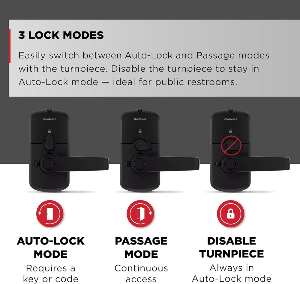 CONVENIENT KEYLESS ENTRY: Keypad entry makes coming and going secure and simple. Easily lock and unlock your door without having to take out your keys 3-YEAR BATTERY LIFE: Battery lasts at least 3 years, giving you more time in between battery replacements. Uses 1x 9V battery, battery included HIGH TRAFFIC DURABILITY: Lock tested to 500,000 cycles to ensure lasting, reliable performance in high-traffic entryways like bathrooms, storage sheds, and small businesses EASY CODE MANAGEMENT: Customize up to 30 user codes, 1 one-time user code and 1 programming code that lets you edit or delete user codes whenever you need to 3 LOCK MODES: Easily switch between Auto-Lock and Passage modes with the turnpiece. Disable the turnpiece to stay in Auto-Lock mode — ideal for public restrooms The Kwikset SmartCode 955 Pembroke Light Commercial Electronic Lever offers convenient keyless entry, making coming and going secure and simple. With a 3-year battery life and a tested durability of 500,000 cycles, it delivers reliable performance in high-traffic entryways. Choose from three lock modes to suit your needs: Auto-Lock requires a key or code for entry, Passage allows continuous access, and disabling the turnpiece keeps the lever in Auto-Lock mode. It’s a simple solution for secure and versatile access control.