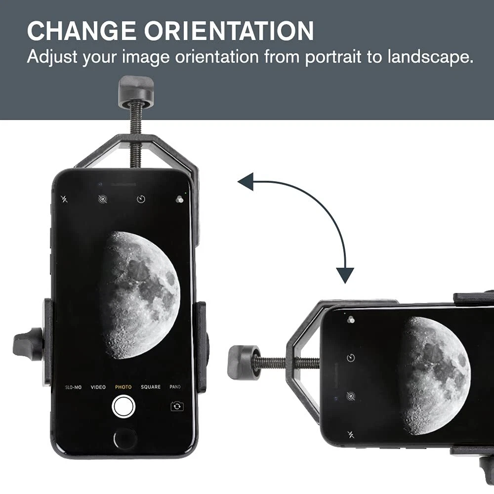 The Smartphone Adapter is a great first step into the world of astroimaging or digiscoping. The universal adapter enables you to capture sharp, detailed images and video in seconds. The adapter fits any eyepiece from 29mm to 45mm in diameter including telescopes with 1.25-inch eyepieces, spotting scopes, monoculars, and binoculars. It is fully adjustable and can fit any smartphone—usually with the case still on. If multiple people want to capture a shot through your optic, the smartphone adapter’s simple clamp makes it easy to remove one device and replace it with another in seconds. The Smartphone Adapter is a great choice for star parties and group bird walks where everyone wants their own shot of the action. From start to finish, the process only takes about 30 seconds. If you switch phones, eyepieces, or optical instruments, you will need only slight adjustments to re-center the camera over the new eyepiece. You can also switch your image from portrait to landscape simply by turning the padded eyepiece clamp and realigning your phone with the eyepiece. The adapter is small and compact for easy transport. CAPTURE IMAGES AND VIDEO THROUGH YOUR SCOPE: The Smartphone Adapter connects your phone to your telescope, spotting scope, binocular, monocular & microscope You can capture amazing images & video through the eyepiece to share with friends. UNVERSAL SMARTPHONE ADAPTER: Works with a wide range of smartphones, including all the latest devices from Samsung Galaxy, Google Pixel, and Apple iPhone. COMPATIBLE EYEPIECES: This adapter fits almost any eyepiece from 29 millimeters to 45 millimeters in diameter, including most 1.25-inch telescope eyepieces. It does not work with riflescopes. EASY TO USE: Simply place your phone in the adapter, center your phone’s camera over the eyepiece, and use the knobs to secure the adapter in place. SOLID CONSTRUCTION: The adapter's durable, metal body stands up to rigorous use in the field and harsh weather conditions. UNBEATABLE WARRANTY & SUPPORT: Buy with confidence from , a leading telescope brand in California since 1960. Purchasing from an Authorized Dealer on Amazon gives you a 2-Year US Warranty and unlimited support from our team of US-based experts.