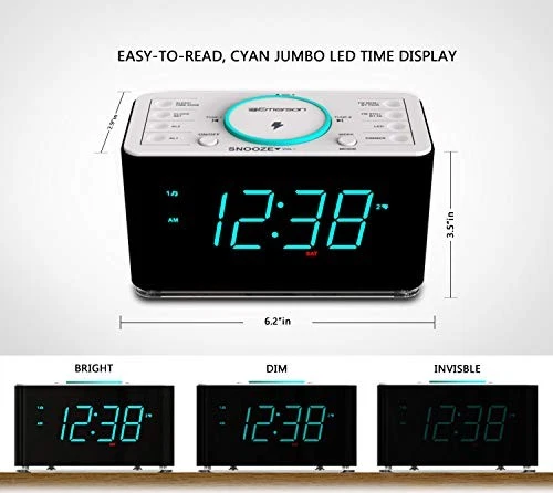 Return Policy Fast Delivery Trusted seller ER100401 Smartset 15Watt Ultra Fast Wireless Charging Dual Alarm Clock Radio with Bluetooth Speaker, USB Charger, Cyan LED Night Light and 1.4" Display Product Description Effortless Charging Experience: Convenient Wireless Mobile Charger Atop the Clock – Just Drop and Charge. Enhanced Charging Convenience: Equipped with an Additional USB Port for Charging Mobiles, Tablets, and More. Seamless Connectivity with Bluetooth V5.1 Technology: Simplified Pairing for a Smooth Experience. Precision Timekeeping: Automatic Self-Adjustment to the Right Year, Month, Date, Day, and Time upon Plug-In and After Power Interruptions. Product Dimensions: 6.22” W x 2.95” D x 3.54” H Shipping Returns Payment Shipping Shipping is FREE to all addresses other than APO/PO boxes in the lower 48 states. All our stock ships from US-based warehouses. Shipped via USPS or UPS (depending on location and package weight) Unless stated otherwise, all orders will ship within 24-72 hours of your payment being processed. Check our feedback to see the great reviews of FAST shipping we offer. Returns Seller does not accept returns Payment We currently accept payment via eBay managed payments only. Once payment is cleared, we will dispatch your shipment within 1-3 business days. Please refer to the "Shipping" tab for more information regarding shipping speed to your destination.