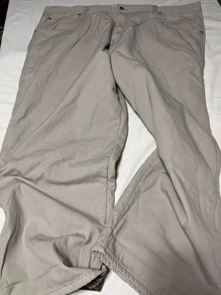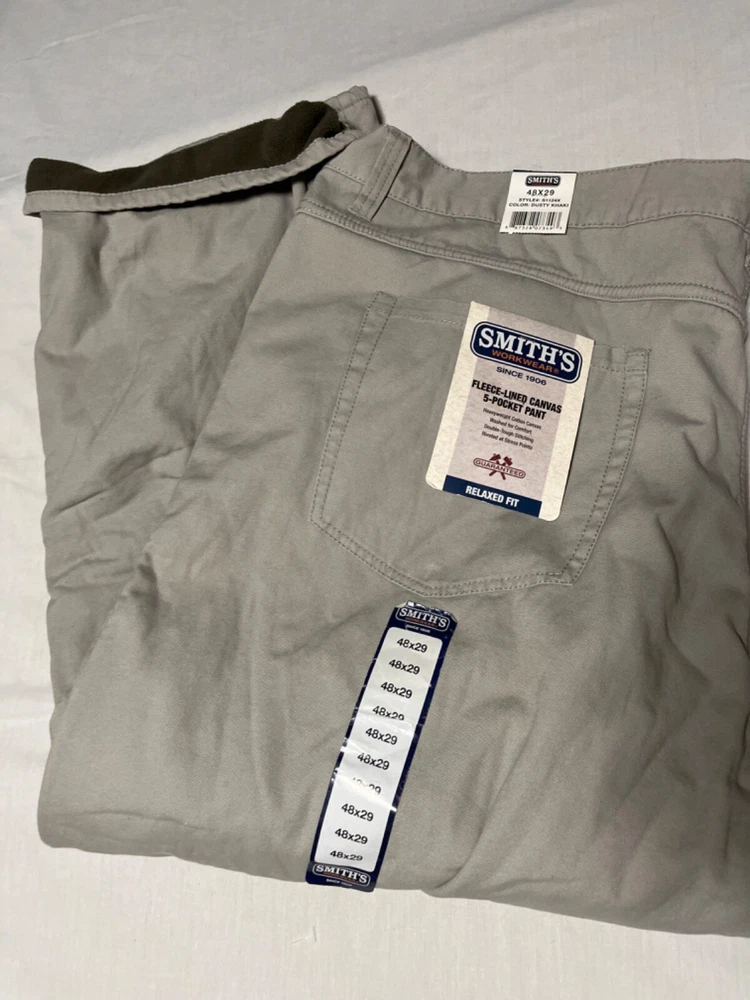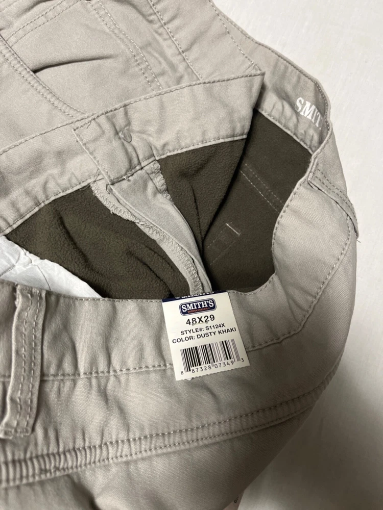 Crafted for comfort and durability, these Smiths Workwear fleece-lined pants are a must-have for the big and tall man's wardrobe. In a versatile beige, these pants are a size 48 with a 29-inch inseam, offering a relaxed fit that doesn't compromise on style. The cozy fleece lining ensures warmth and ease of movement, making them ideal for both work and casual wear. Designed with functionality in mind, they boast a sturdy construction reminiscent of the Smith brand's reputation for quality. Embrace practicality without sacrificing an ounce of style.