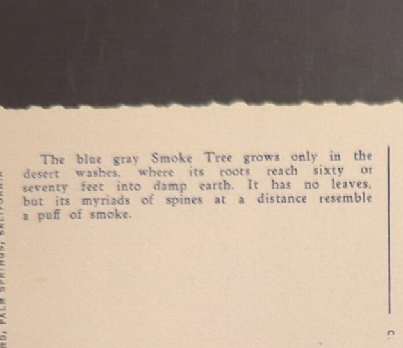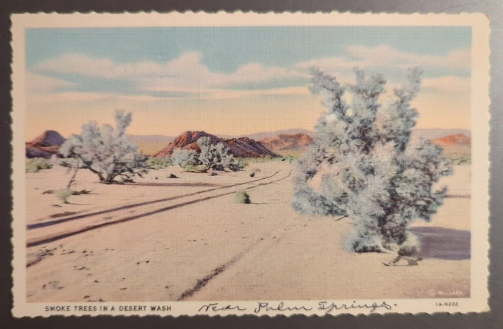 Vintage Linen Postcard Smoke Trees in a Desert Wash California c1940 Unposted. There may be wear on the edges or a bent or torn corner, staining or writing on the card, creasing, or the card may have a cancellation mark. Most of the postcards I sell are 50 to 100+ years old and will never be perfect. Please examine the photos carefully for condition information - there is some writing on the bottom edge of the white border. All postcards with a value of less than $20 are shipped via eBay Standard Envelope with a 2 mm postcard sleeve and a piece of cardstock on either side, taped closed with masking tape and placed in a heavy cardboard mailer. Postcards with a value of more than $20 are sent Ground Advantage in a 2 mm postcard sleeve, sandwiched between cardboard and shipped in a padded polybag. Both methods are provided with tracking.