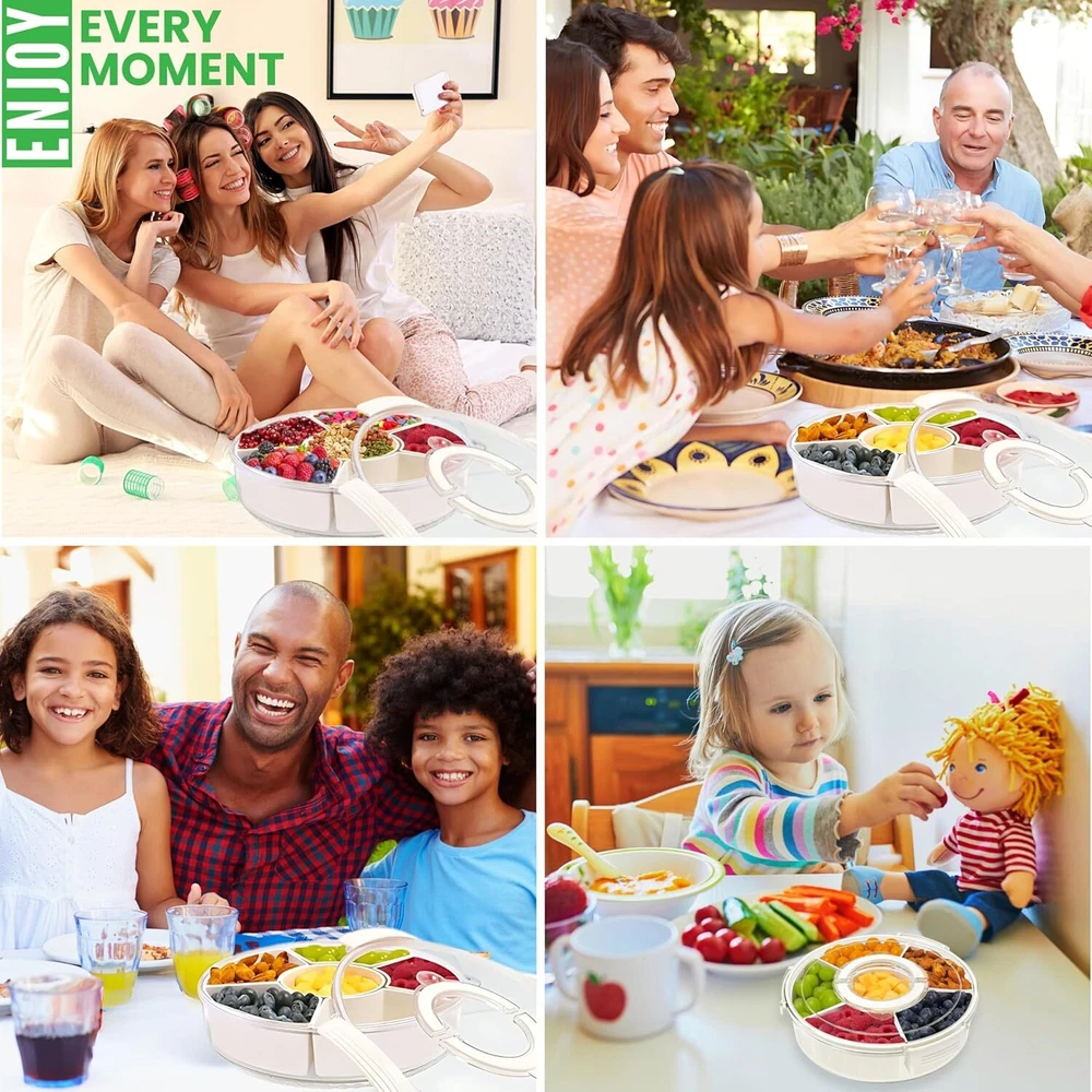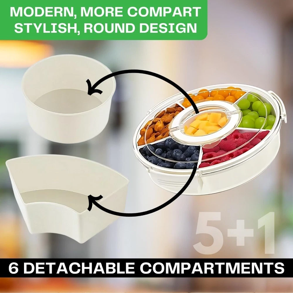 Snack Box Container, Divided Serving Tray with Lid, 6 Compartments Clear Product Details Brand: TRU TRADEHUB Color: Clear Material: Plastic Product Dimensions: 12"L x 12"W x 3.1"H Shape: Round INTRODUCING OUR VERSATILE TRAY! This All-In-One Solution Is Perfect For Many Uses, Whether You're Organizing Condiment Containers, Veggie Tray, Packing Snack Boxes For Kids, or Setting up a Taco Bar. GREAT SIZE, It Features 12.59x12.59x3.15 Inches, it is a Large Bento Box Perfect as a Snack Containers. Great To Organize Fruits, Veggies, Nuts, And More. An Option For Charcuterie Box Or Snackle Box Our Tray Features 6 Individual Removable Compartments, Once Removed, It Becomes More Functional, Perfect as a Taco Bar Serving Set, Party Platter, Snack Containers For Adults, Or Lake Day Essentials. Traveling? It is Portable with handles is perfect as an adult lunchable containers, picnic accessory, snack spinner, toddler snack container, snack organizer, veggie tray, or tackle box for snacks. EASY TO CLEAN and Built For Convenience And Durability, This Charcuterie Board With Lid Doubles as a Travel Snack Container and Perfect as a beach essentials. Do Not Use On Microwave Or Dishwasher