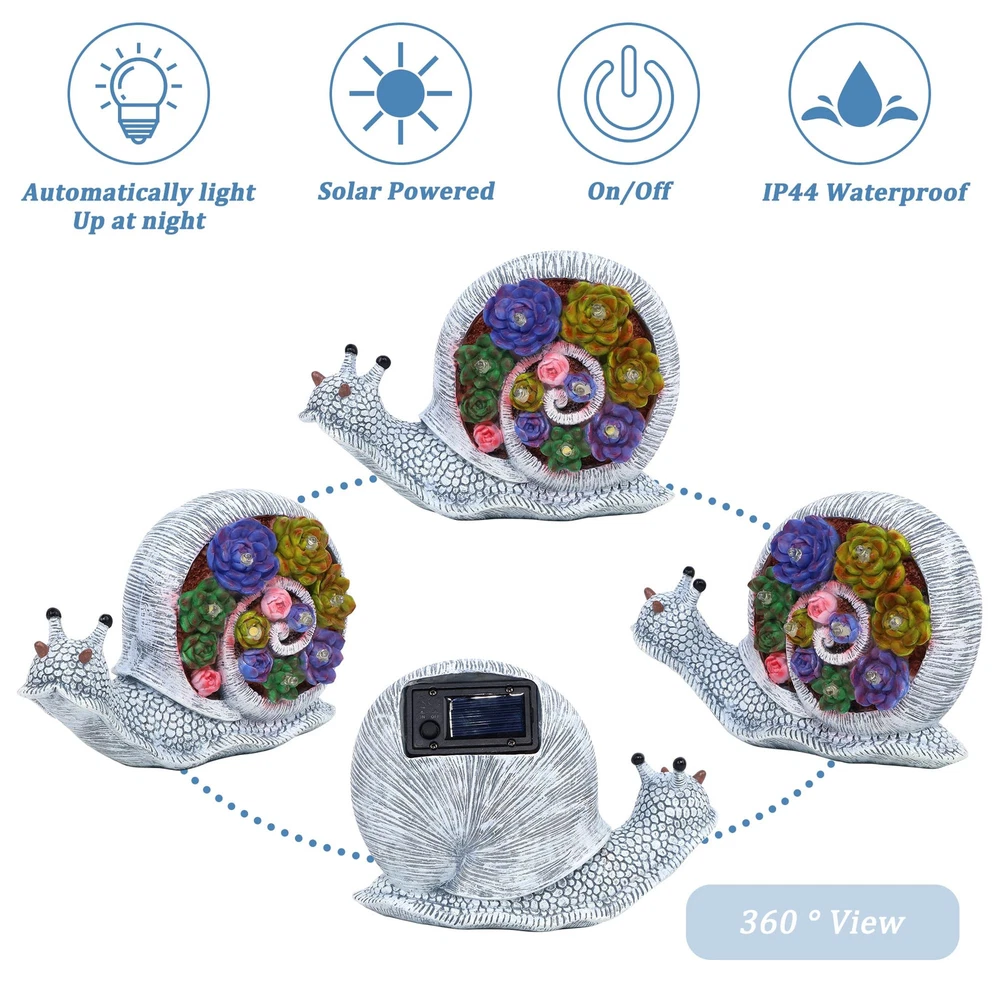 High Quality: This garden figurine is made of high quality resin material, finished with a UV resistant coating, dust-proof and waterproof, can withstand rain, snow or scorching sun without cracking, fading or rusting. Snail Garden Decor: This snail resin statue is hand-painted with very nice details and good workmanship, esigned with 8 succulents of 3 different colors, the center of the flower is decorated with warm white LED lights, emit a warm glow at night, add more charm to your outdoor garden decor. Solar Snail Statue: This snail garden figurine is easy to use, simply turn on the power button before first use, leave it in the on position in the daytime, keep the solar panel under the sun to ensure sufficient sunlight, it will charge during the daylight hours and automatically light up at night for 8-10 hours. Warm Gifts: This snail figurine is 5 x 4.1 x 10.2 inch and 3.1 x 2.8 x 4.7 inch, suitable to use for garden, trees, flowers, fence, flowerbed, walkway decor. This solar garden statue is fun for gift giving for your family and friends as birthdays gifts, Mother’s Day gifts, holiday gifts, weddings gifts or housewarming gifts. Great Decor: This charming snail resin outdoor statue is perfect as solar garden yard decorations, brighten up your backyard, lawn, pond, pool, window sills, countertops, entryways, it is a wonderful addition to your lawn and home decor.