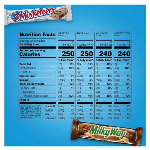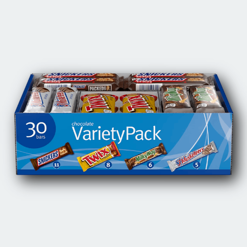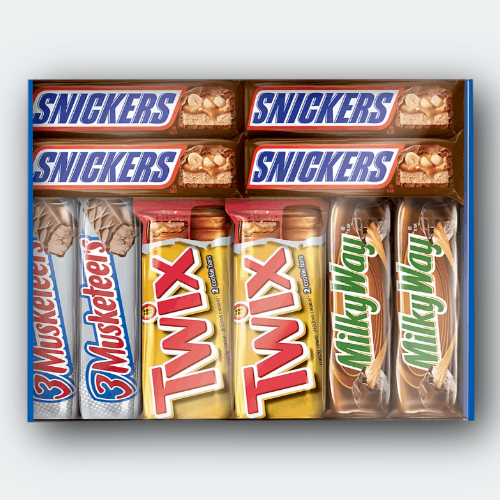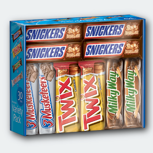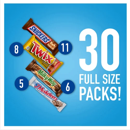 Snickers, Twix & More - Full-Size Variety Pack (30 ct) Chocolate Bliss! Indulge in the irresistible delight of the Snickers, Twix & More Full-Size Chocolate Candy Bars Variety Pack (30 ct) —a perfect treat for any occasion! This assortment combines the world’s most beloved chocolate bars into one package, offering a heavenly blend of creamy nougat, smooth caramel, crunchy cookies, and rich milk chocolate. Inside, you'll find iconic favorites like Snickers , known for its satisfying crunch of peanuts and caramel, and Twix , the king of cookie-caramel-chocolate perfection. These classics, which have been bringing joy for decades, share the spotlight with other mouthwatering selections that promise to satisfy every chocolate craving. Here’s a quick dive into their history: Snickers : Launched by Mars, Inc. in 1930, Snickers became a snack-time revolution, combining wholesome ingredients to create the ultimate hunger-taming bar. Twix : Making its debut in 1967, this caramel cookie bar found instant fame for its irresistible combination of textures. Whether you're hosting a party, curating the ultimate Halloween haul, or simply stocking up on midday pick-me-ups, this 30-count full-size candy bar pack delivers in every way. Perfectly portioned and individually wrapped for freshness, these treats are ideal for sharing—or keeping all to yourself. Don’t miss out—buy now and bring home this variety pack of chocolate perfection. Limited quantities available, so stock up today and turn any moment into a sweet escape!