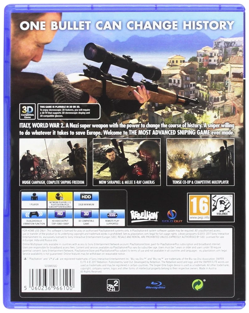 Further Details Title: Sniper Elite 4 (PS4) PlayStation 4 Standard edition Condition: New Description: PRODUCT DESCRIPTION WELCOME TO ITALY, 1943 Discover ultimate sniping freedom in the largest and most advanced World War 2 shooter ever built. Experience tactical third person combat, slick stealth gameplay and epic longshots as you liberate Italy from the grip of Fascism. With an expansive campaign for 1-2 players and dedicated co-op and competitive multiplayer modes, Sniper Elite 4 aims to deliver a definitive tactical third person shooter with unrivalled sniping freedom across environments many times the size of those seen in Sniper Elite 3. Running in native 1080p on both PlayStation 4 and Xbox One, Sniper Elite 4 is the first game in the series built from the ground-up for next generation hardware and the first game to offer true next-generation sniping. Set in the aftermath of its award-winning predecessor, Sniper Elite 4 continues the series' World War Two heritage by transporting players across the beautiful Italian peninsula, from sun-drenched Mediterranean coastal towns, to colossal Nazi megastructures, ancient forests and hidden mountain monasteries. Covert agent and elite marksman Karl Fairburn must fight alongside the brave men and women of the Italian Resistance to help free their country from the yoke of Fascism, and defeat a terrifying new threat with the potential to halt the Allied fightback in Europe before it's even begun. If his mission fails, there will be no Operation Overlord, no D-Day landings, and no Victory in Europe. Thrilling tactical third person combat: As deadly from distance as you are up close, adapt seamlessly to any combat situation and take the fight to Nazi forces with an impressive arsenal of iconic World War 2 sniper rifles, sub machine guns, heavy weapons, traps and explosives. Award-winning sniping: Experience genre-defining rifle ballistics where every shot counts and where snipers must take account of wind, gravity, even heart rate to land satisfying shots over hundreds of meters. A truly expansive campaign: Encounter hours of gripping gameplay in each huge campaign level with hundreds of enemies, deadly vehicles and high-ranking Nazi officials to hunt down. Forge your own path to your objectives, find your own sniper nests, discover secret side missions, scour for intel, collectibles and more! Slick new traversals and stealth takedowns: Climb, hang, shimmy, leap and clamber your way across the game's vast environments to get the drop on enemies and deliver killing blows from behind cover, over ledges and more! Gaming's most advanced kill cameras: Sniper Elite's acclaimed X-ray Kill Camera shows the impact of your most impressive longshots, melee attacks and explosive trap kills on enemy bodies in bone-cracking detail. Deep sniping customisation: Perfect your combat effectiveness by upgrading your own abilities via the skill tree, and tweaking key weapon traits such as scope magnification, muzzle velocity, stability and others. Rewarding, tactical co-op: Play the entire campaign in co-op for 2 players, or jump into dedicated co-op game modes for up to 4 players. Tense competitive multiplayer: Ratchet up the tension and take Sniper Elite's trademark sharpshooting into unique adversarial play for up to 12 players in 7 modes across 6 custom-designed maps. BOX CONTAINS BD-ROM Type: Games Platform: Sony Playstation 4 Genre: PlayStation 4 Sub-Genre: PlayStation 4, Games Publisher: Sold Out Sales and Marketing Certificate: PEGI 16 Language: English MPN: 217900 Release Date: 02/14/2017 Release Year: 2017 Missing Information? Please contact us if any details are missing and where possible we will add the information to our listing.