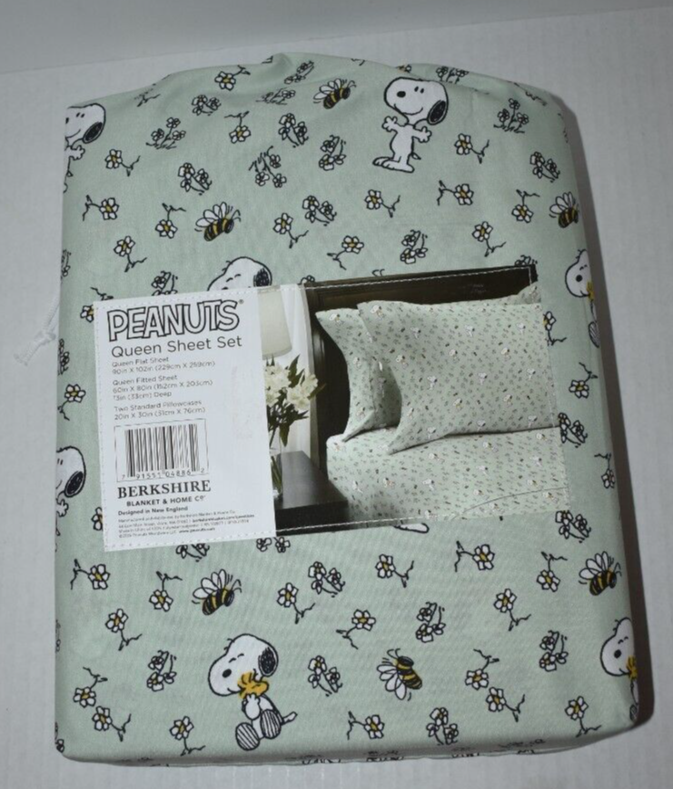 Peanuts Snoopy, Bee's, and Daisies Pattern Queen Size Sheet Set Green sheets with a Snoopy, Woodstrock, Bee's, and Daisies pattern Includes: 1 Flat Sheet - 90" by 102" 1 Fitted Sheet - 60" by 80" 2 Pillow Cases - 20" by 30" Made of 100% Polyester New in package Customer satisfaction is my # 1 Priority!! Please contact me if you are not satisfied with any aspect of your purchase before leaving any feedback. S5