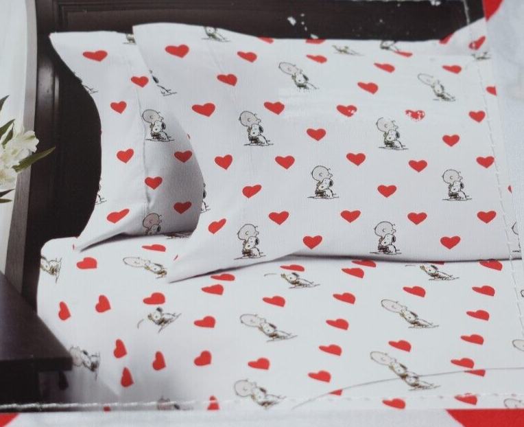 Peanuts Snoopy Hugging Charlie Brown and Red Hearts Pattern Full Size Sheet Set White sheets with a Snoopy Hugging Charlie Brown and red hearts pattern Includes: 1 Flat Sheet - 81" by 96" 1 Fitted Sheet - 54" by 75" 2 Pillow Cases - 20" by 30" Made of 100% Polyester New in package Customer satisfaction is my # 1 Priority!! Please contact me if you are not satisfied with any aspect of your purchase before leaving any feedback. S5