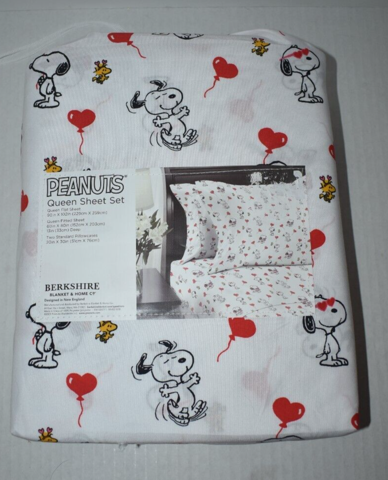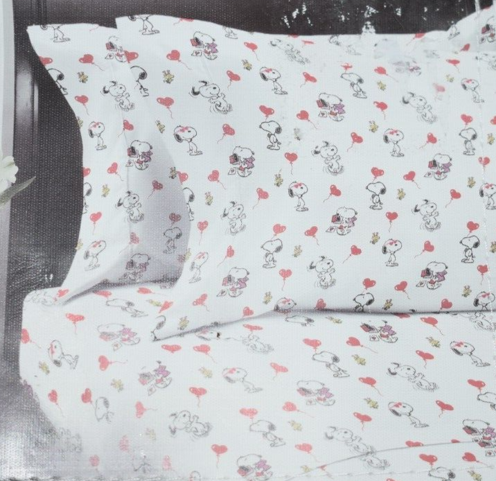 Peanuts Snoopy and Heart Balloons Valentine Pattern Queen Size Sheet Set White sheets with a Snoopy, Woodstrock, and heart balloons pattern Includes: 1 Flat Sheet - 90" by 102" 1 Fitted Sheet - 60" by 80" 2 Pillow Cases - 20" by 30" Made of 100% Polyester New in package Customer satisfaction is my # 1 Priority!! Please contact me if you are not satisfied with any aspect of your purchase before leaving any feedback. S5