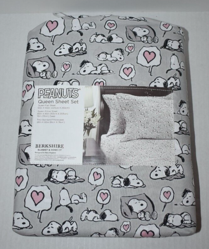 Peanuts Gray Snoopy Dreaming of Hearts Valentine Pattern Queen Size Sheet Set Gray sheets with a Snoopy sleeping dreaming of hearts print Includes: 1 Flat Sheet - 90" by 102" 1 Fitted Sheet - 60" by 80" 2 Pillow Cases - 20" by 30" Made of 100% Polyester New in package Customer satisfaction is my # 1 Priority!! Please contact me if you are not satisfied with any aspect of your purchase before leaving any feedback. S5