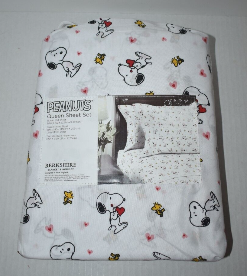 Peanuts Snoopy and Woodstock Valentine Hearts Pattern Queen Size Sheet Set White sheets with a Snoopy, Woodstrock, and hearts Includes: 1 Flat Sheet - 90" by 102" 1 Fitted Sheet - 60" by 80" 2 Pillow Cases - 20" by 30" Made of 100% Polyester New in package Customer satisfaction is my # 1 Priority!! Please contact me if you are not satisfied with any aspect of your purchase before leaving any feedback. S5